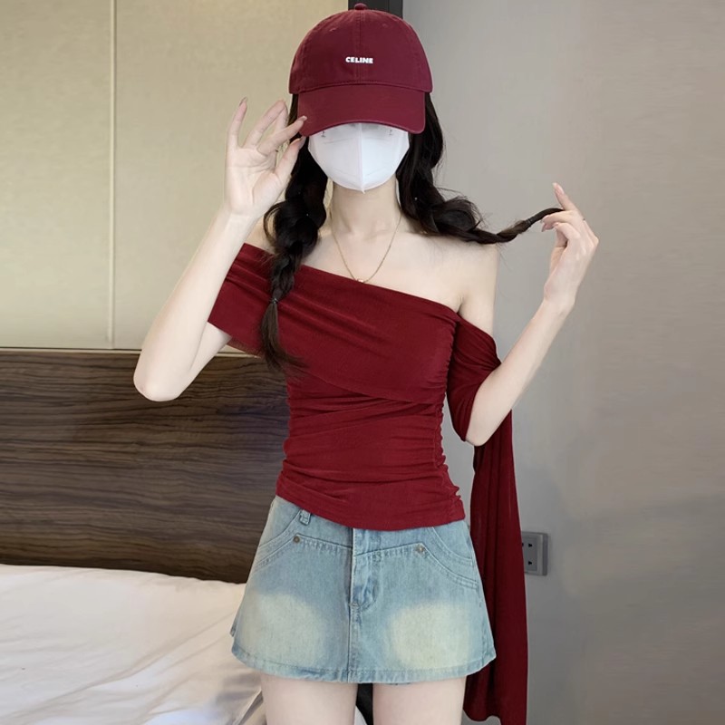 핫걸 원숄더 리본 반팔 티셔츠 여성 디자인 슬림핏 이너웨어 2025년 여름 새로운 유니크 탑스토어 가기