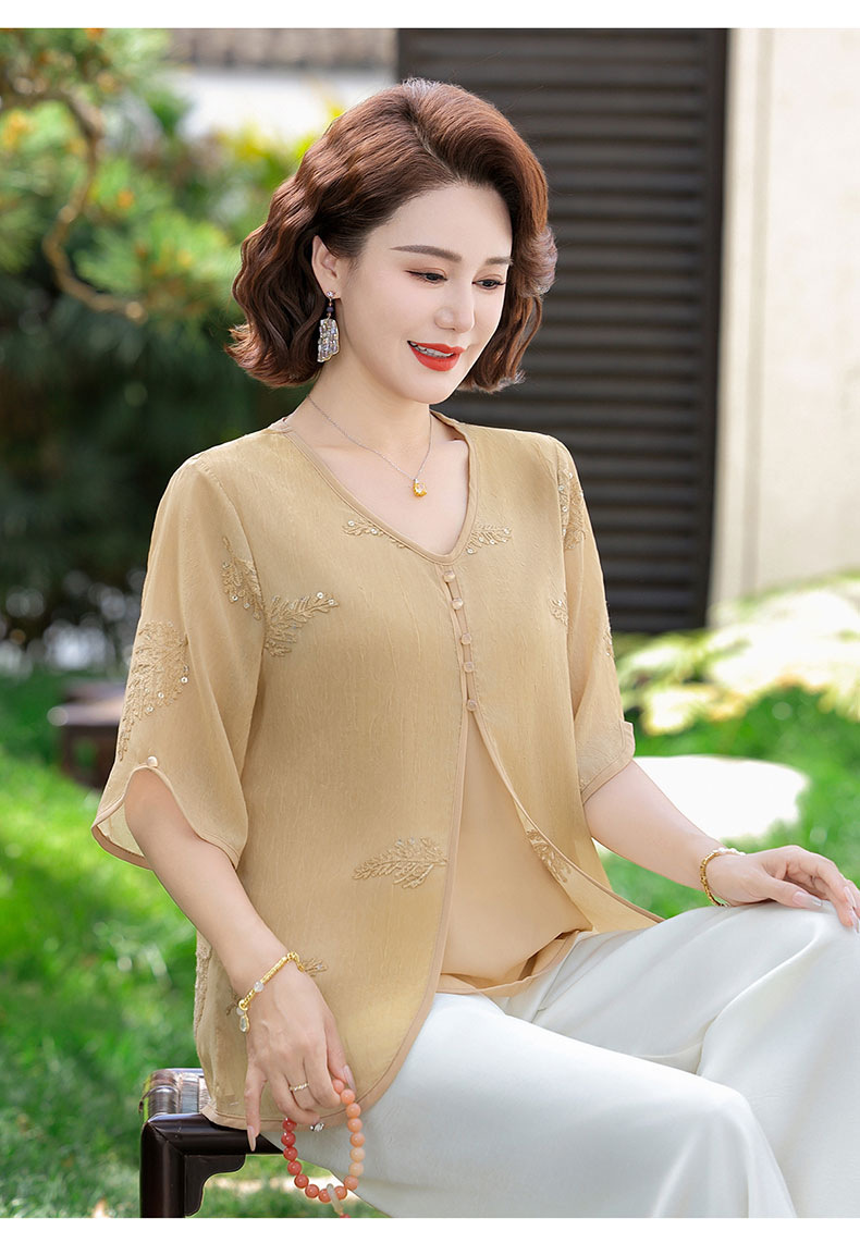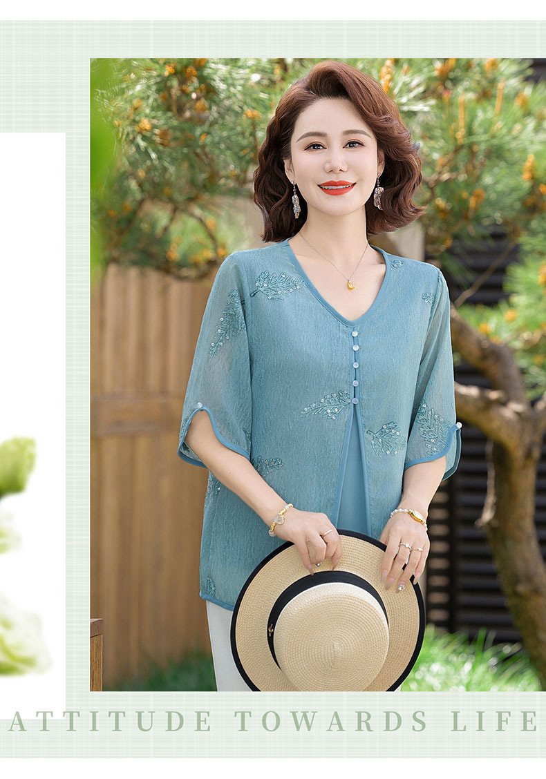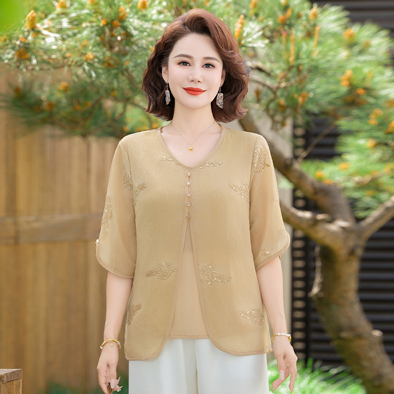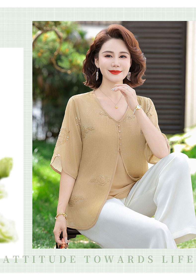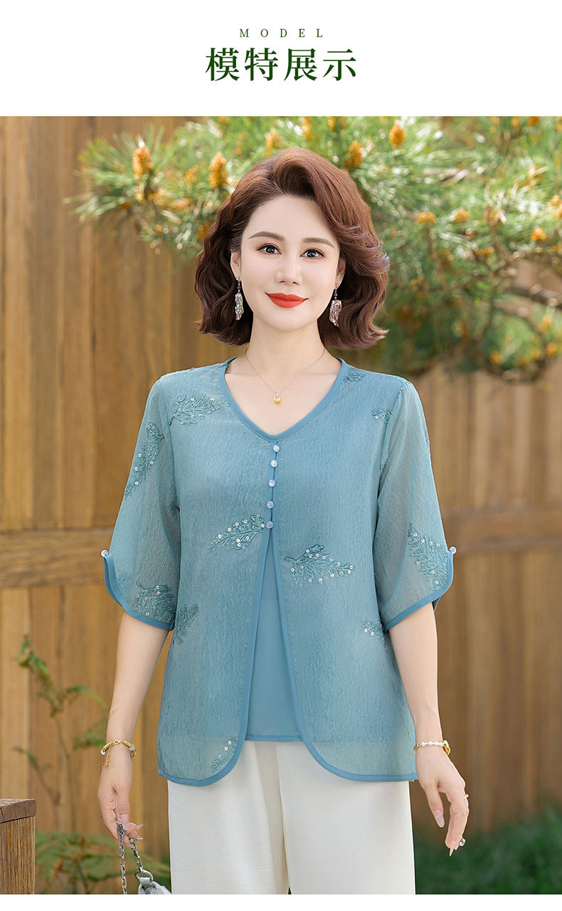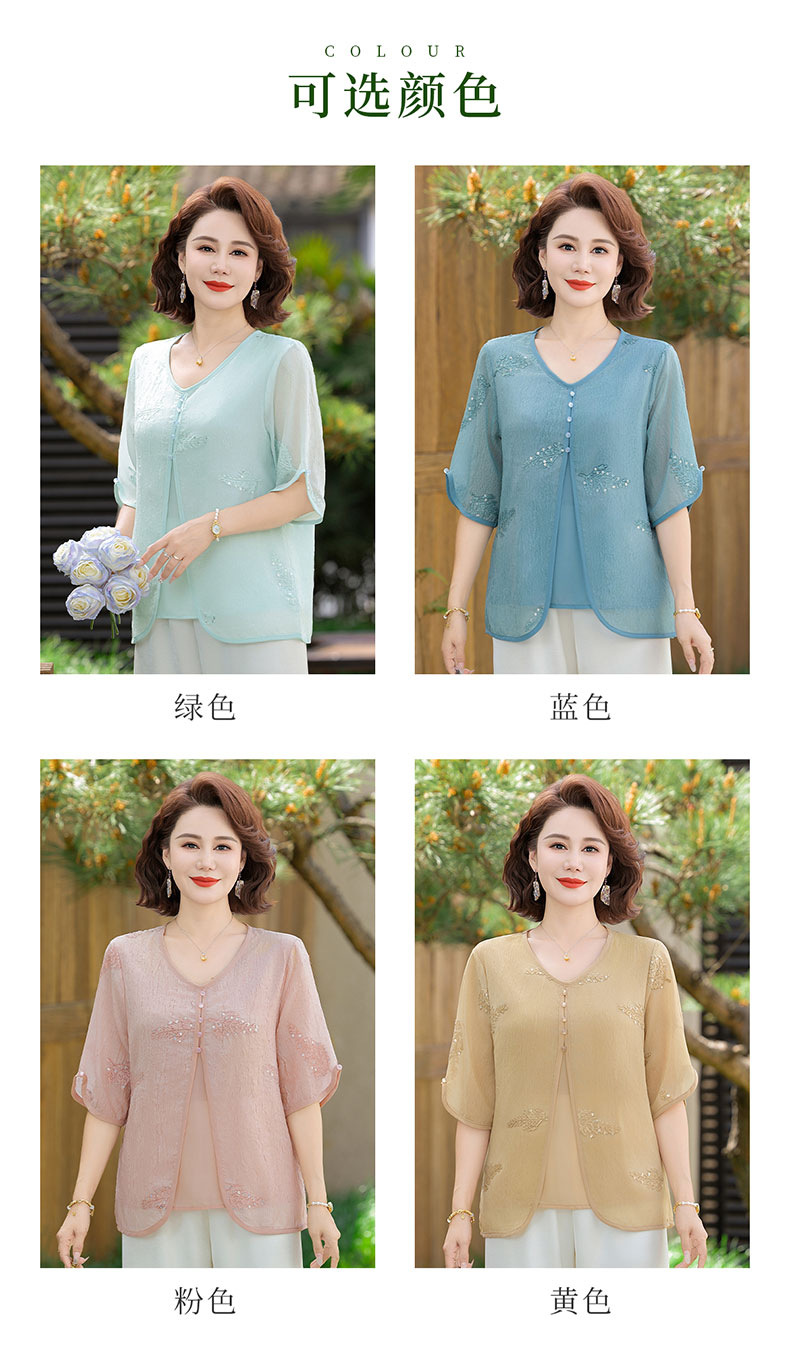 도매 엄마 여름 가짜 투피스 쉬폰 셔츠, 고급스럽고 새로운 스타일의 셔츠, 중년 및 노년 여성 티셔츠 상의스토어 가기