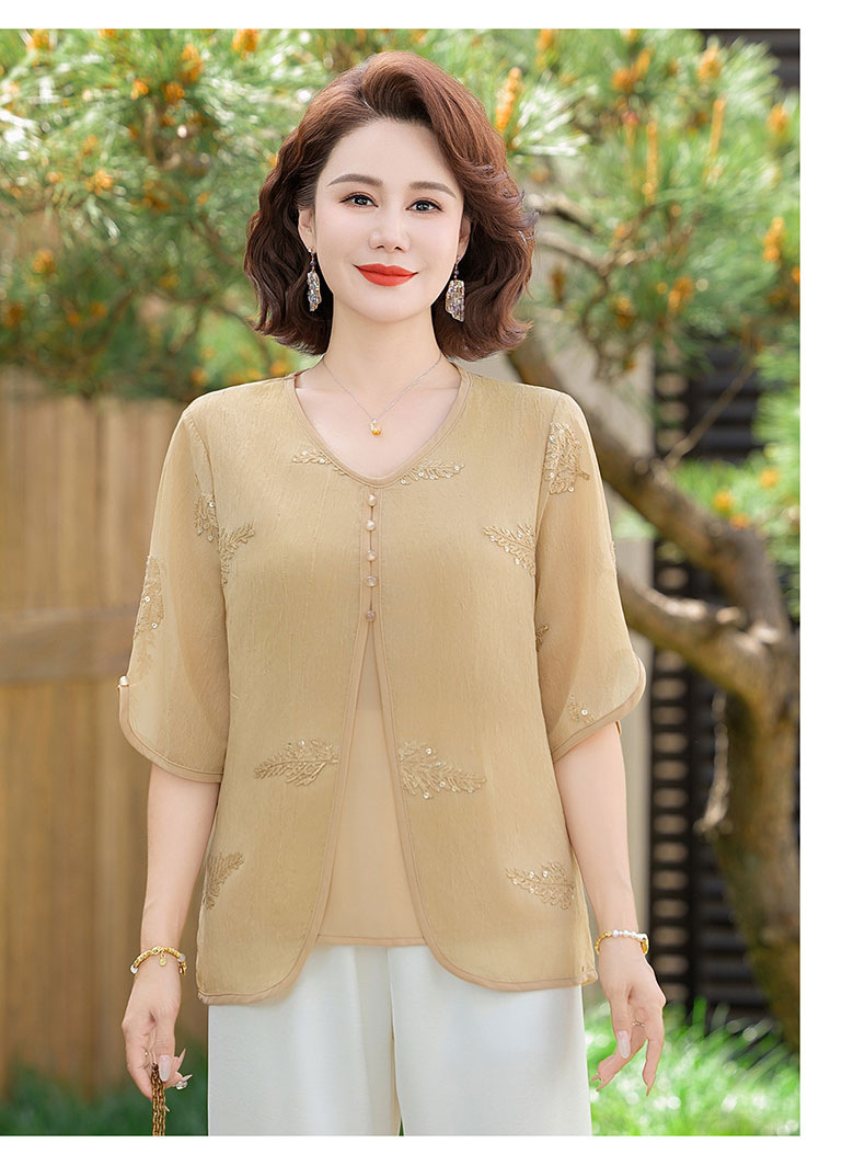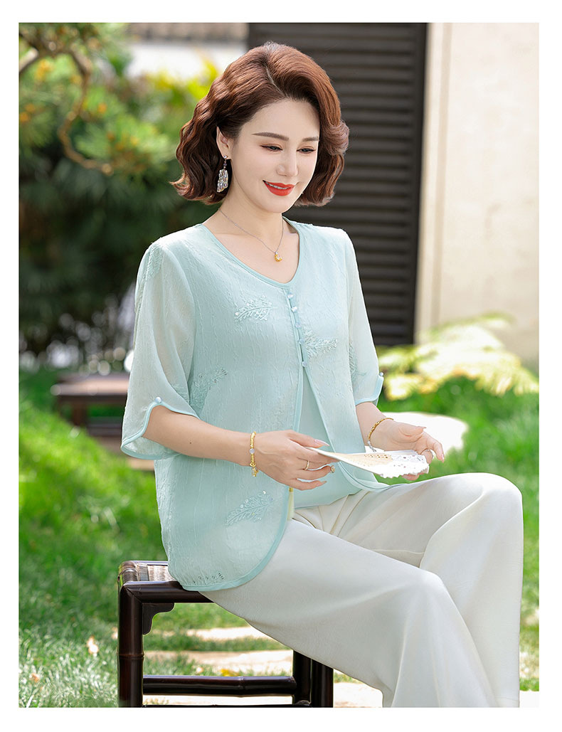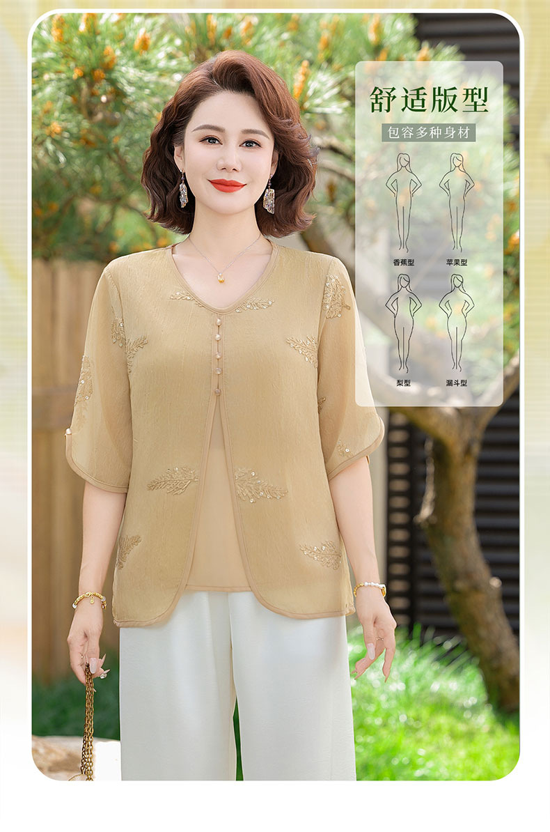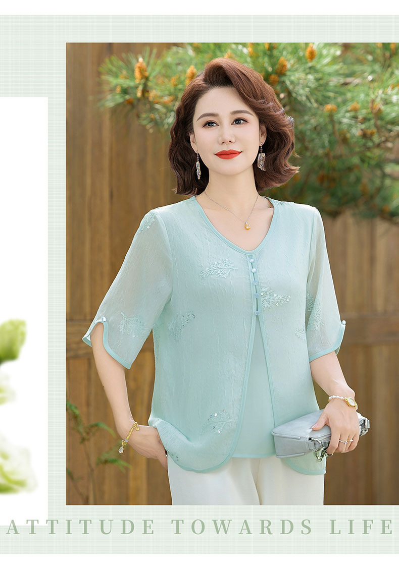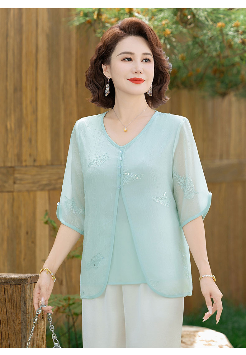 도매 엄마 여름 가짜 투피스 쉬폰 셔츠, 고급스럽고 새로운 스타일의 셔츠, 중년 및 노년 여성 티셔츠 상의스토어 가기