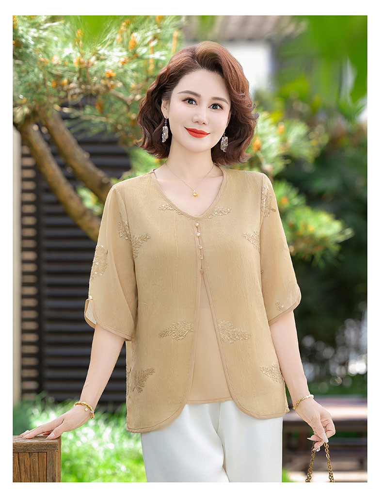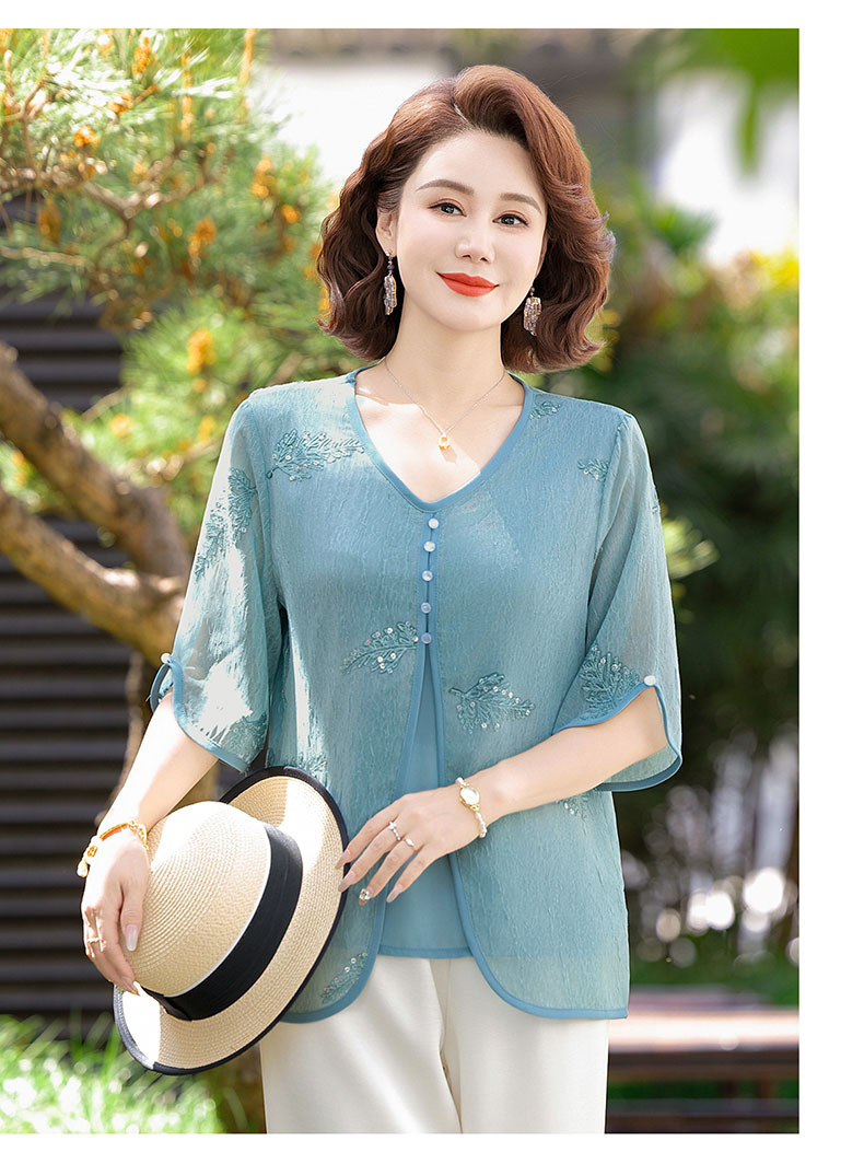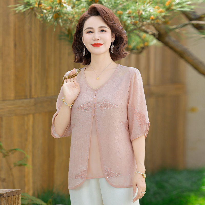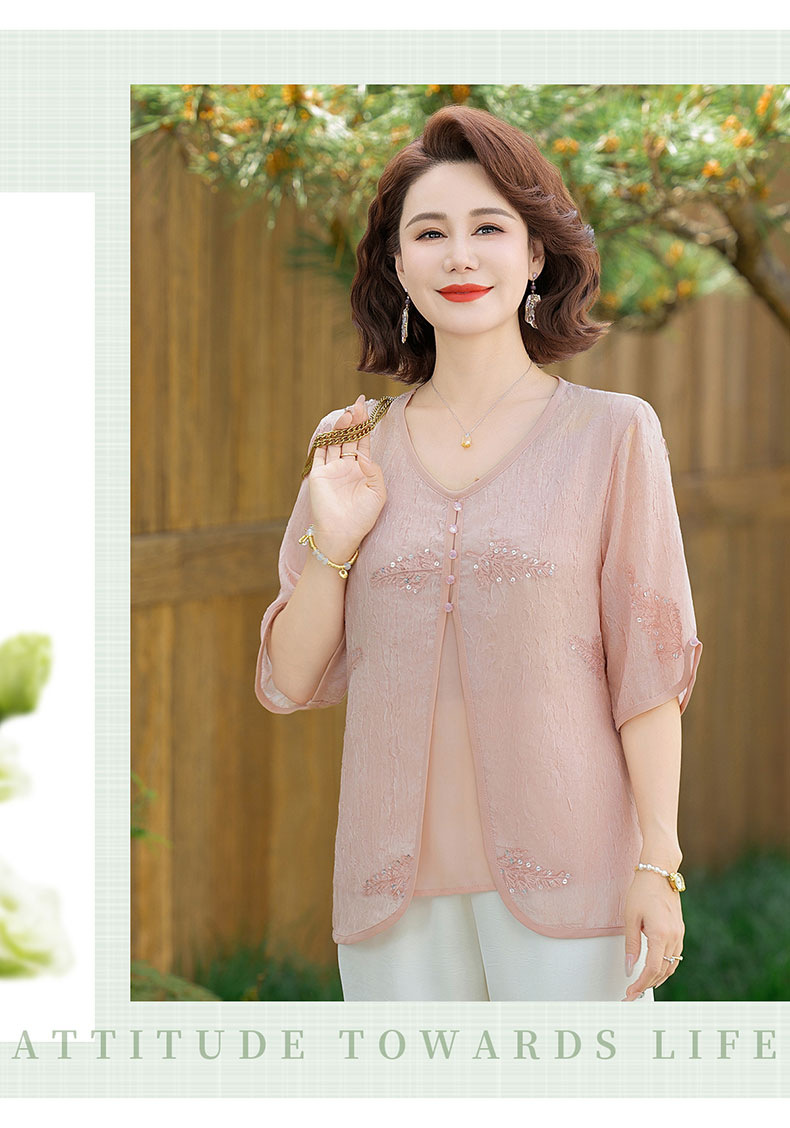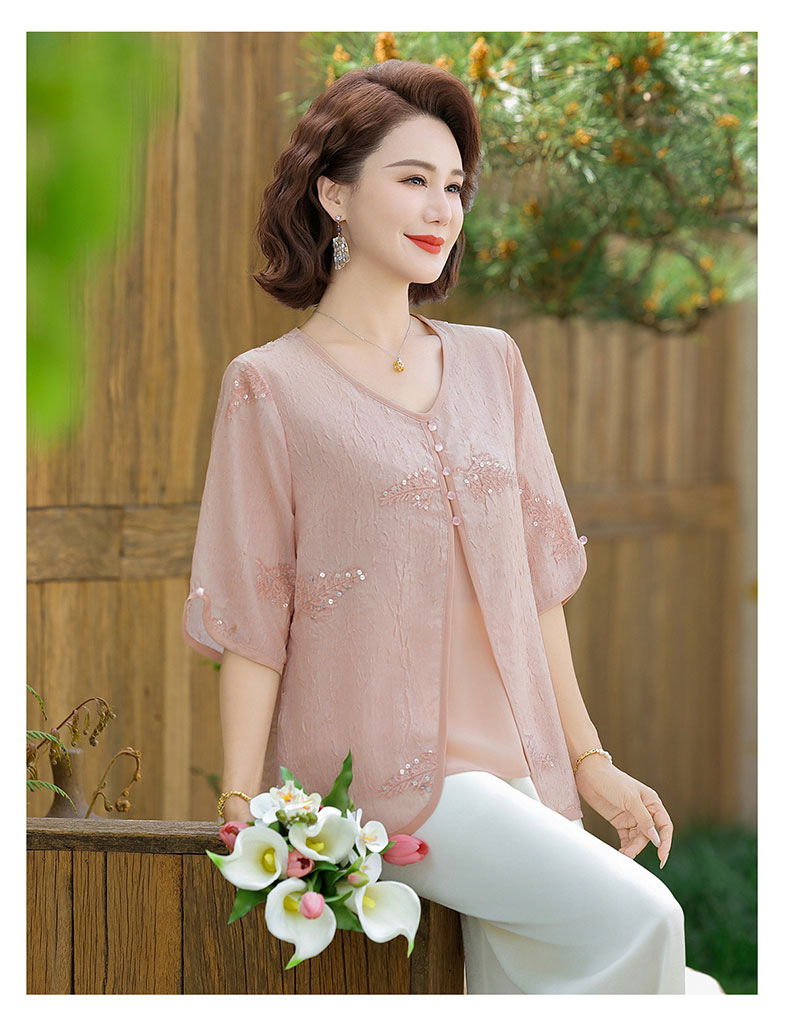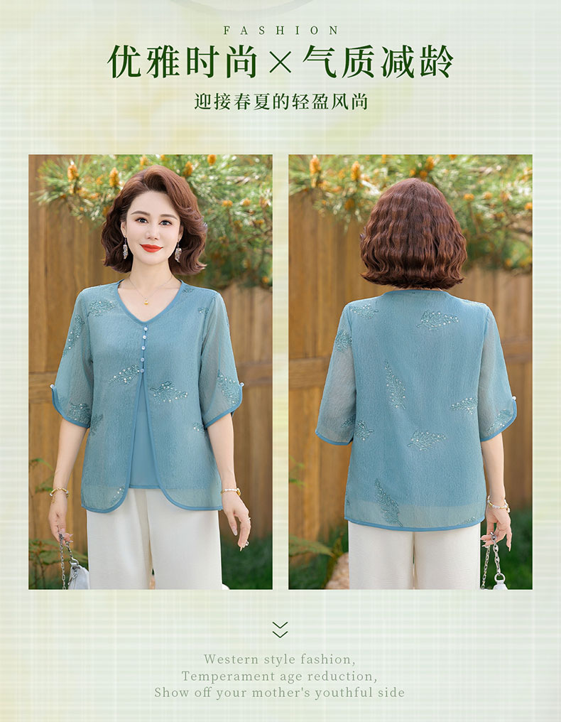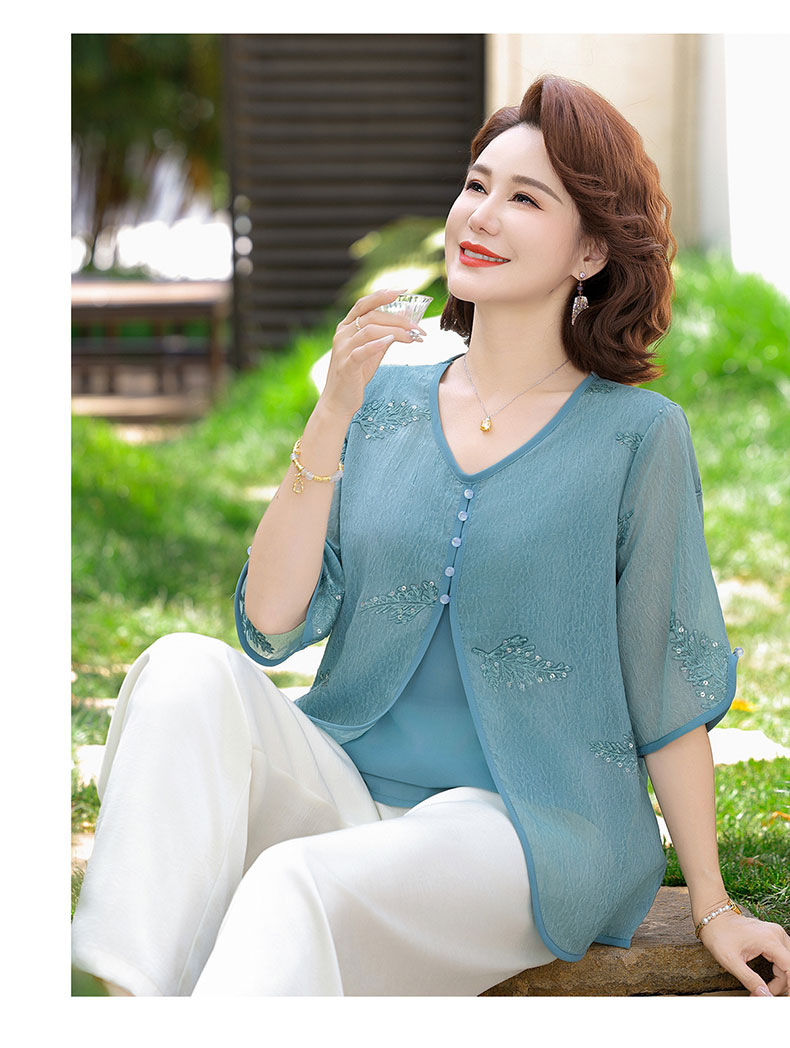 도매 엄마 여름 가짜 투피스 쉬폰 셔츠, 고급스럽고 새로운 스타일의 셔츠, 중년 및 노년 여성 티셔츠 상의스토어 가기
