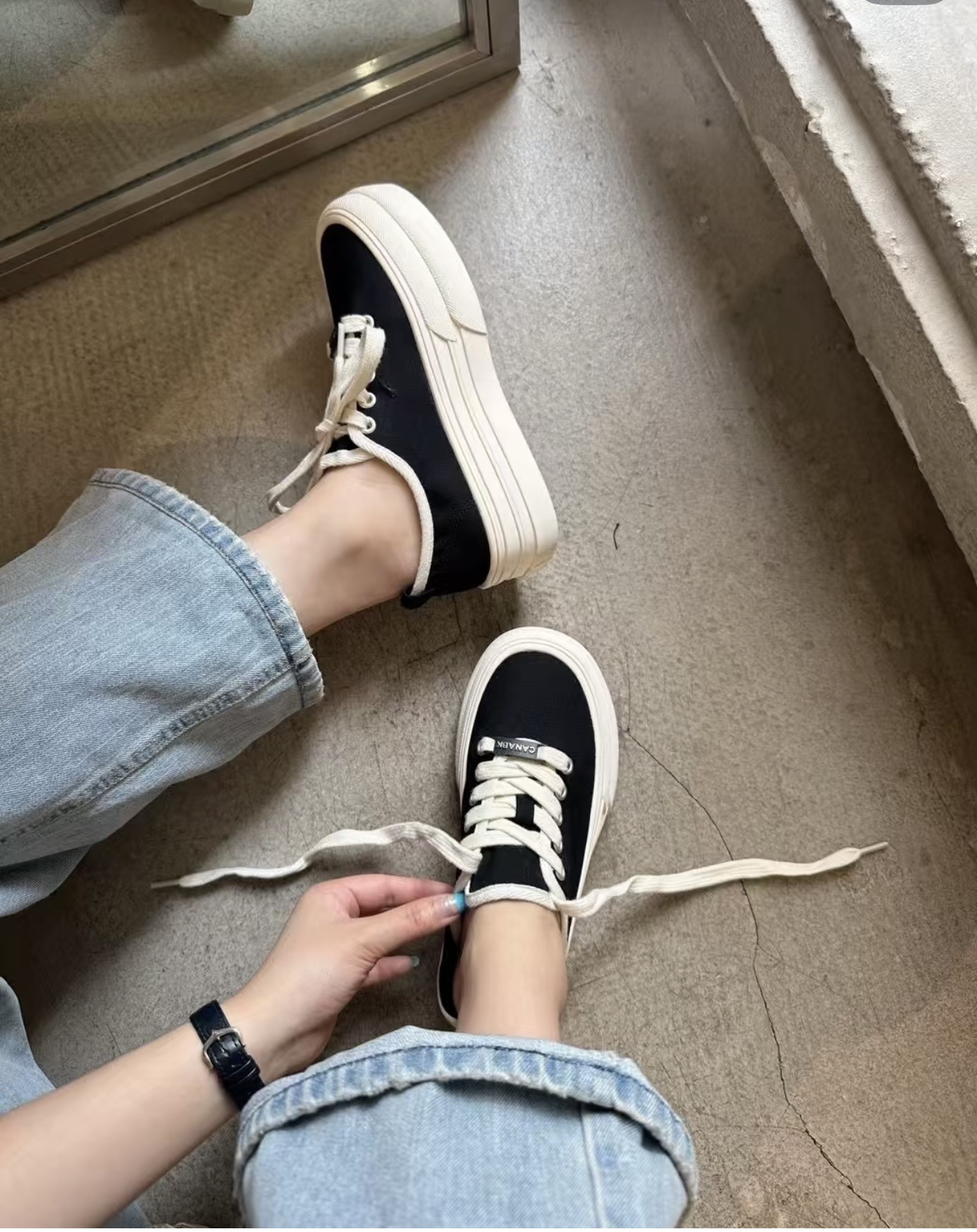 고급 2025 봄 신상 스타일 Xiaoxiang 같은 스타일의 여성용 레이스업 운동화, 둥근 발가락 두꺼운 밑창 캔버스 비스킷 슈즈, 스포츠 싱글 슈즈