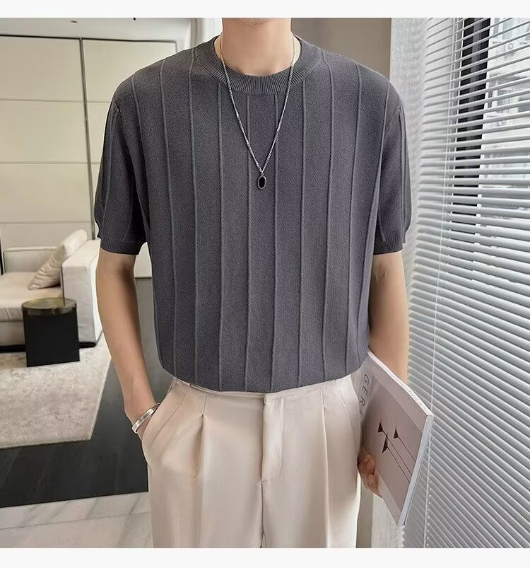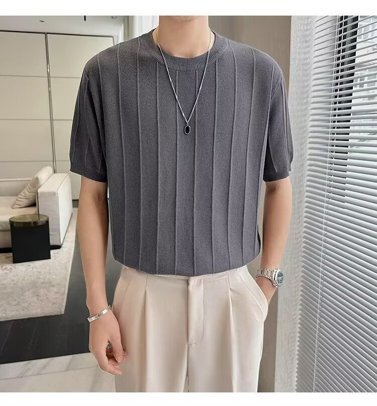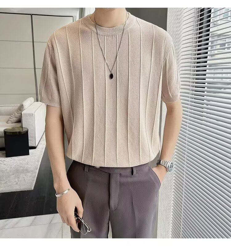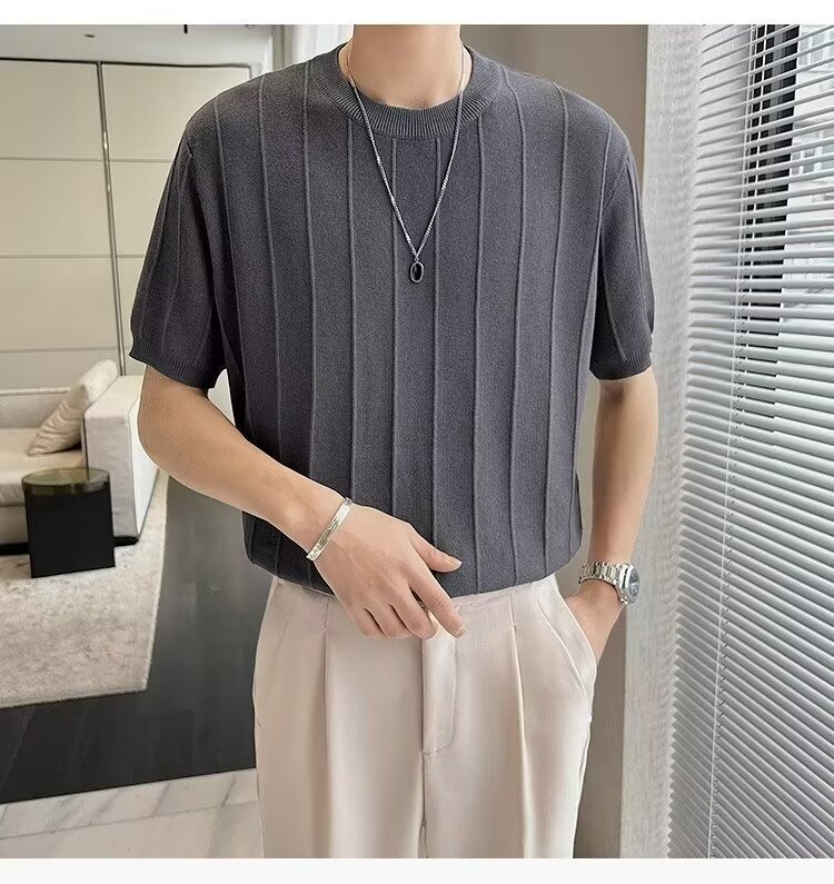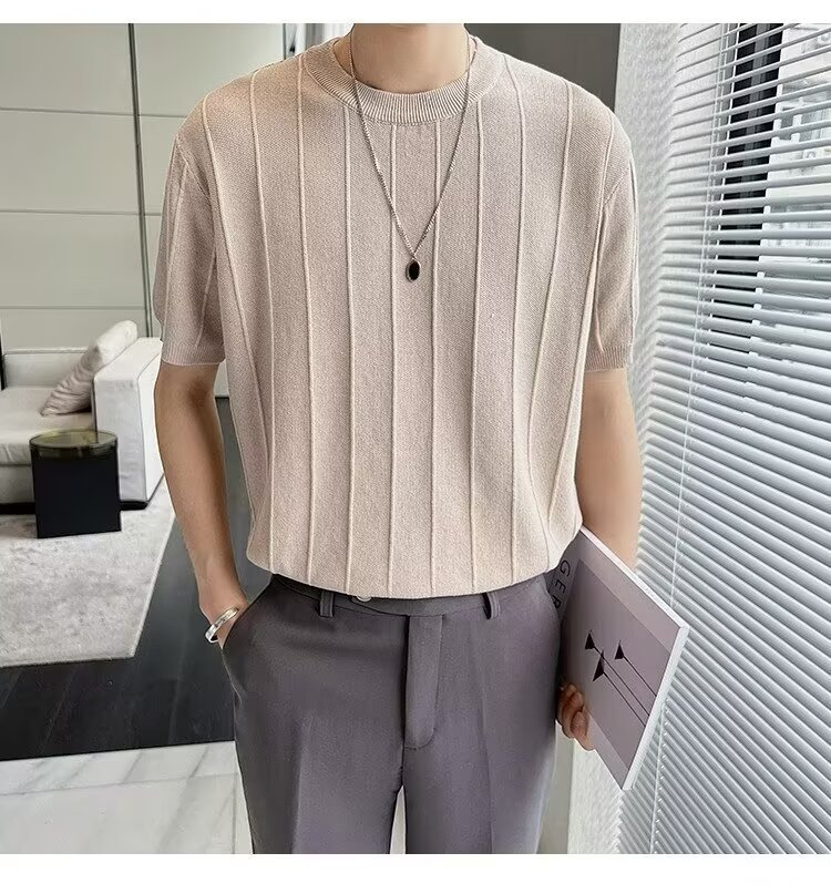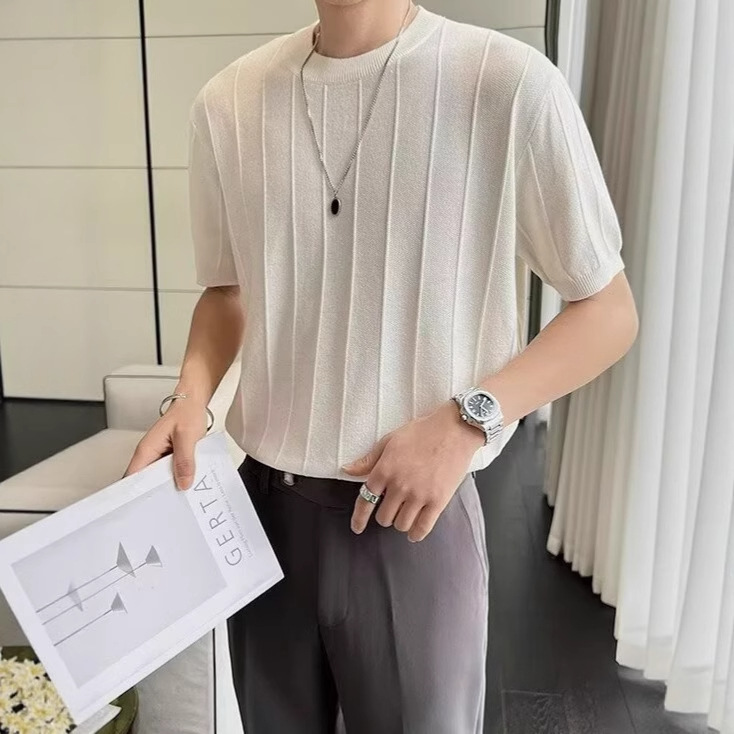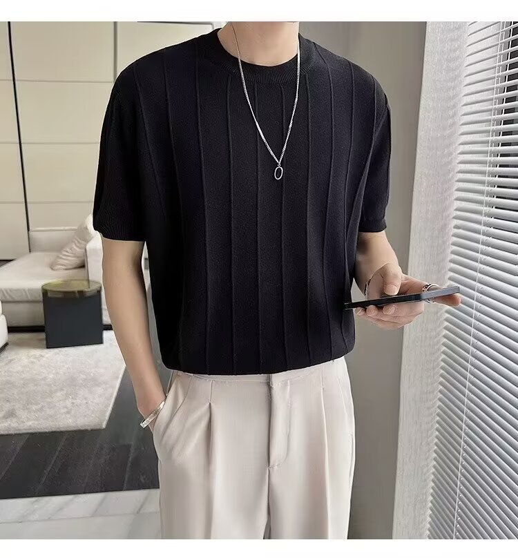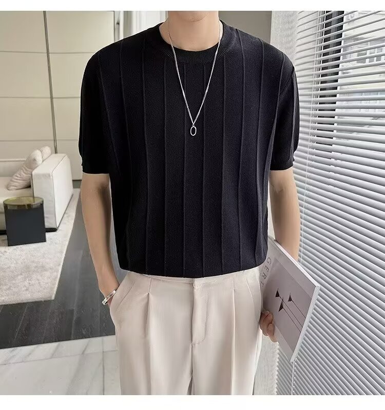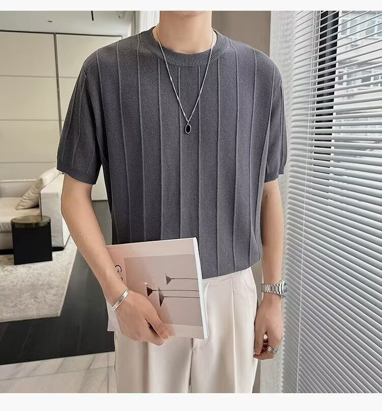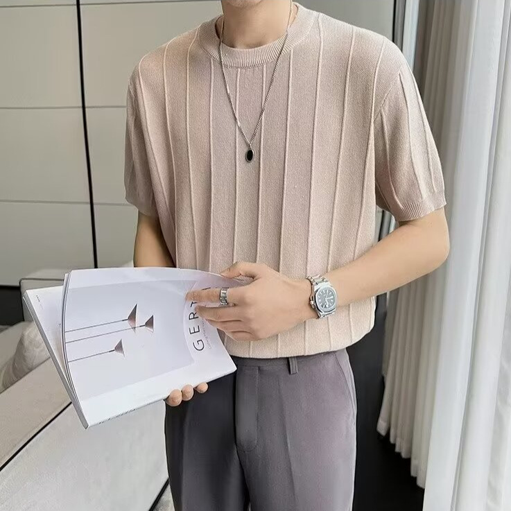 여름 남자 아이스 실크 니트 크루 넥 티셔츠 라이트 성숙한 한국 스타일 스트라이프 반팔 티셔츠 솔리드 컬러 탄성 니트 셔츠