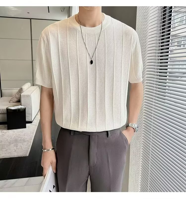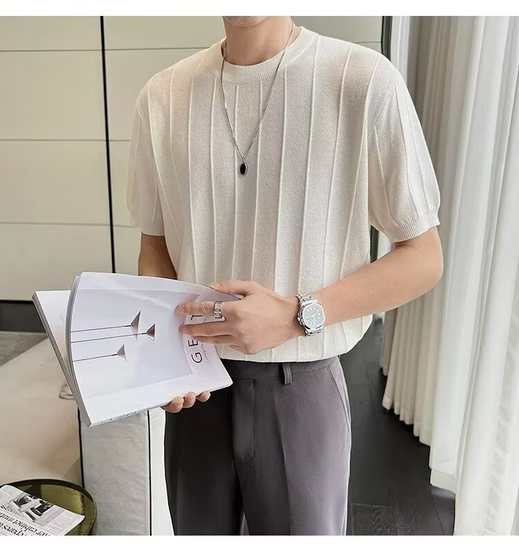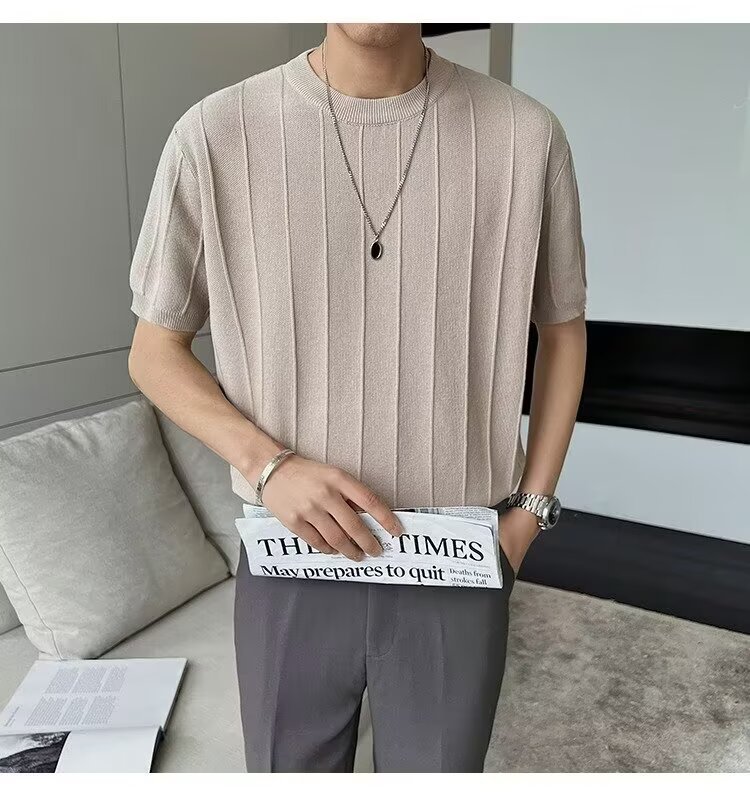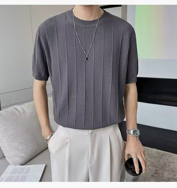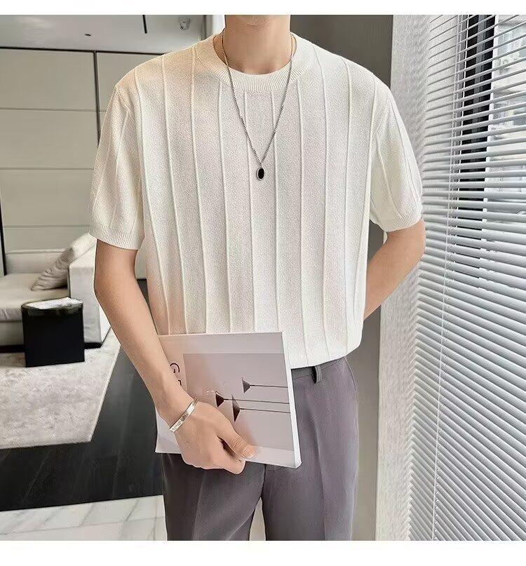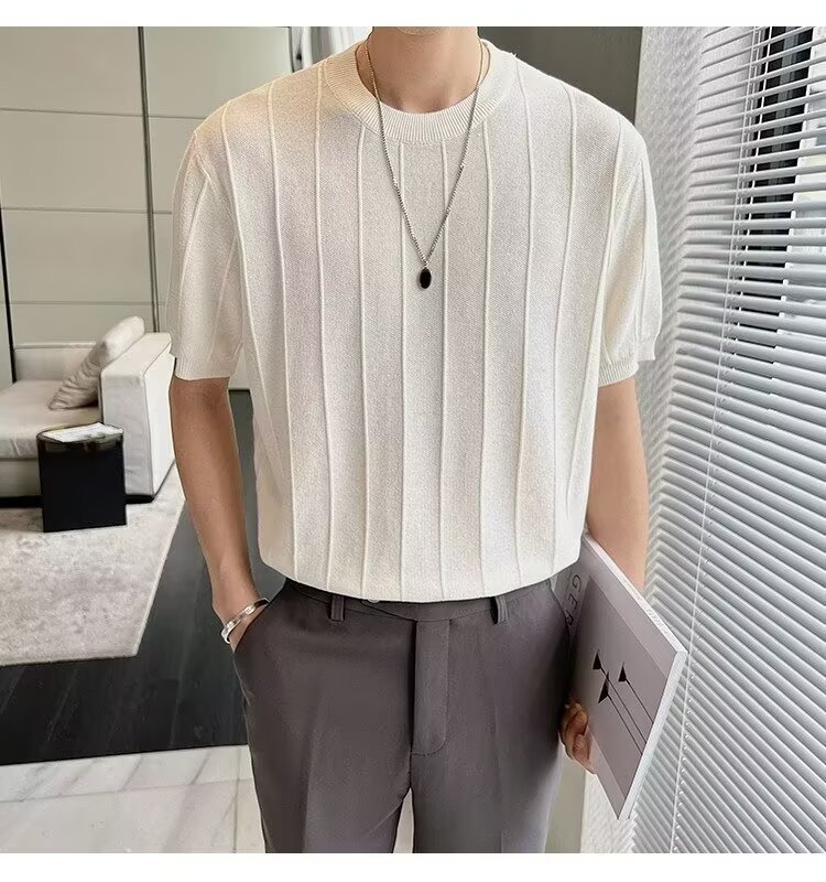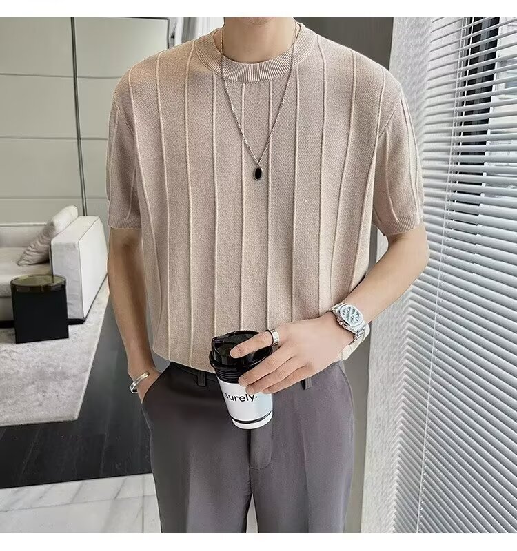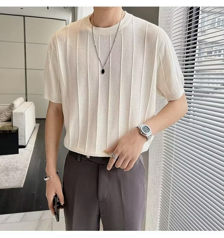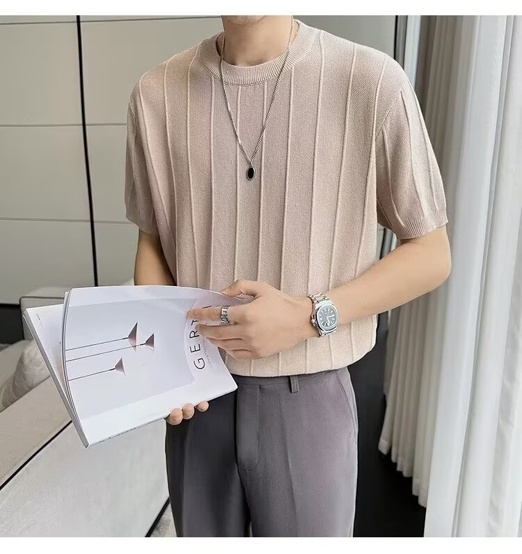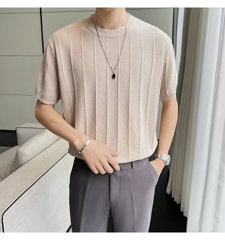 여름 남자 아이스 실크 니트 크루 넥 티셔츠 라이트 성숙한 한국 스타일 스트라이프 반팔 티셔츠 솔리드 컬러 탄성 니트 셔츠