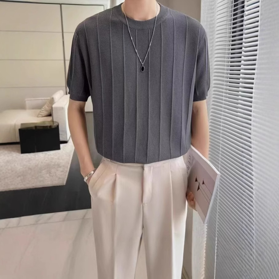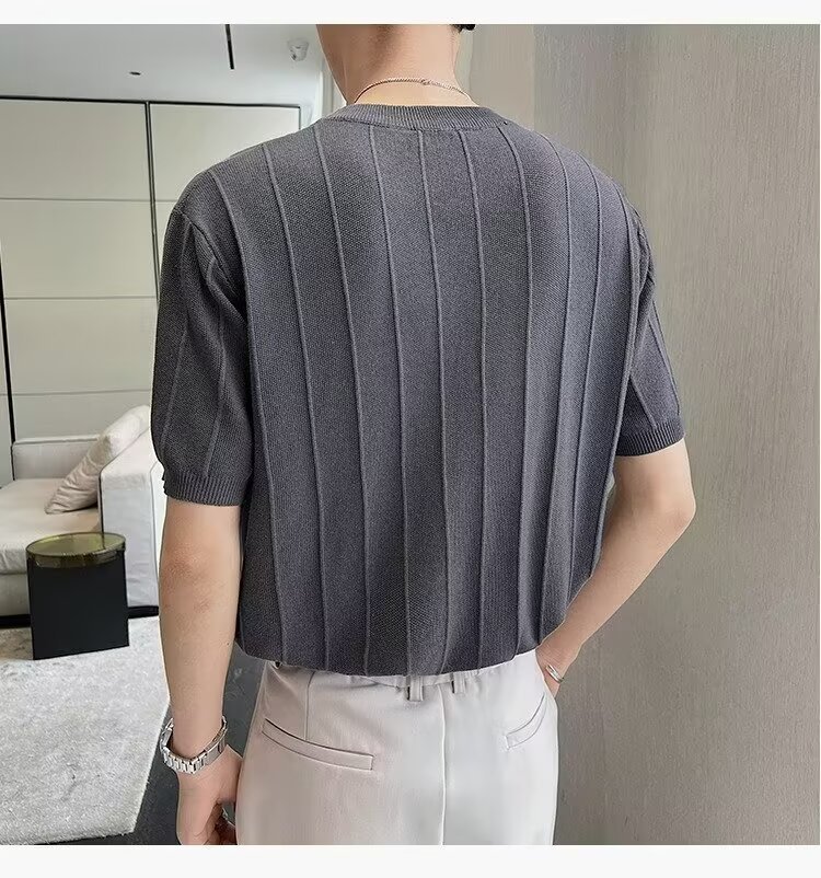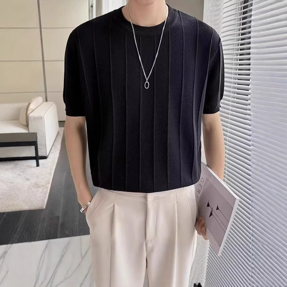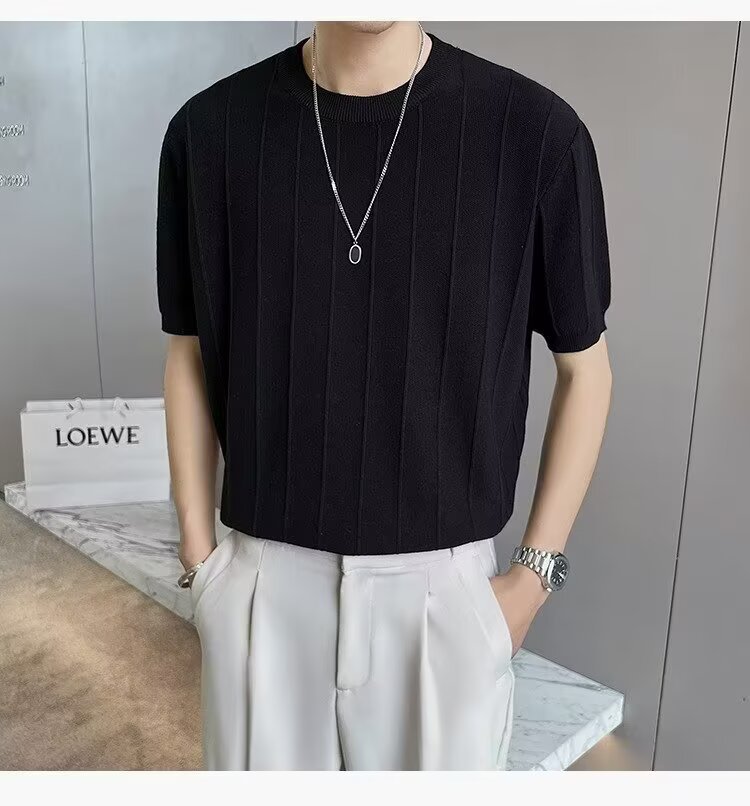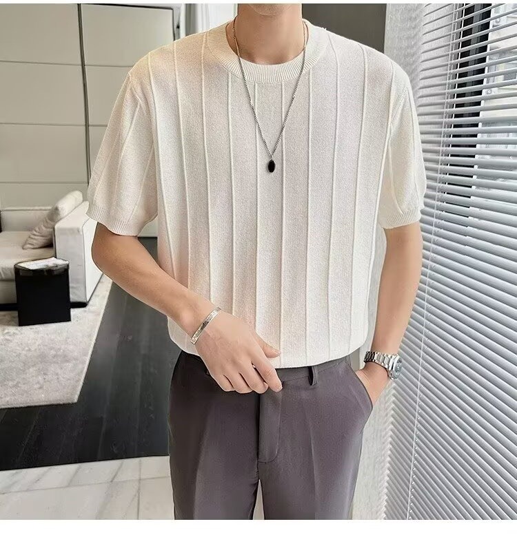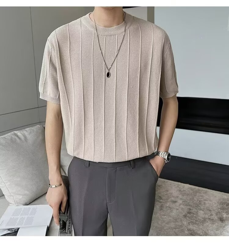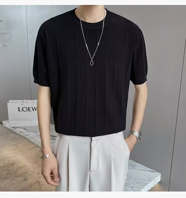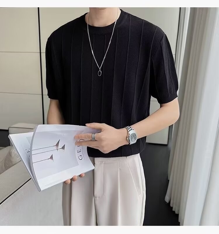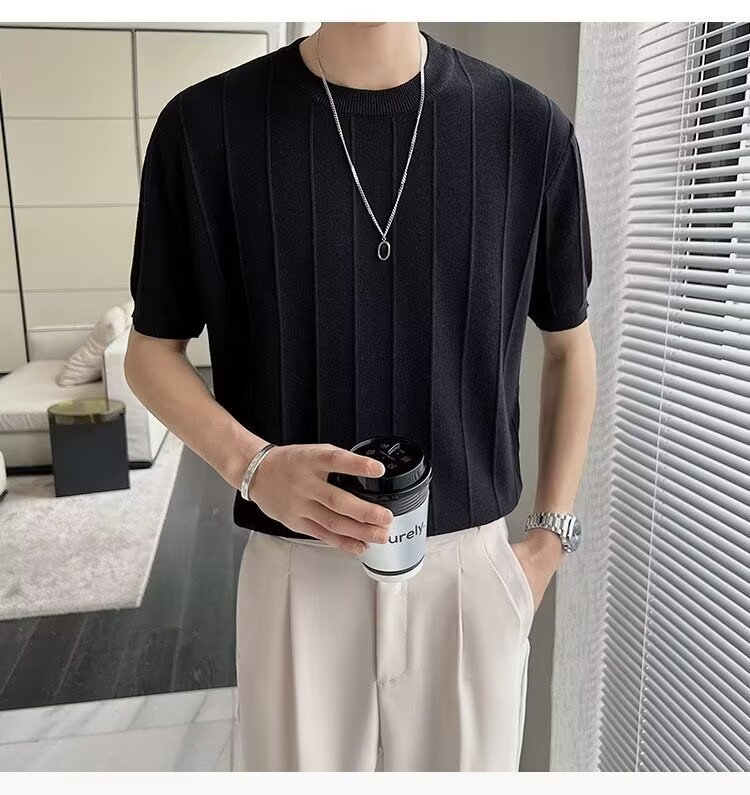 여름 남자 아이스 실크 니트 크루 넥 티셔츠 라이트 성숙한 한국 스타일 스트라이프 반팔 티셔츠 솔리드 컬러 탄성 니트 셔츠