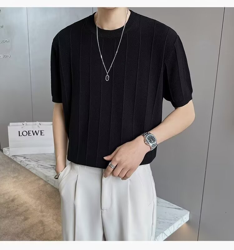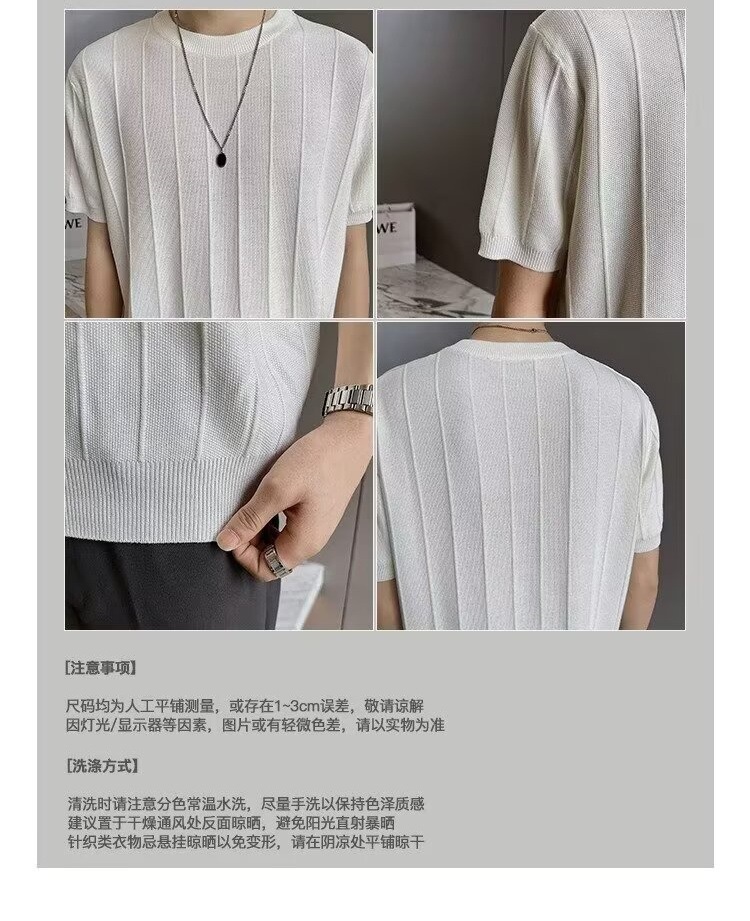 여름 남자 아이스 실크 니트 크루 넥 티셔츠 라이트 성숙한 한국 스타일 스트라이프 반팔 티셔츠 솔리드 컬러 탄성 니트 셔츠스토어 가기