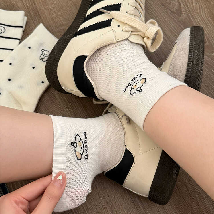 흰색 강아지 메쉬 양말 여성용 종아리 중간 양말 트렌디 솔리드 컬러 여름 얇은 일본 만화 귀여운 스타킹 봄