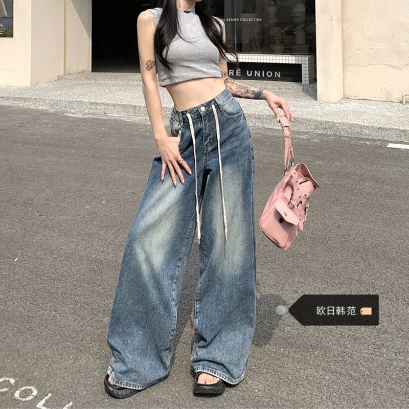 아메리칸 스타일 레트로 드로우 스트링 와이드 레그 청바지 여성의 2025 새로운 여름 얇은 느슨한 딥 팬츠스토어 가기