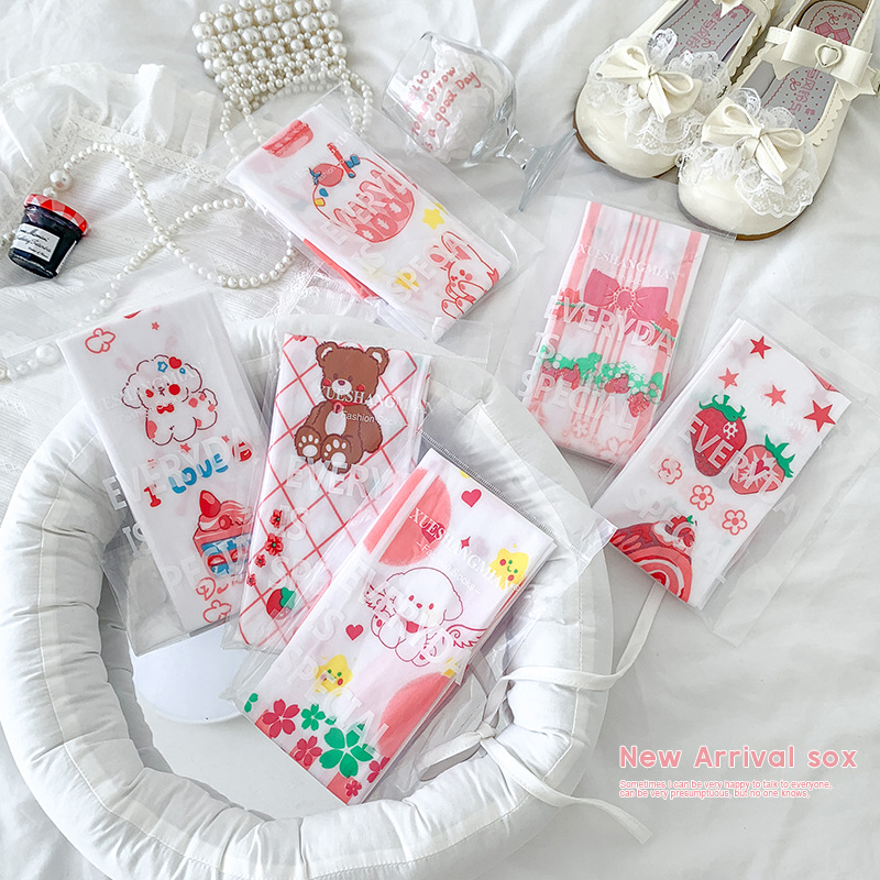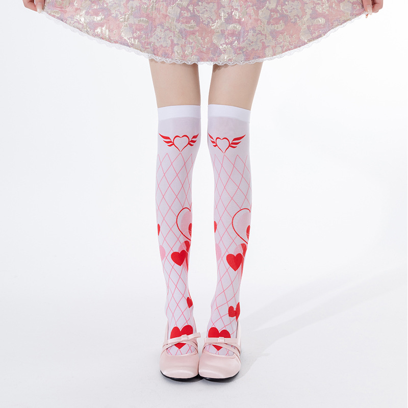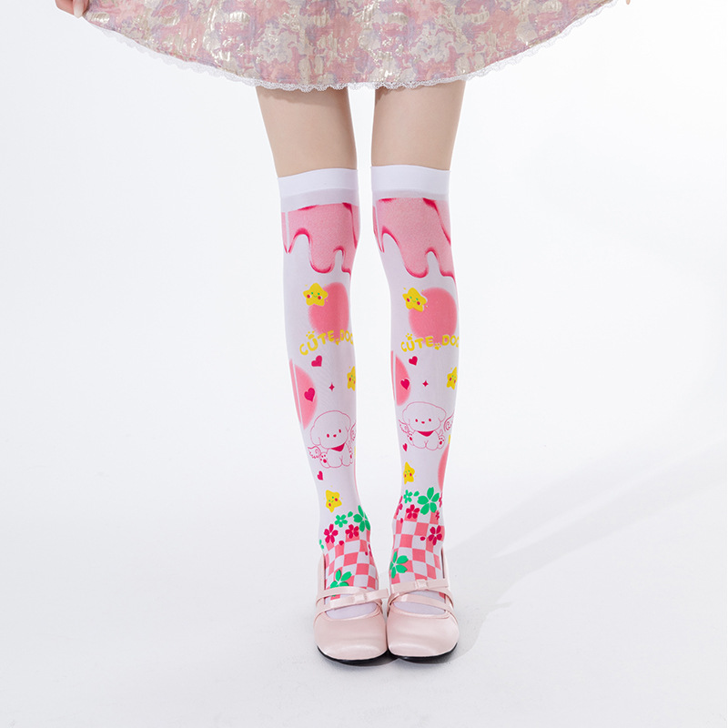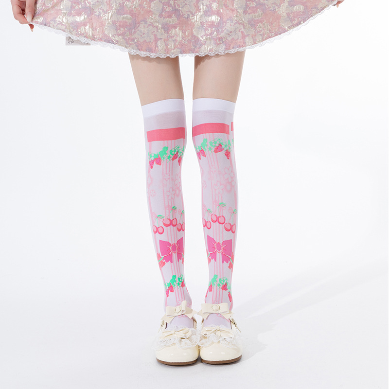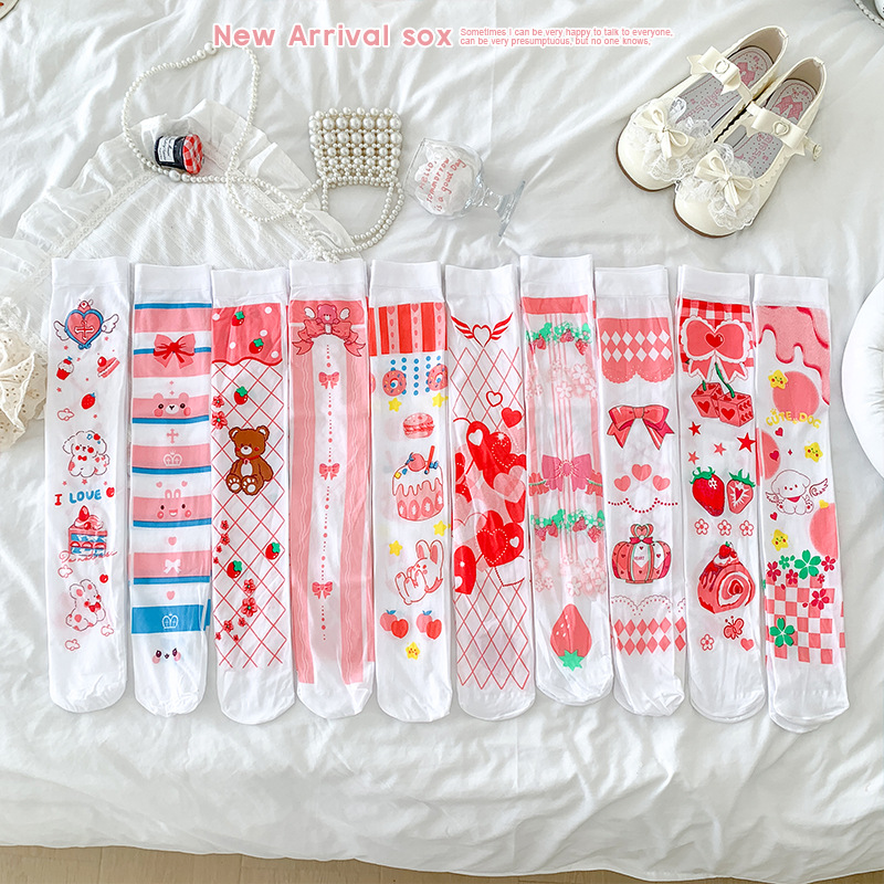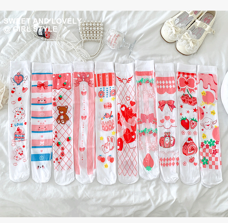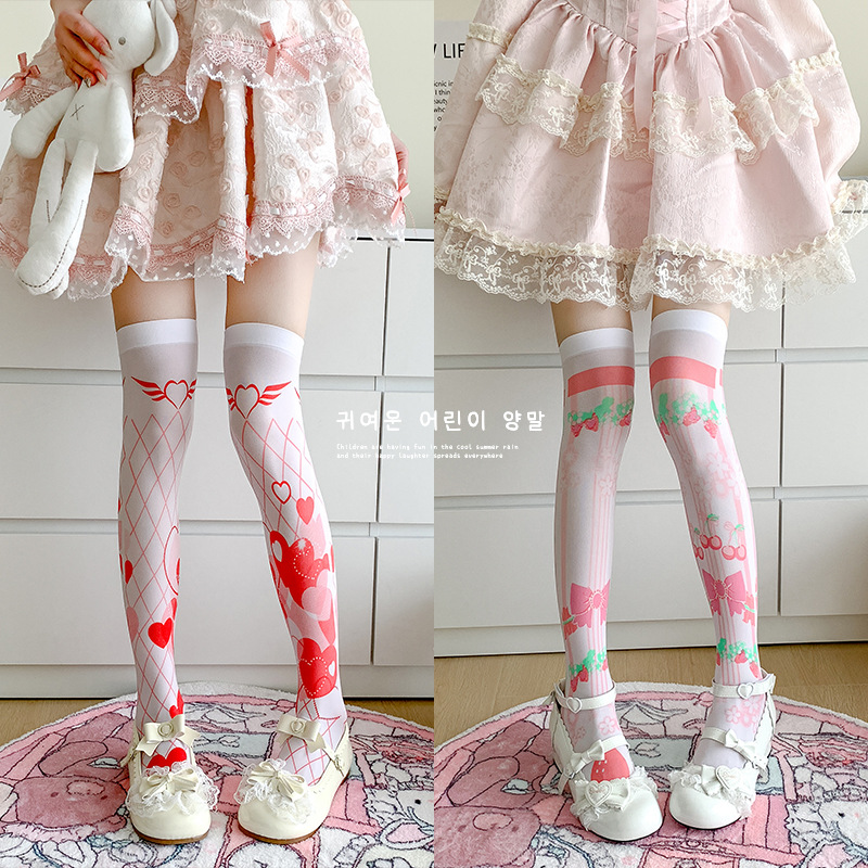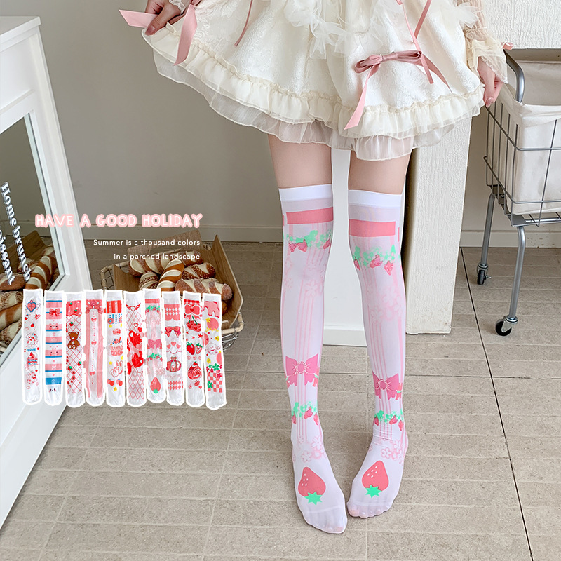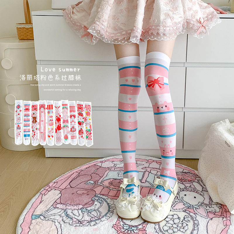 봄 여름 여성을 위한 로리타 귀여운 무릎 위 양말 얇은 오리지널 스위트 블루 핑크 프린트 긴 벨벳 소프트 소녀 종아리