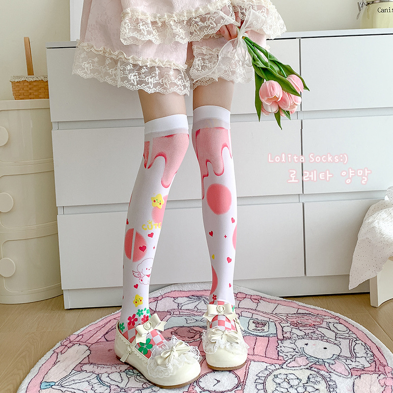봄 여름 여성을 위한 로리타 귀여운 무릎 위 양말 얇은 오리지널 스위트 블루 핑크 프린트 긴 벨벳 소프트 소녀 종아리스토어 가기