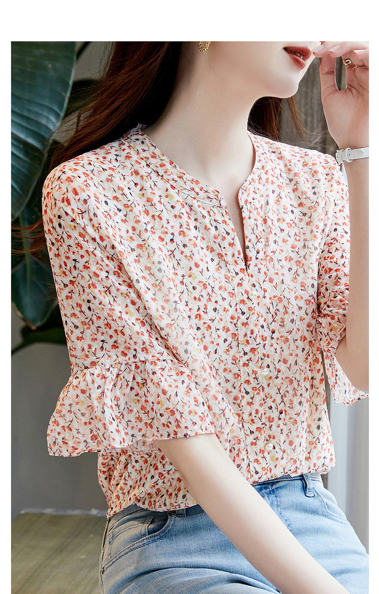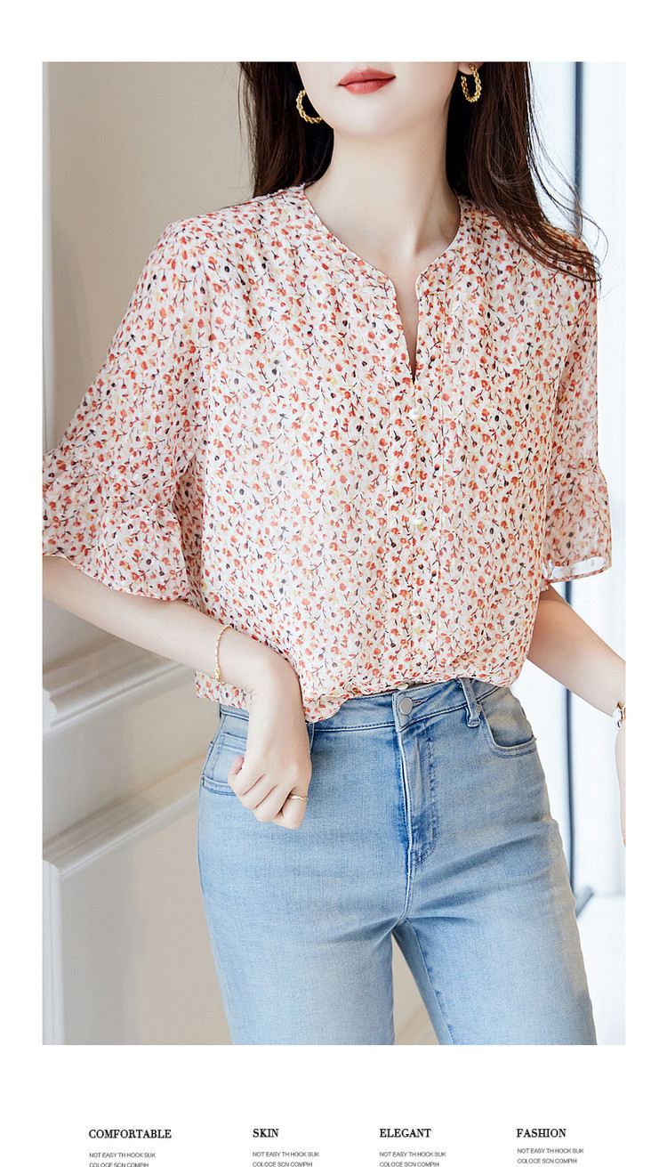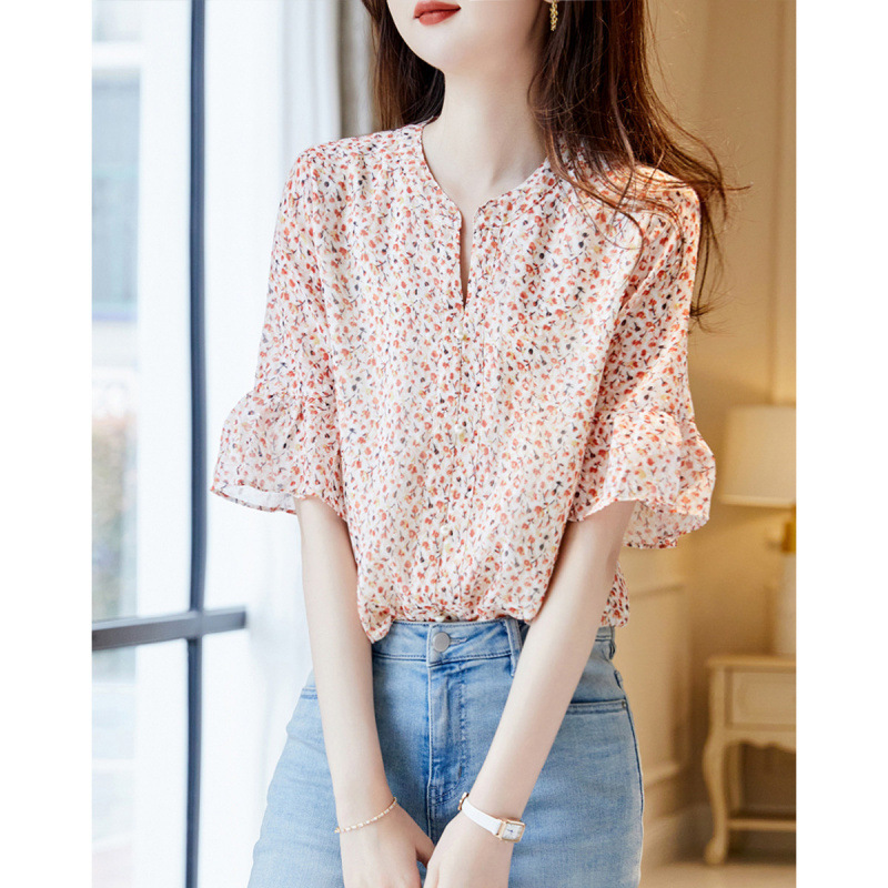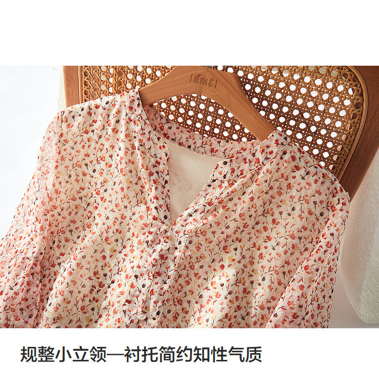 2025 년 여름 새로운 도착 칼라 예술적 주름 인쇄 셔츠 여성 최고 경량 꽃 쉬폰 셔츠스토어 가기