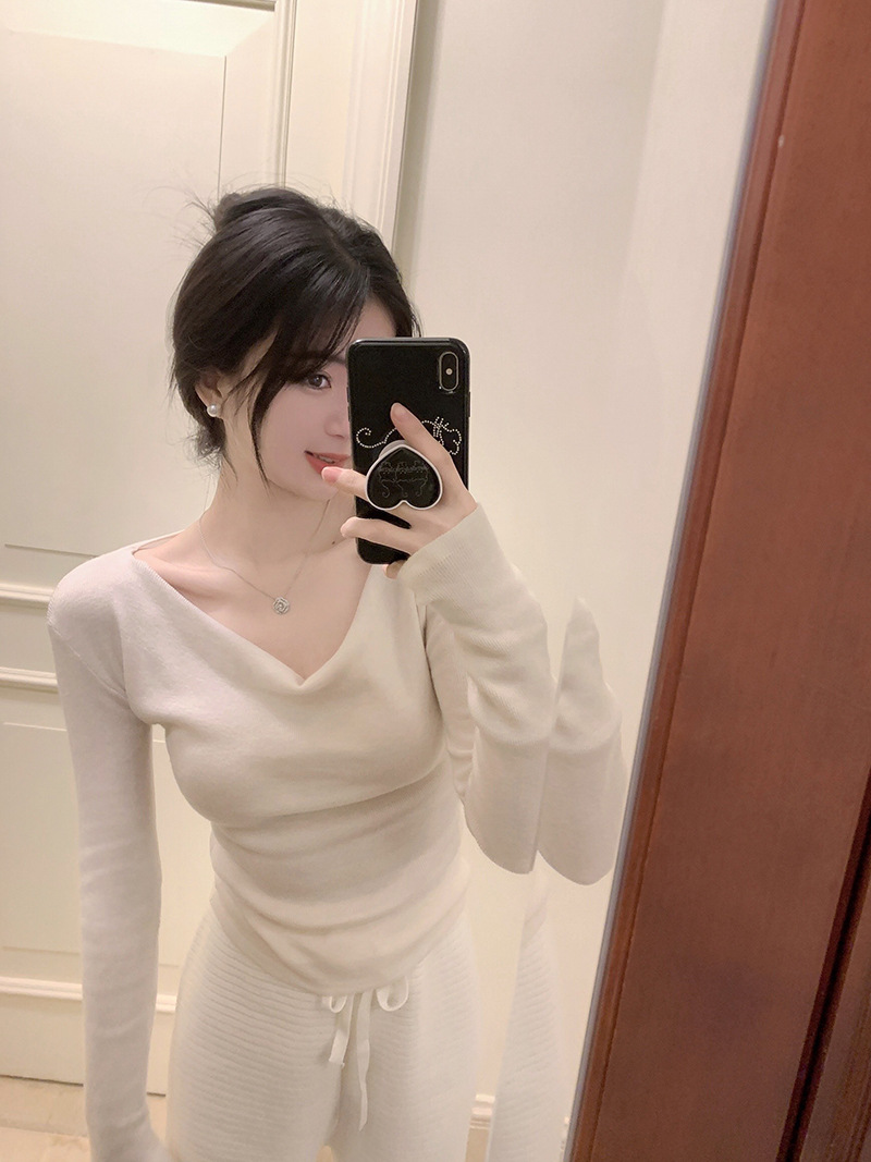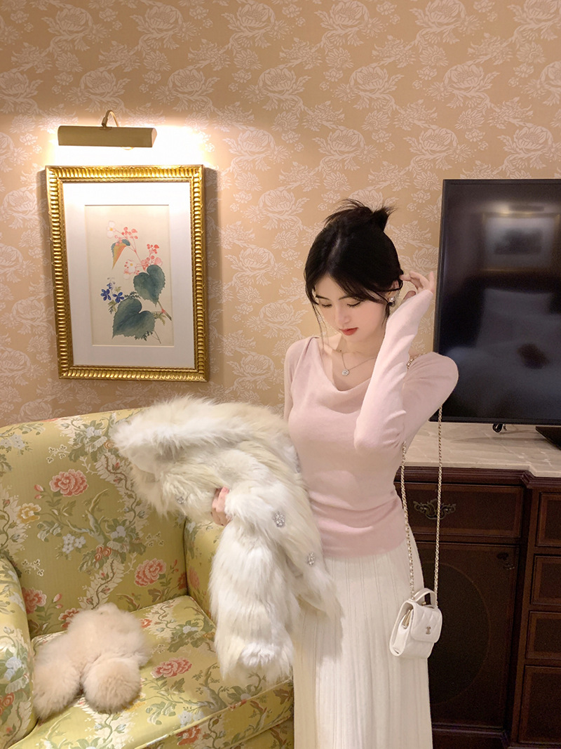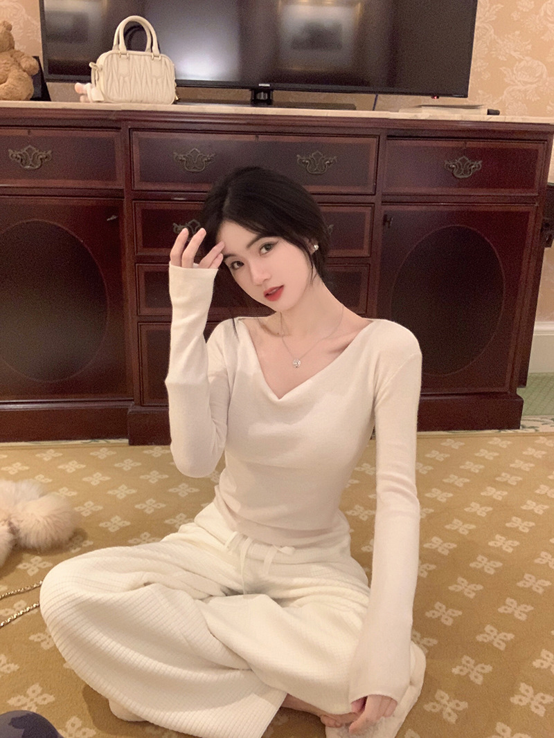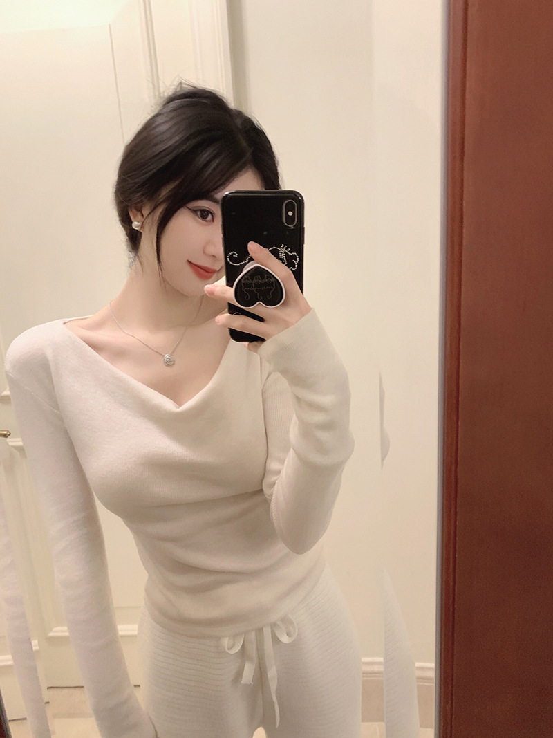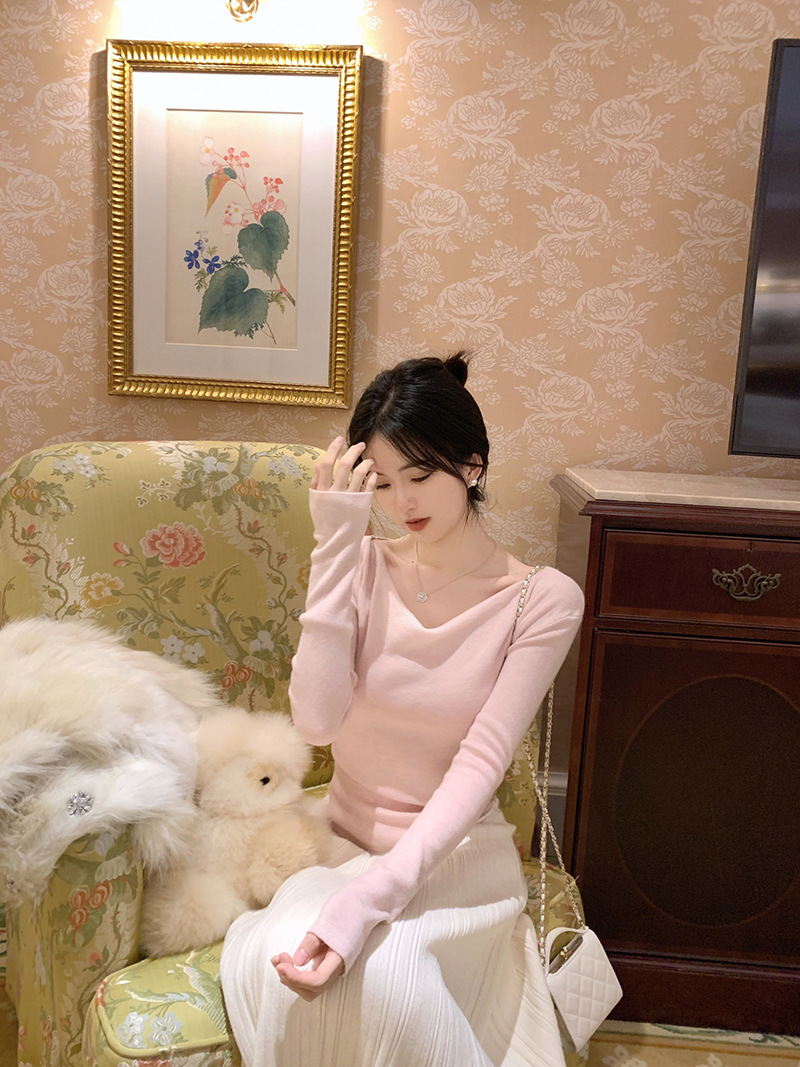 봄과 가을 새로운 불규칙한 니트 스웨터 긴팔 티셔츠 스웨터 바닥 셔츠 여성 스윙 칼라 슬림 슬리밍 탑스토어 가기