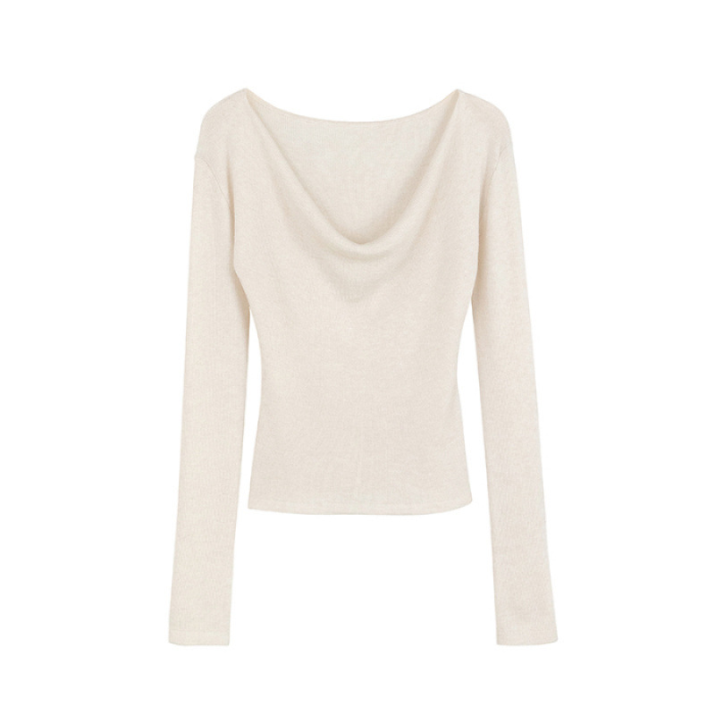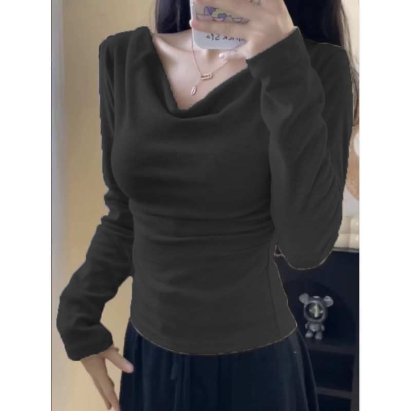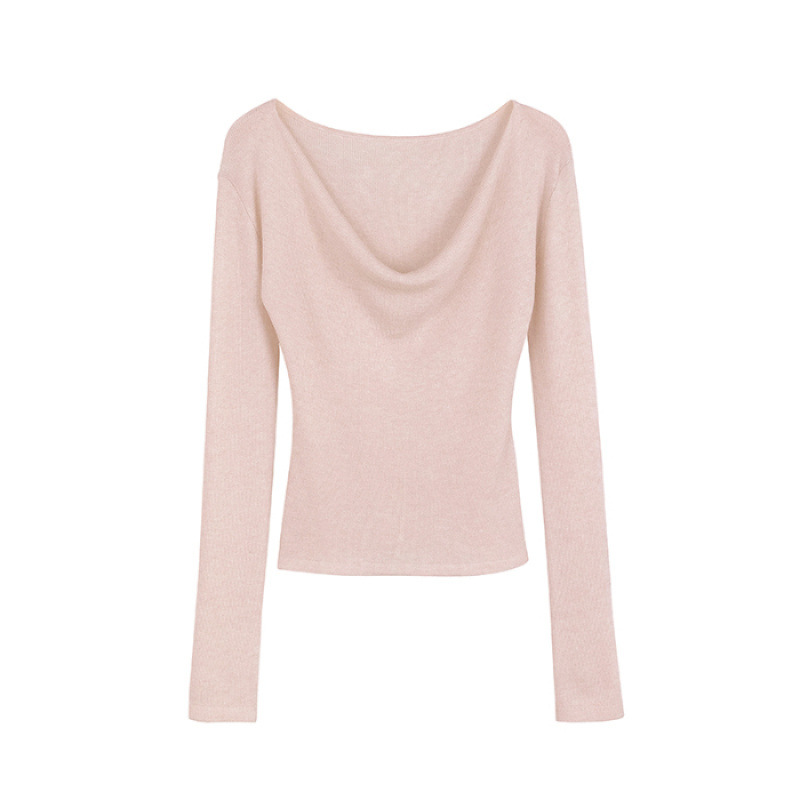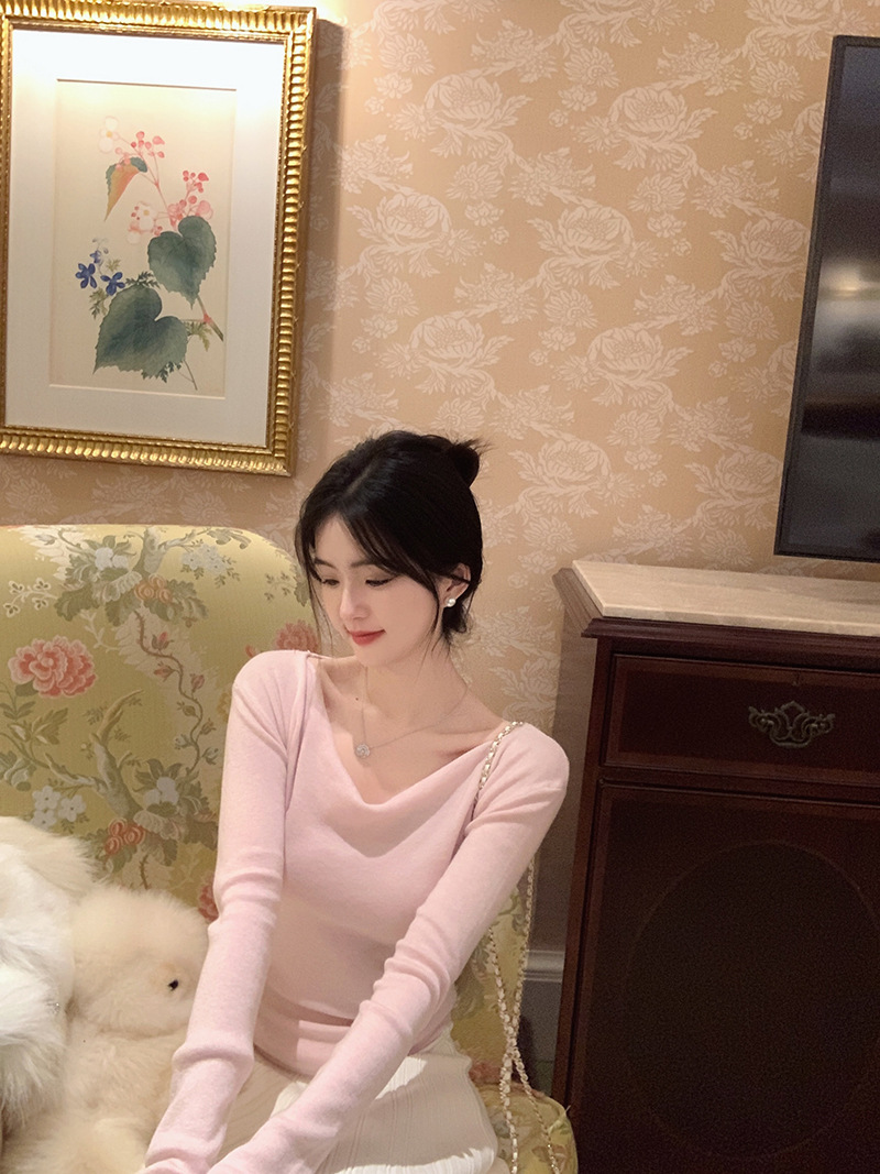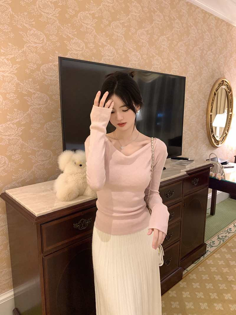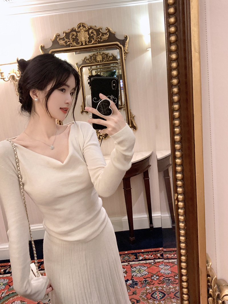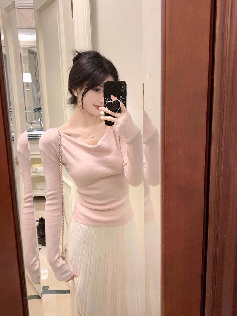 봄과 가을 새로운 불규칙한 니트 스웨터 긴팔 티셔츠 스웨터 바닥 셔츠 여성 스윙 칼라 슬림 슬리밍 탑