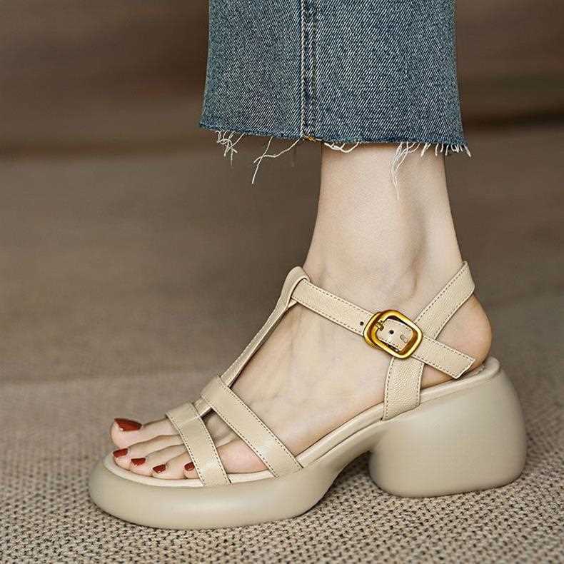 여성을위한 진짜 부드러운 가죽 하이힐 2023 여름 새로운 부드러운 밑창 복고풍 T 자형 플랫폼 두꺼운 밑창 오픈 발가락 두꺼운 굽 샌들스토어 가기