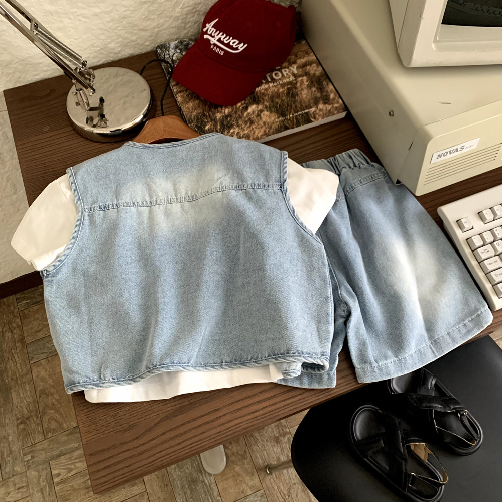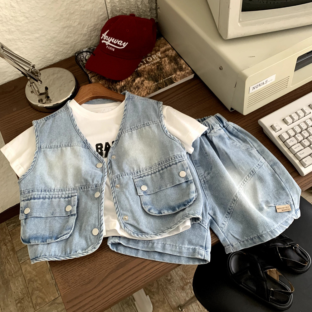 어린이 여름 데님 조끼 3 피스 세트 2025 여름 새로운 도착 남성과 아기의 인터넷 인기 유행 세트 유행 의류 및 바지스토어 가기