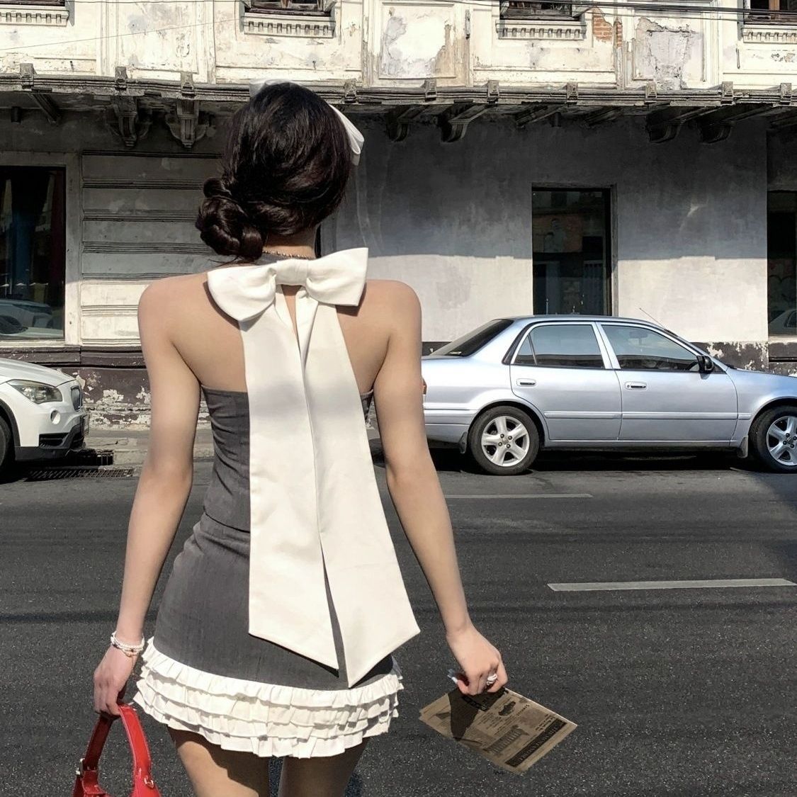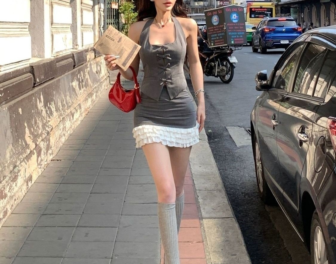 여름 핫걸 보우 홀터넥 탑, 달콤한 소녀 순수한 욕망 디자인 스플라이스 케이크 스커트 여성용 투피스 세트스토어 가기
