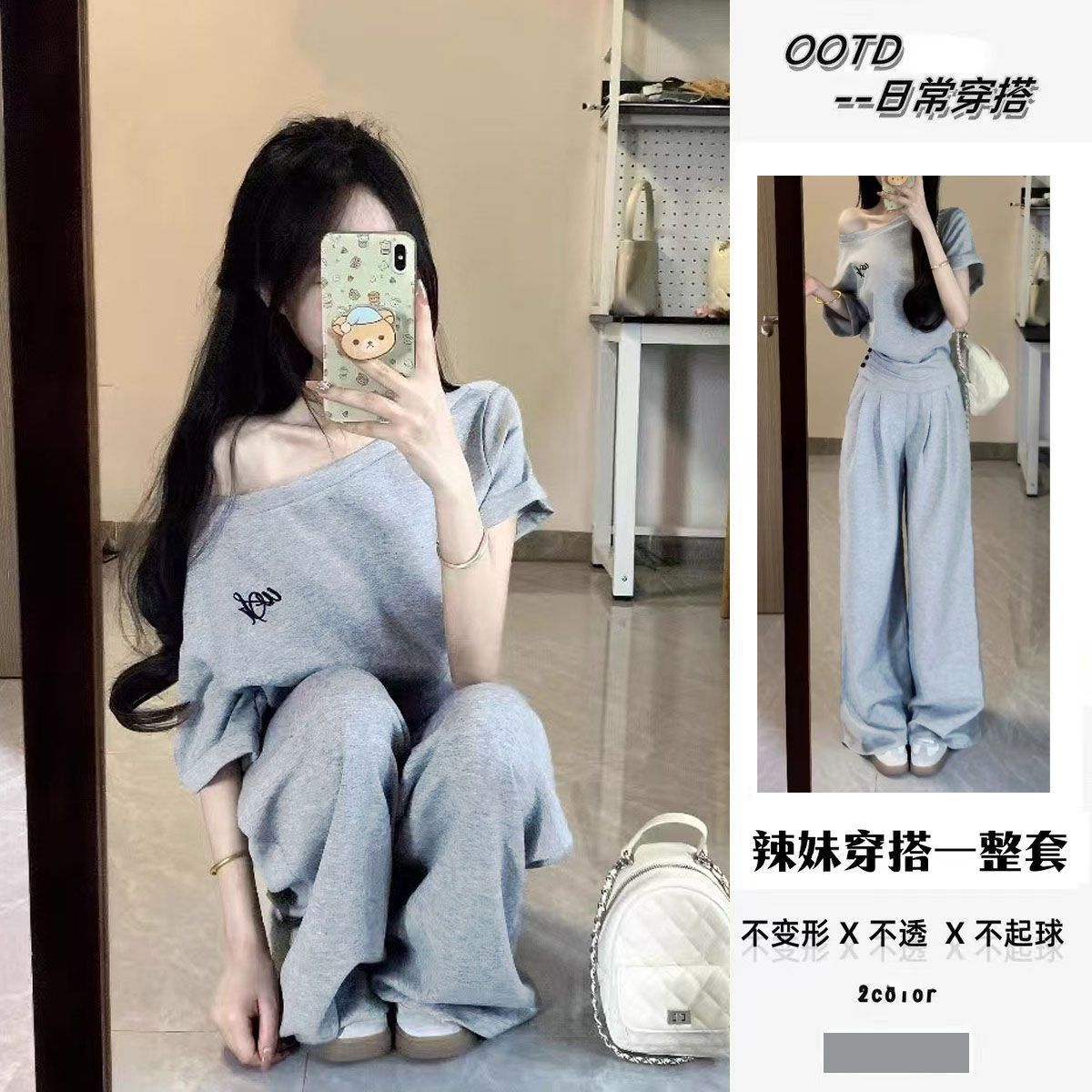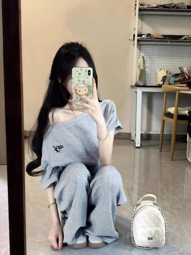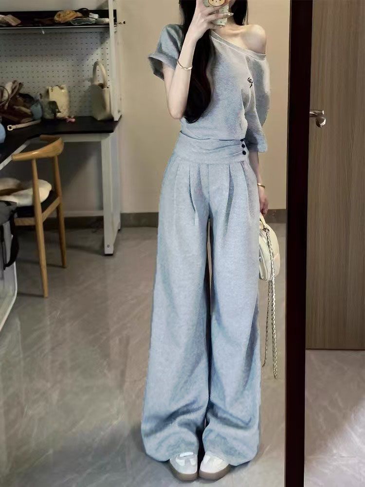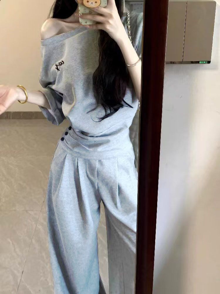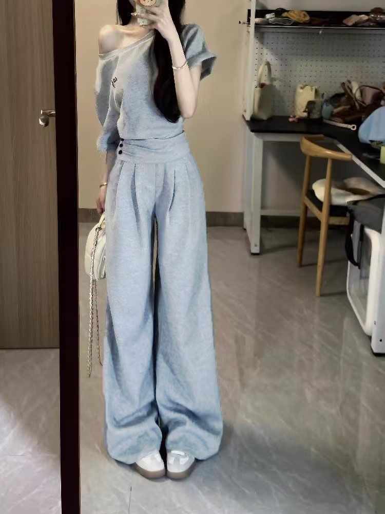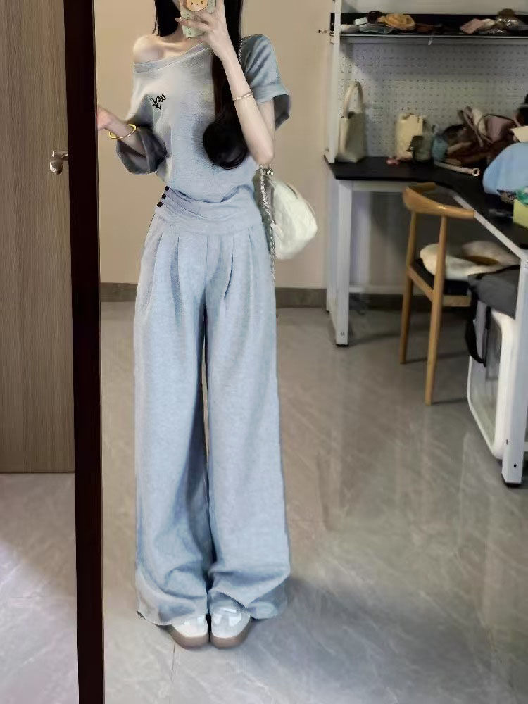 2025 신한국 그레이 캐주얼 스포츠 슈트 여성 여름 짧은 허리 슬랜트 숄더 탑 와이드 레그 팬츠 투피스 세트스토어 가기