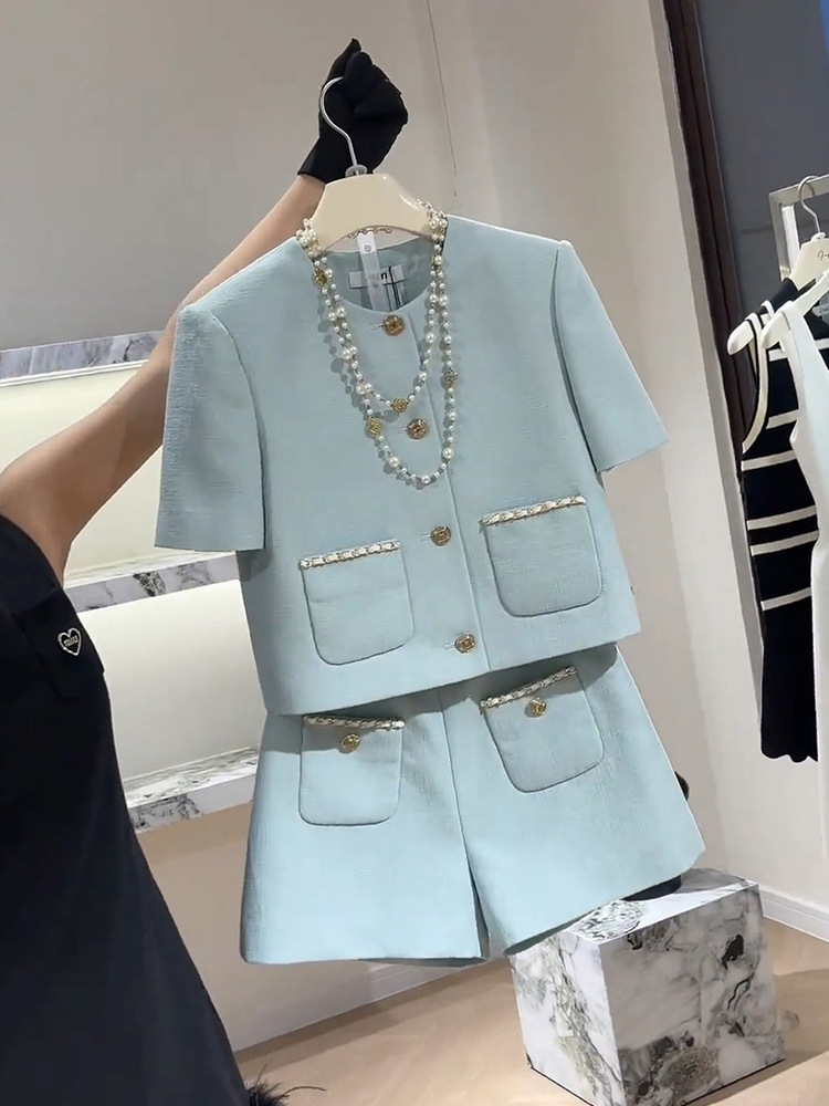 작은 키 큰 빛 럭셔리 여성의 레이디 우아한 하이 엔드 하이 엔드 작은 샤넬 스타일 라이트 블루 반바지 세트 여름스토어 가기