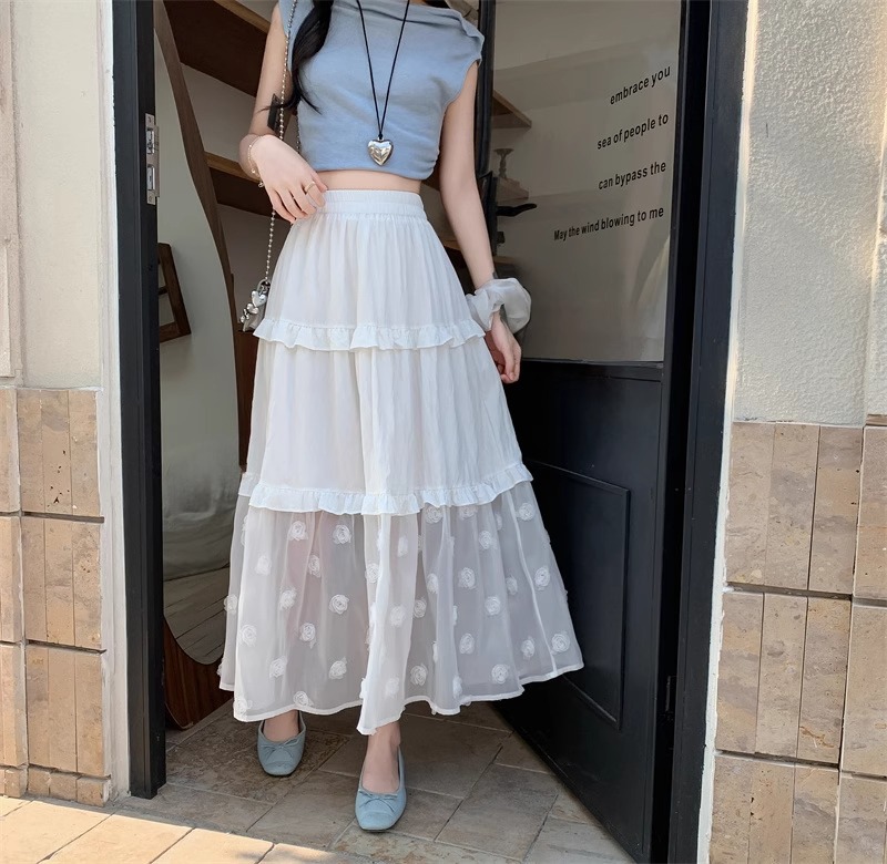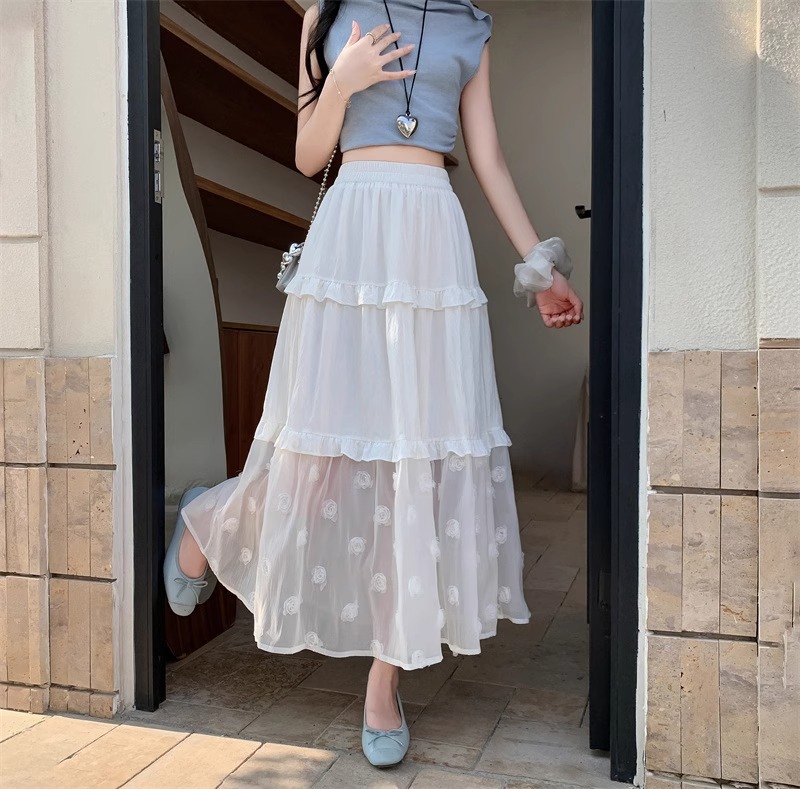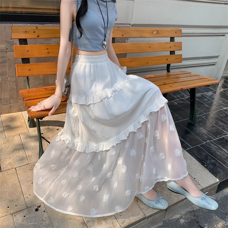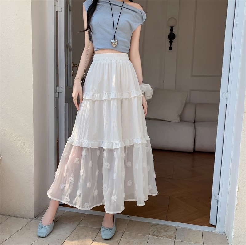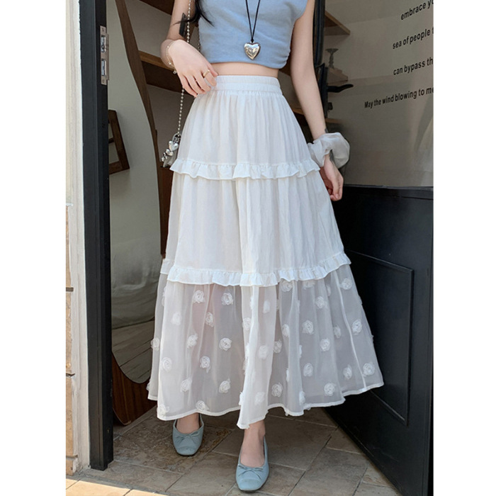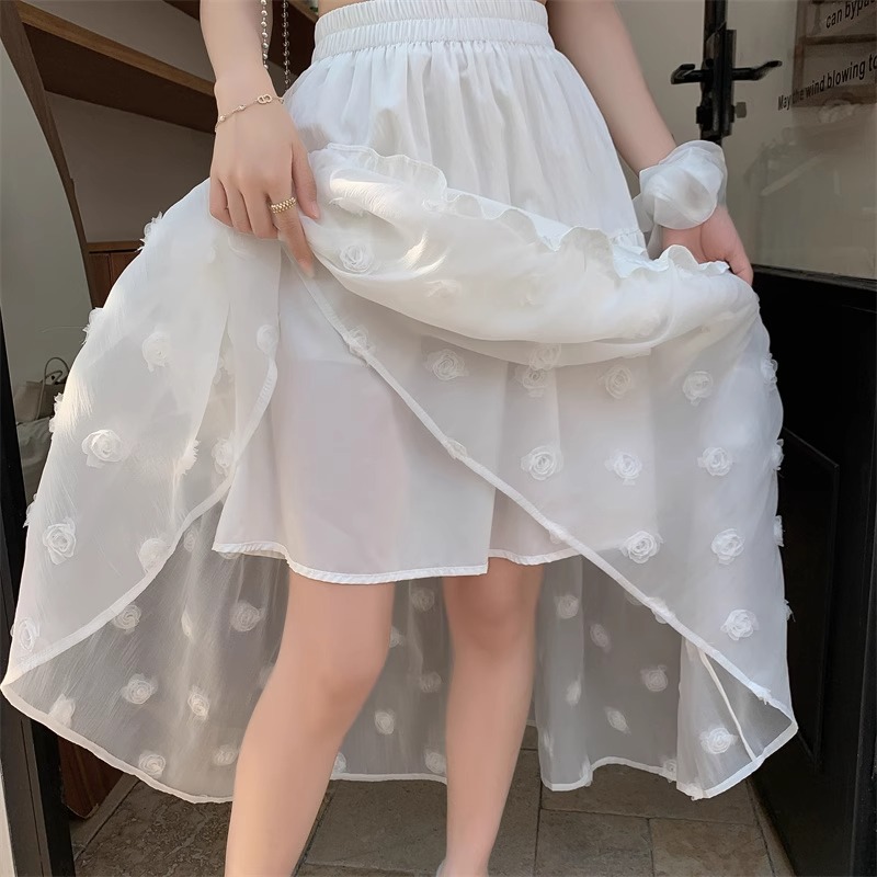 [오리지널 원단] 화이트 쉬폰 스플라이스 우산 스커트 여성 디자인 입체 꽃 A라인 미드길이 스커트