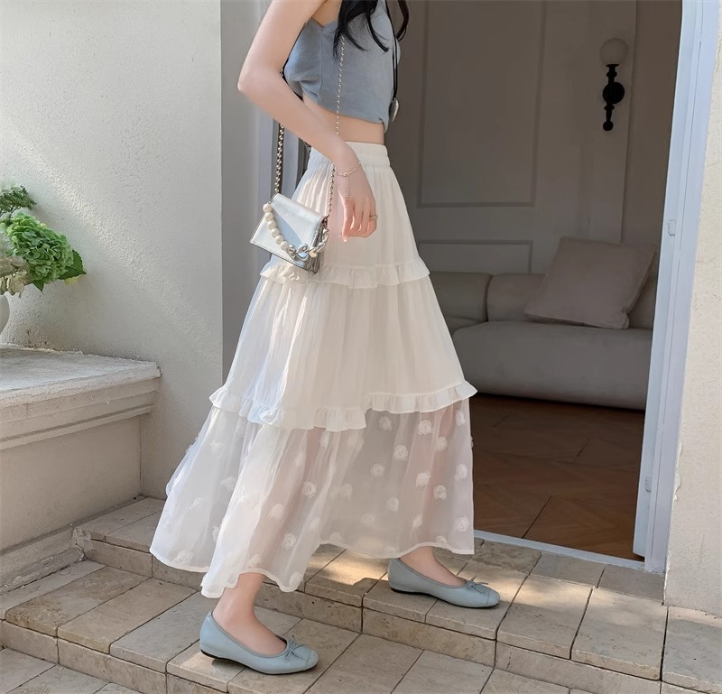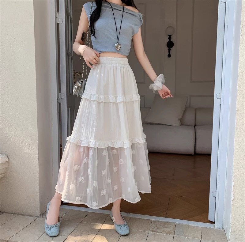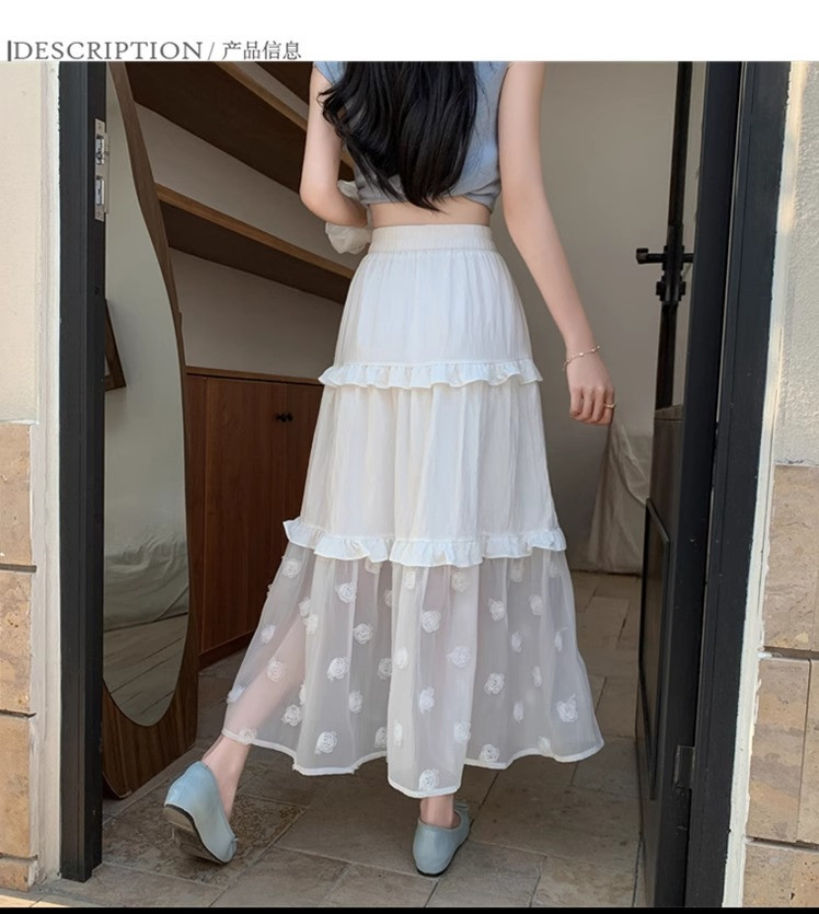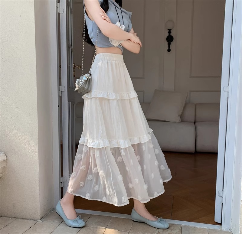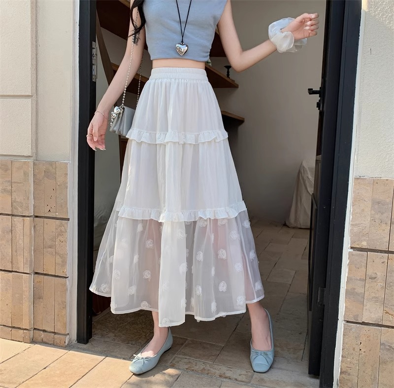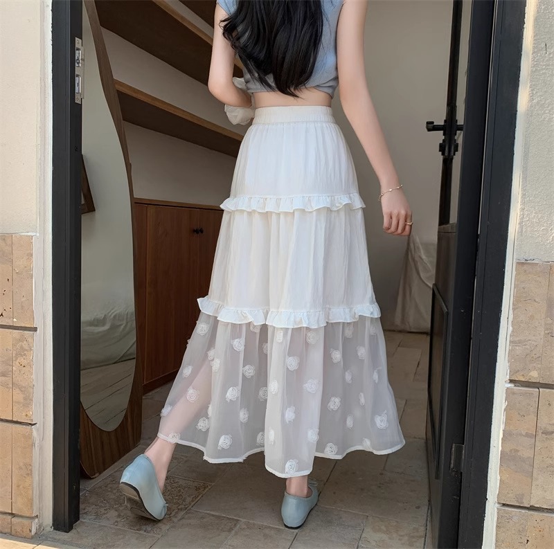 [오리지널 원단] 화이트 쉬폰 스플라이스 우산 스커트 여성 디자인 입체 꽃 A라인 미드길이 스커트