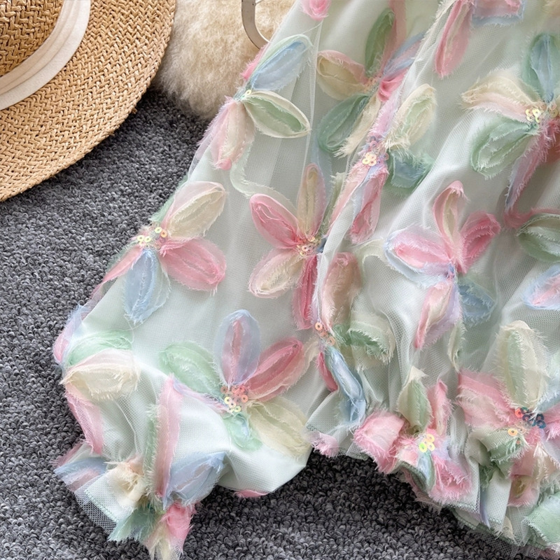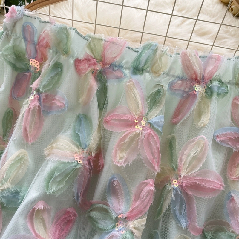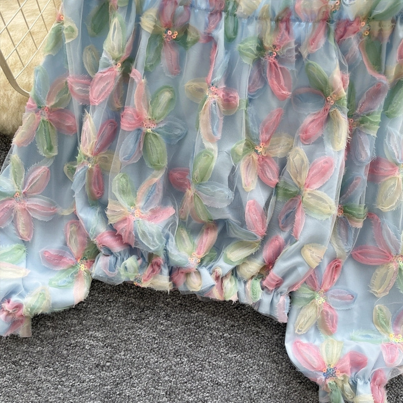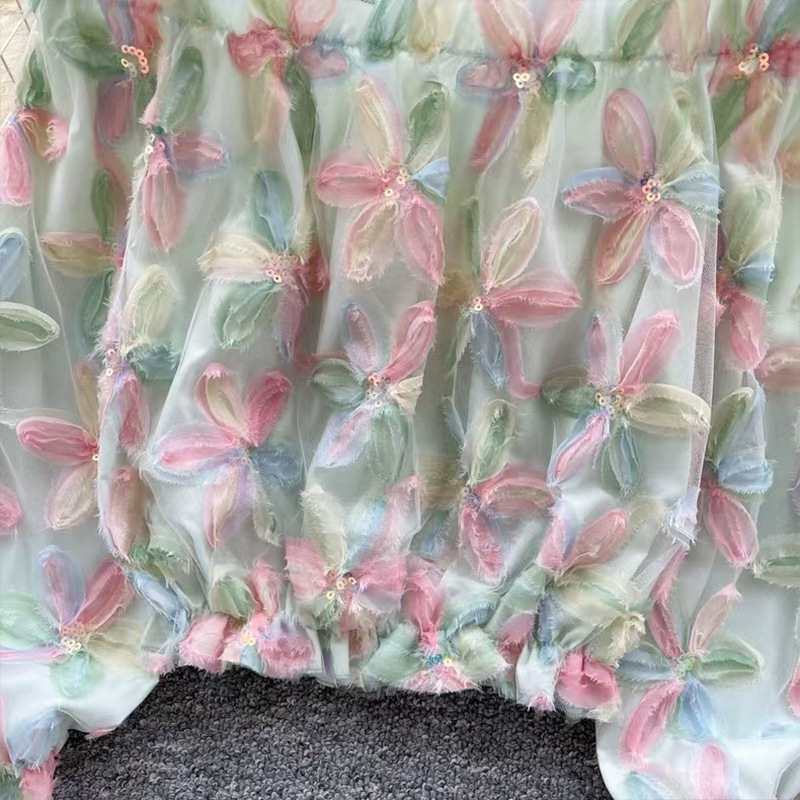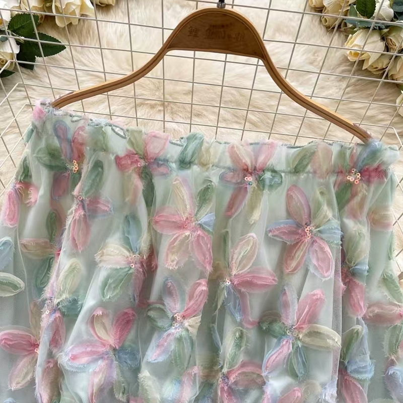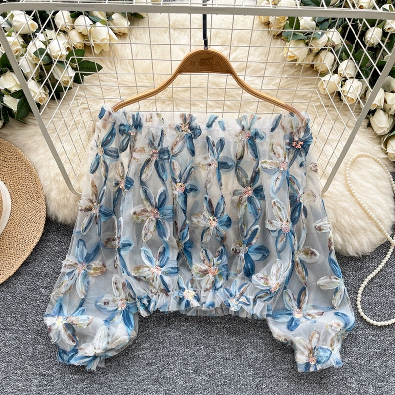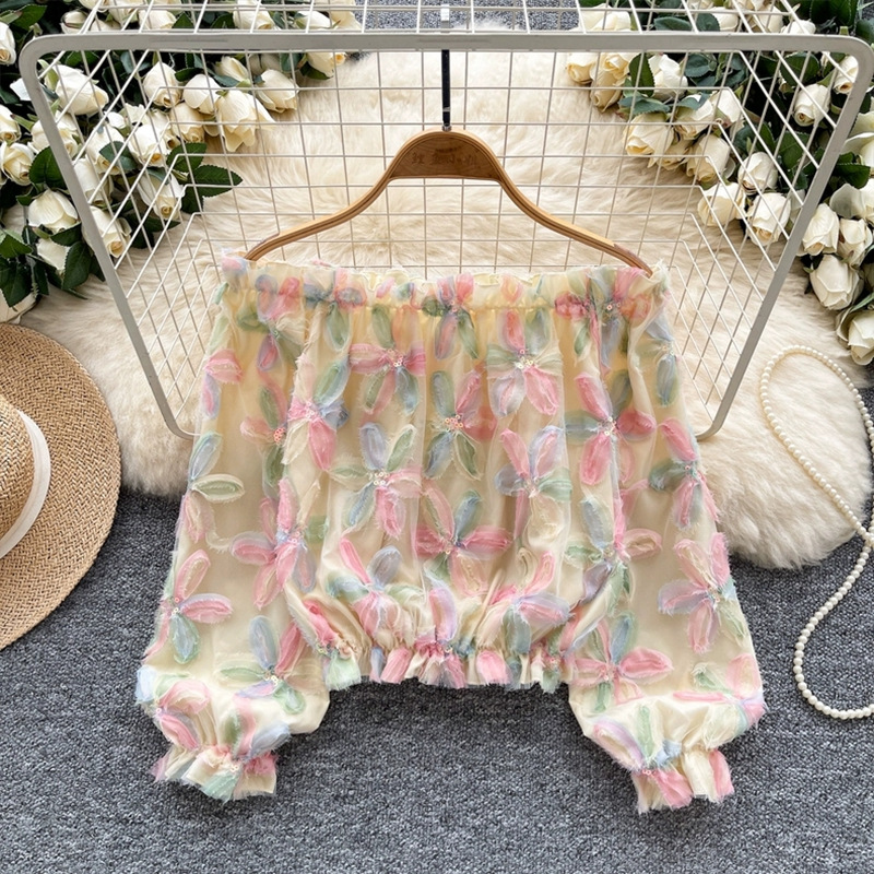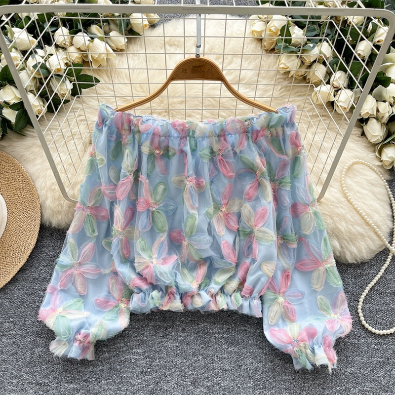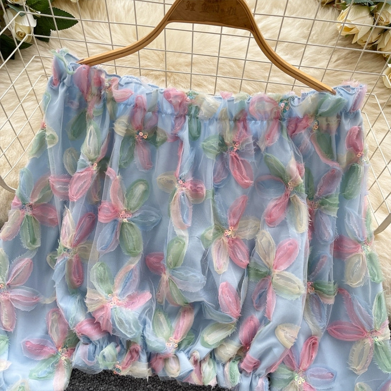 여름 패션, 부드러운 스타일, 달콤한 기질, 스팽글 입체 꽃 원 숄더 오프 숄더 쉬폰 셔츠, 여성 패션 상의