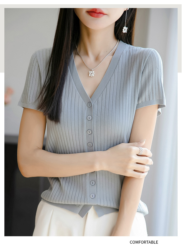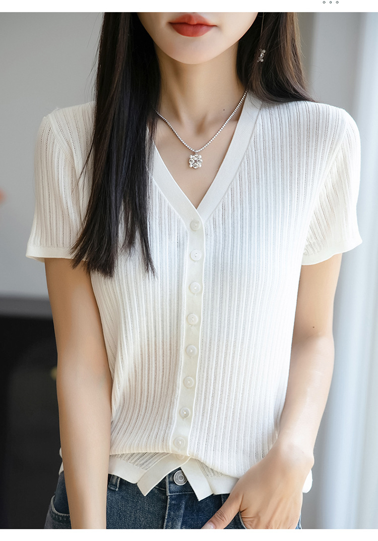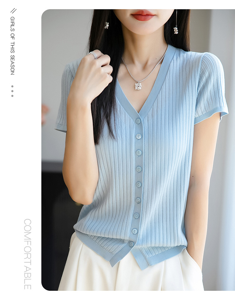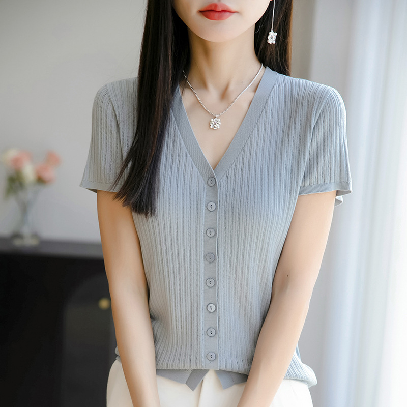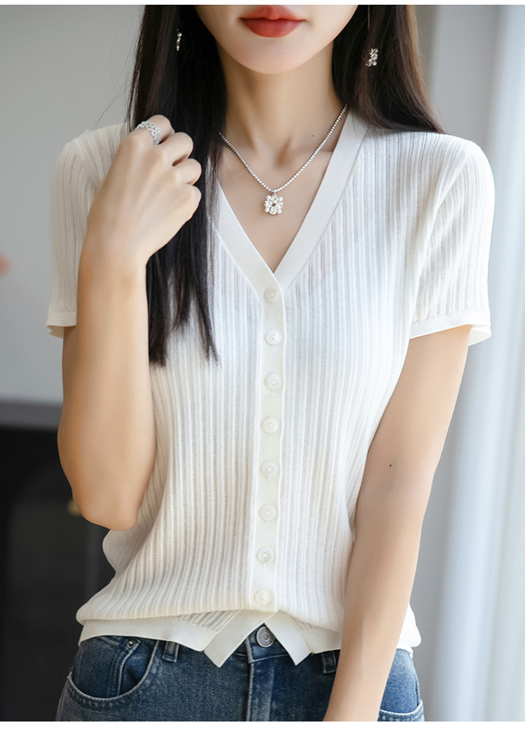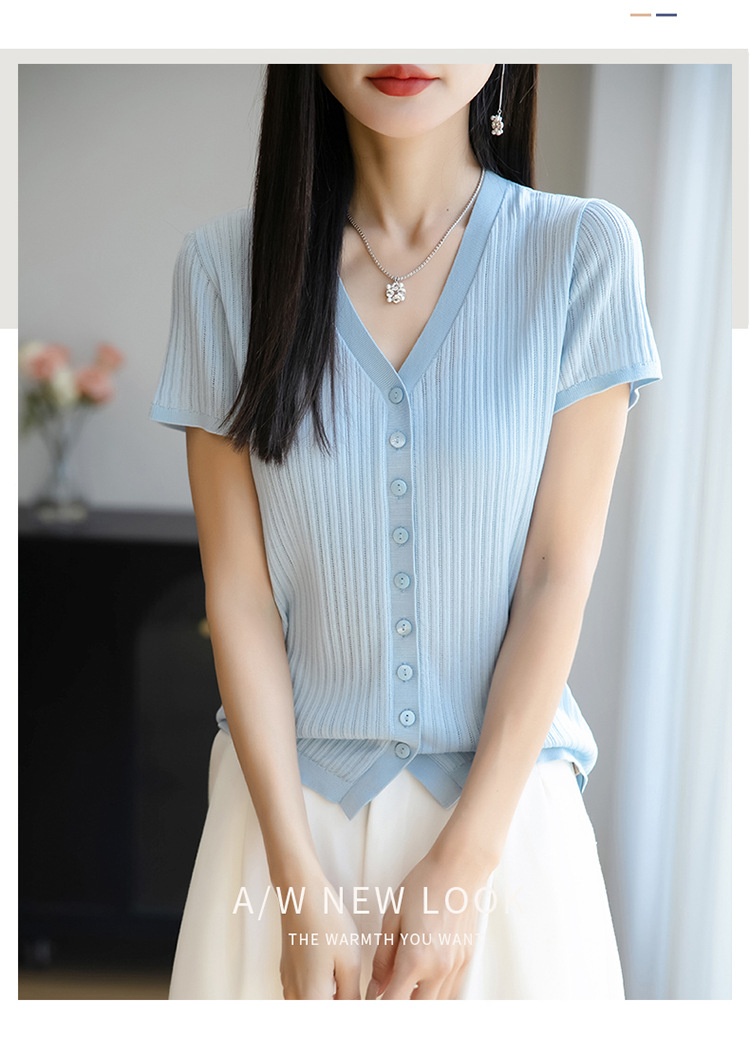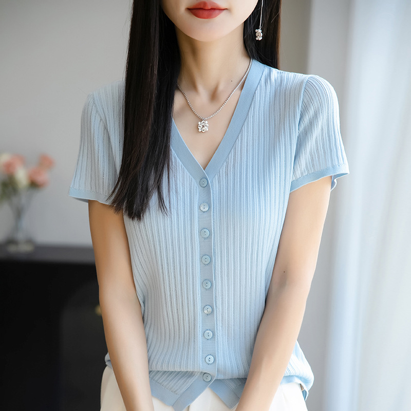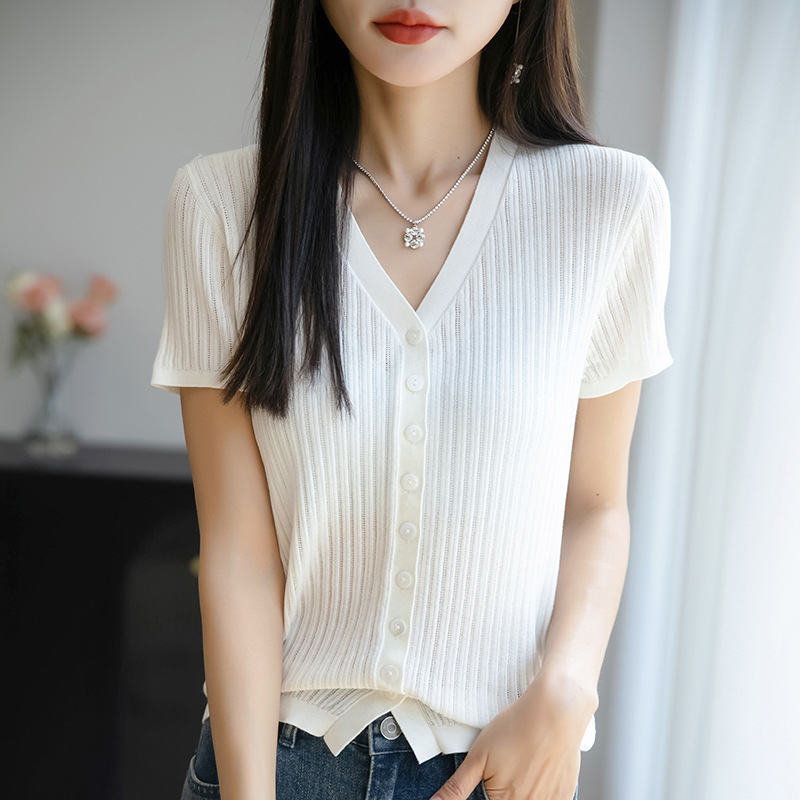 여름 새로운 Quzhu V 넥 반팔 카디건 여성 솔리드 컬러 올 매치 우아한 니트 스웨터 2025 얇은 패션 탑