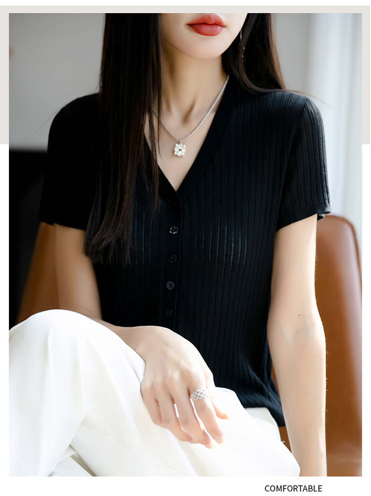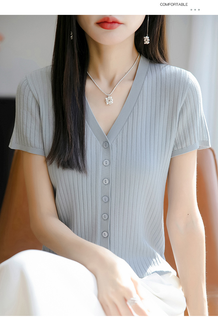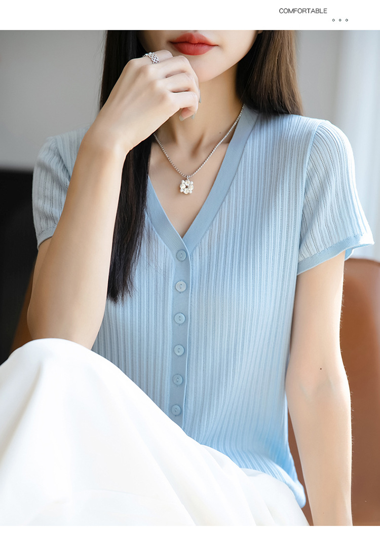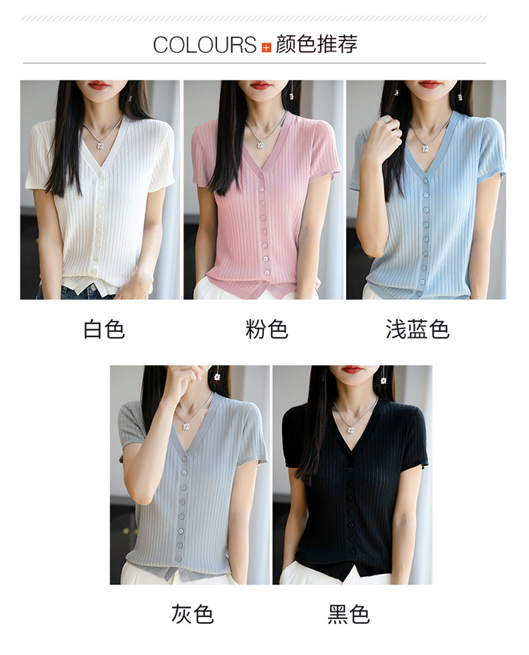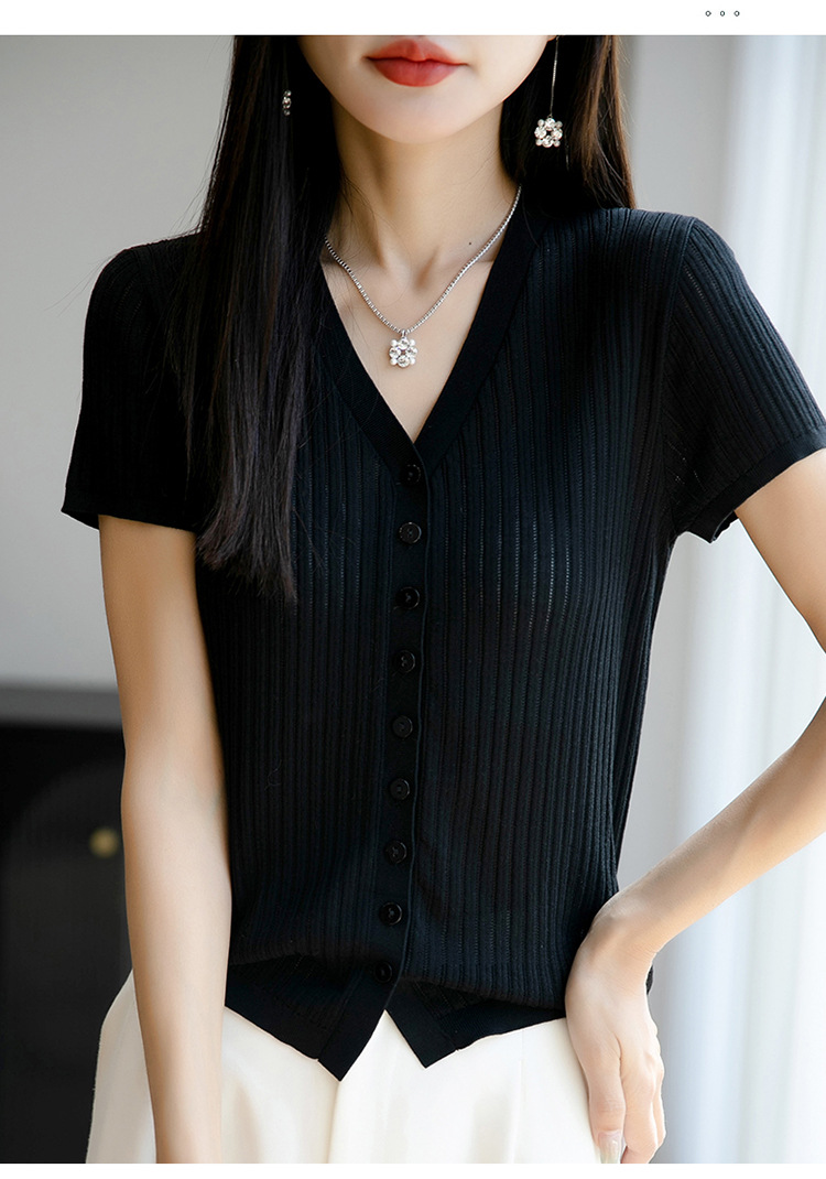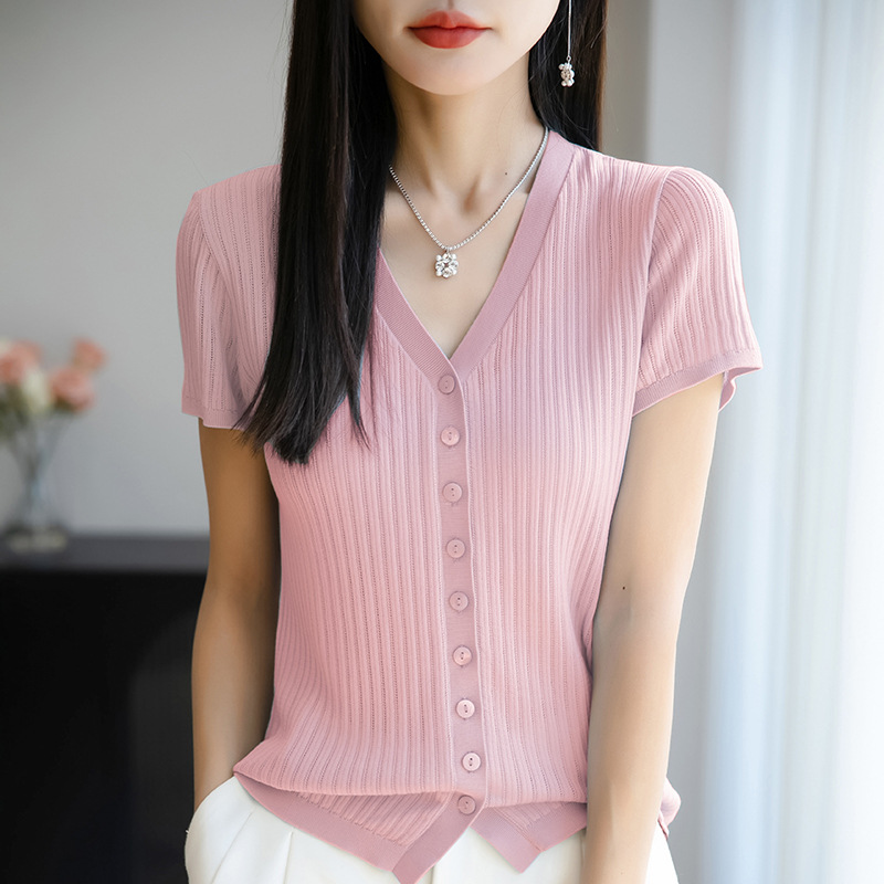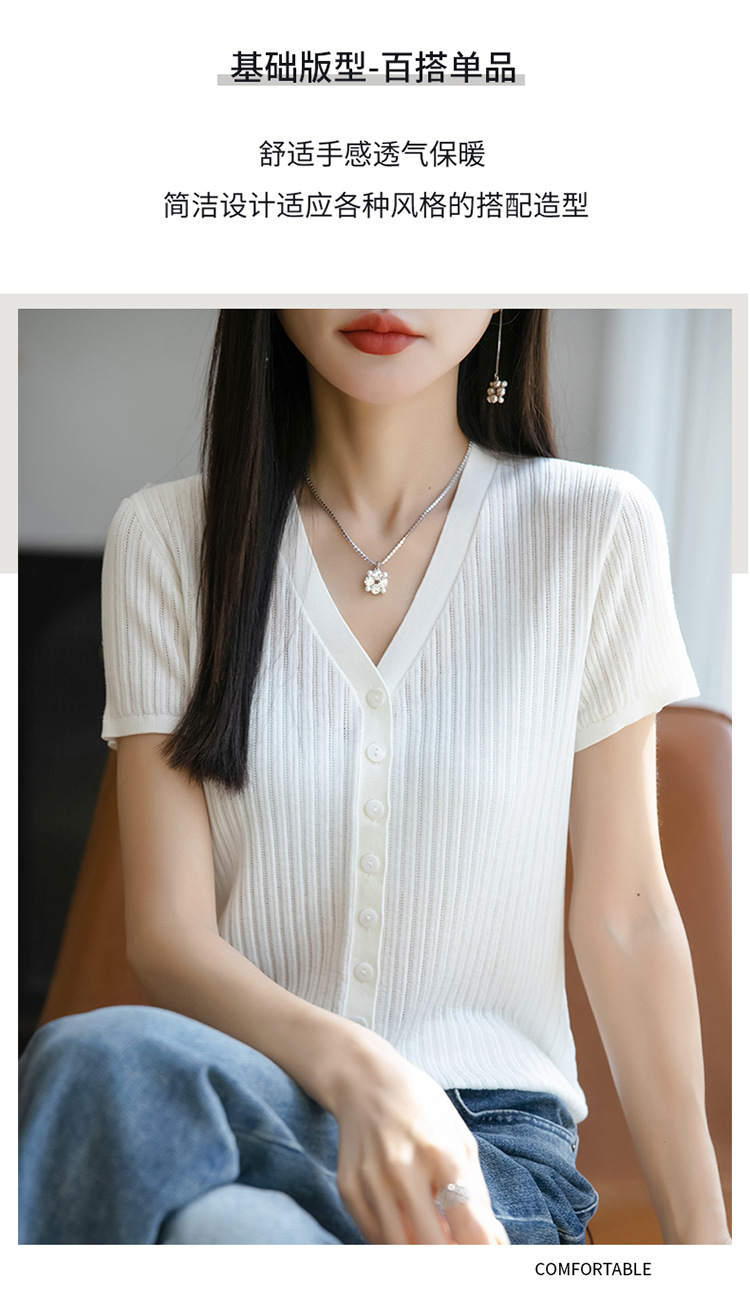 여름 새로운 Quzhu V 넥 반팔 카디건 여성 솔리드 컬러 올 매치 우아한 니트 스웨터 2025 얇은 패션 탑