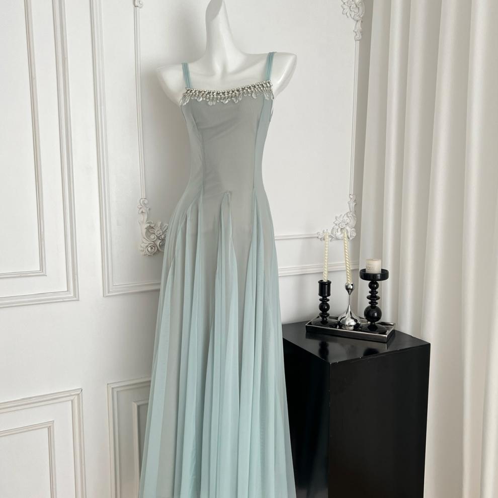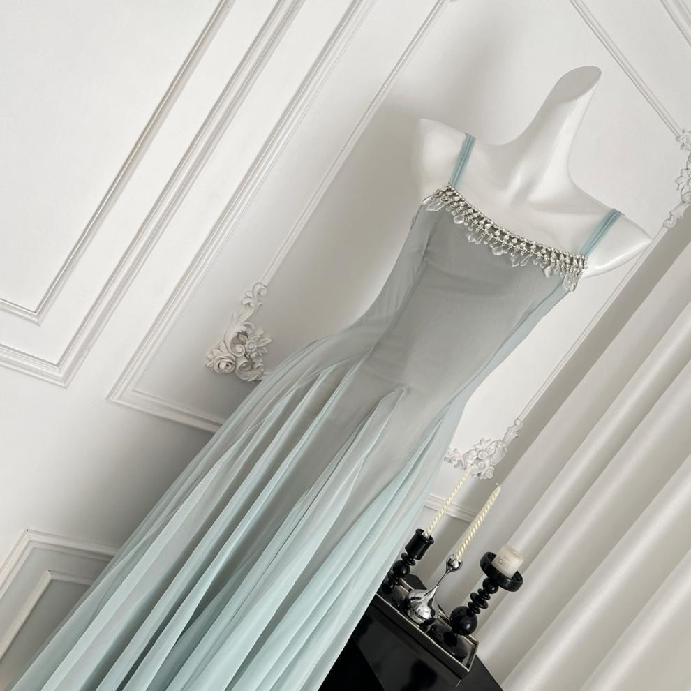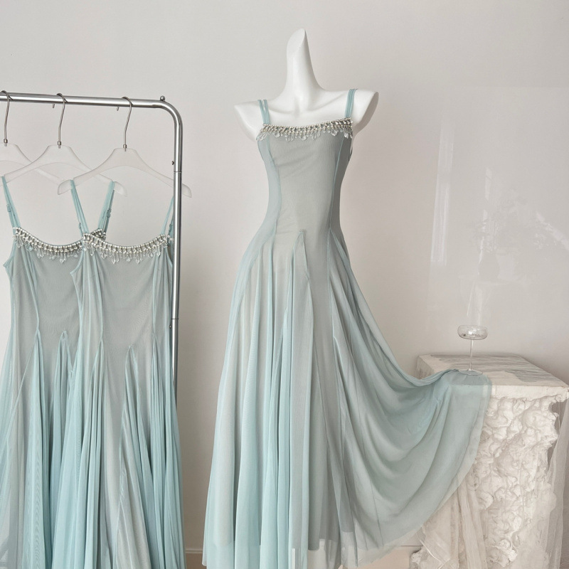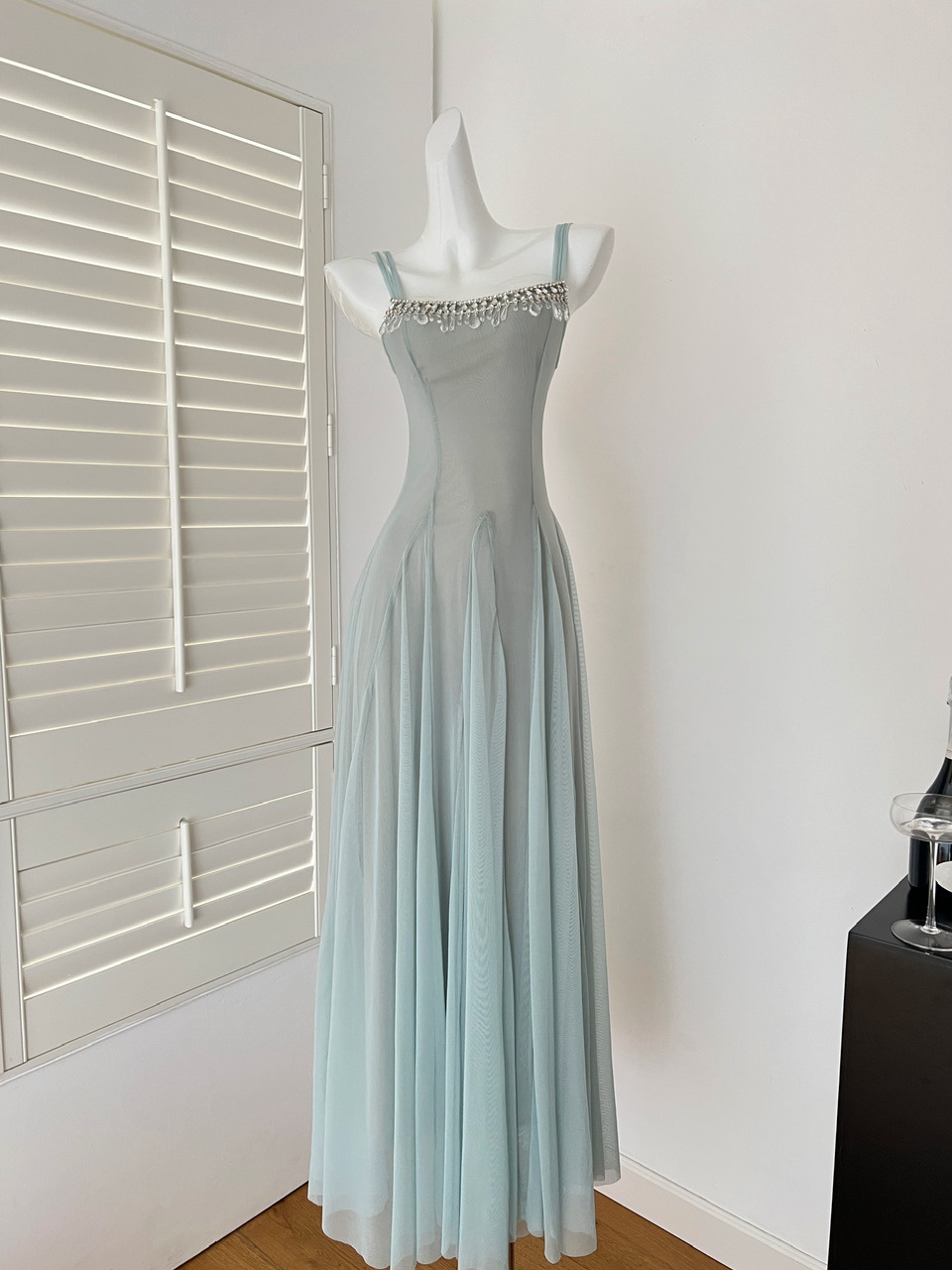 여름 슬림핏 크리스탈 체인 망사 롱 드레스 패셔너블한 스타일 2025 신상