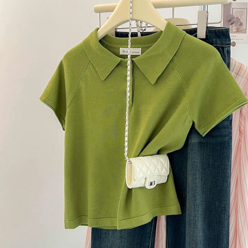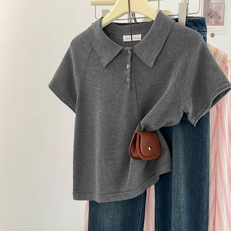 코튼 칼라 반팔 여성용 루즈한 한국식 하이엔드 심플 라펠 오른쪽 어깨 버튼 탑 캐주얼하고 다재다능함스토어 가기