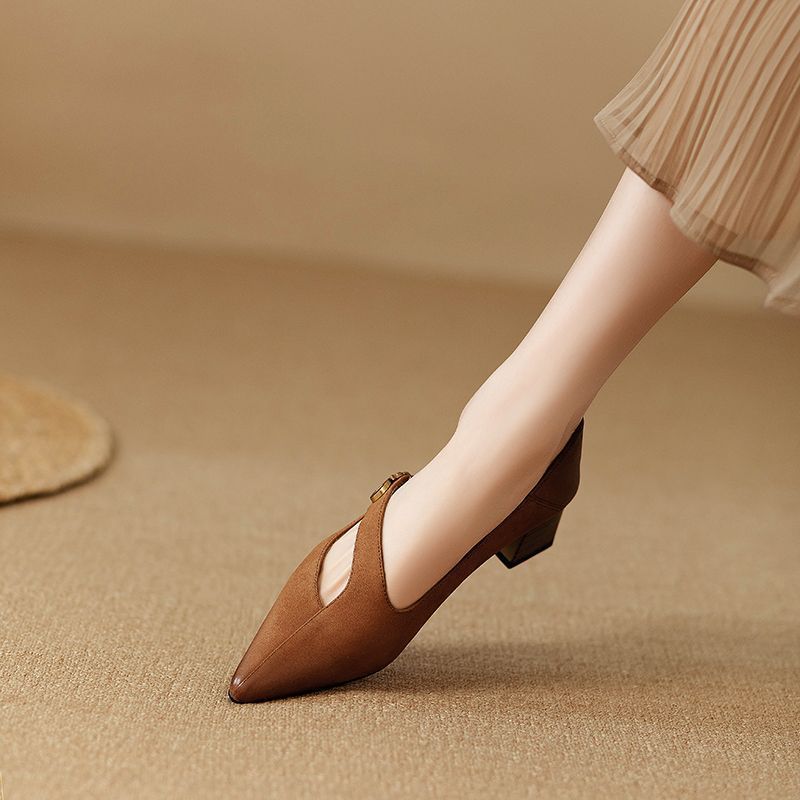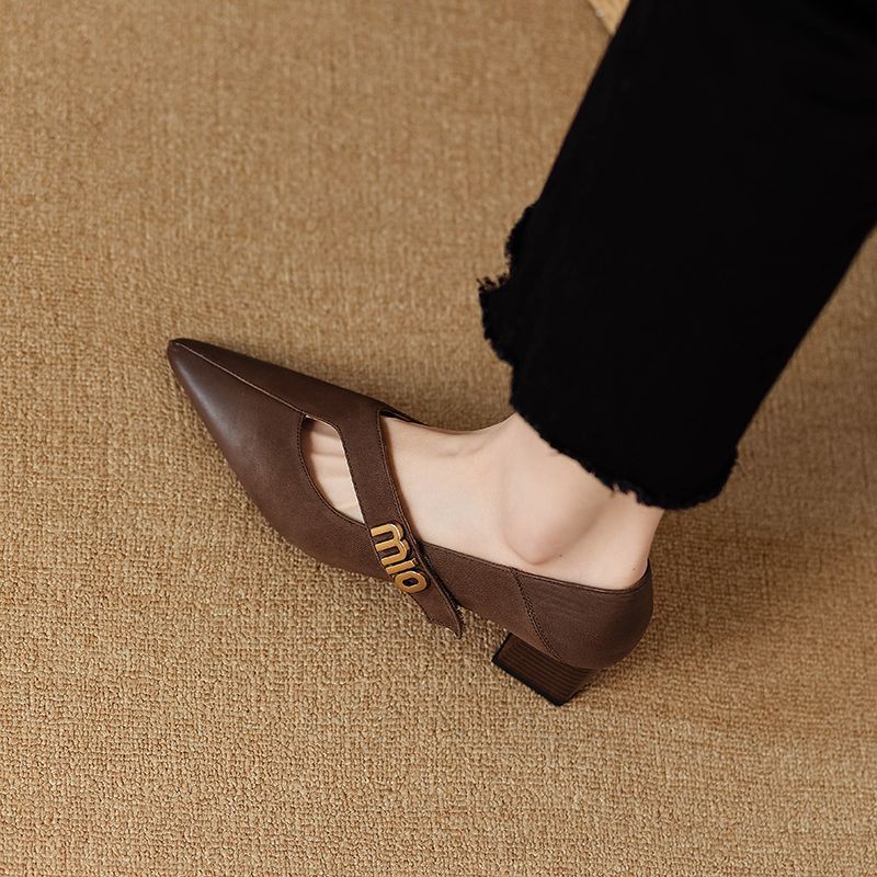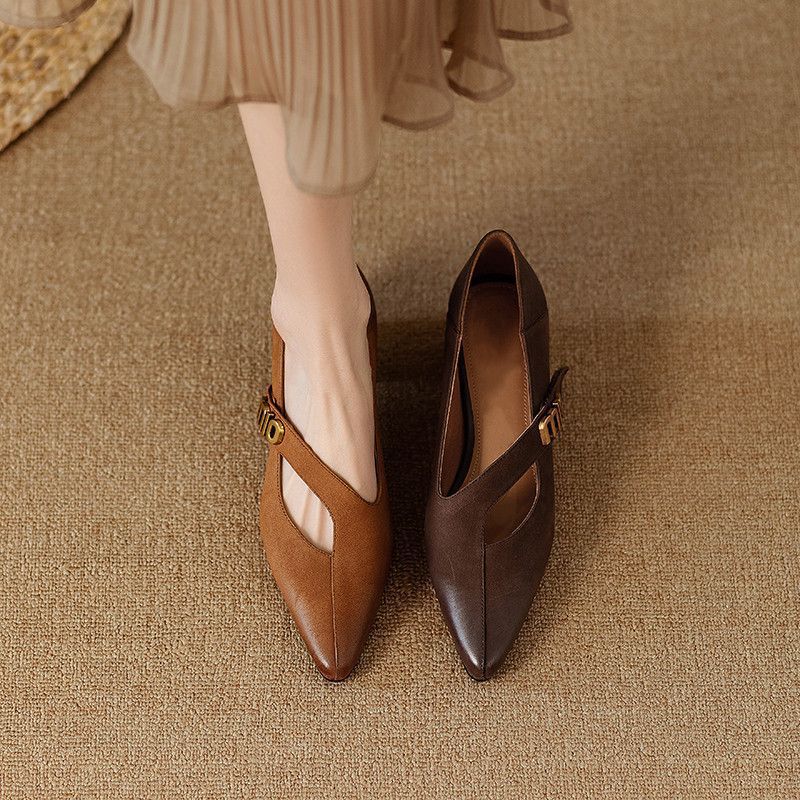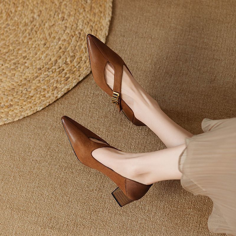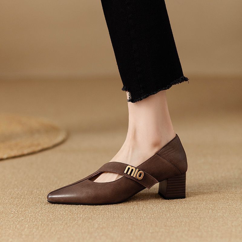 여성을위한 복고풍 부드러운 가죽 두꺼운 굽 펌프 신발 2025 봄과 가을 새로운 스타일 뾰족한 발가락 중간 굽 프랑스 스타일 다목적 편안한 부드러운 가죽 신발스토어 가기