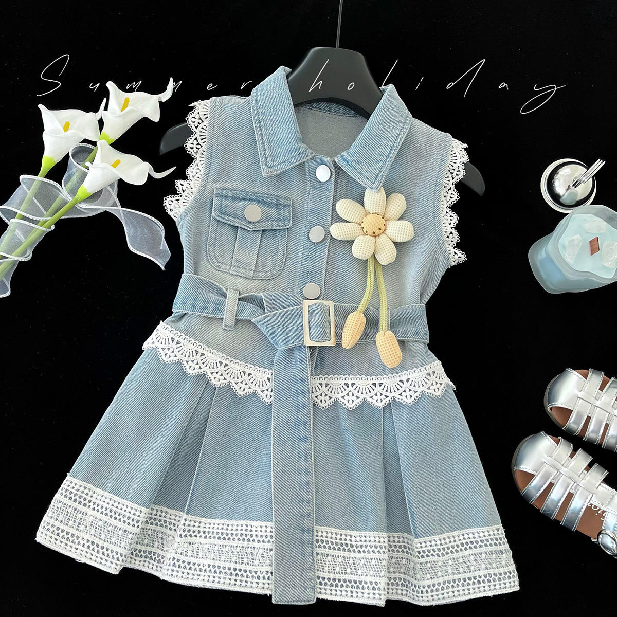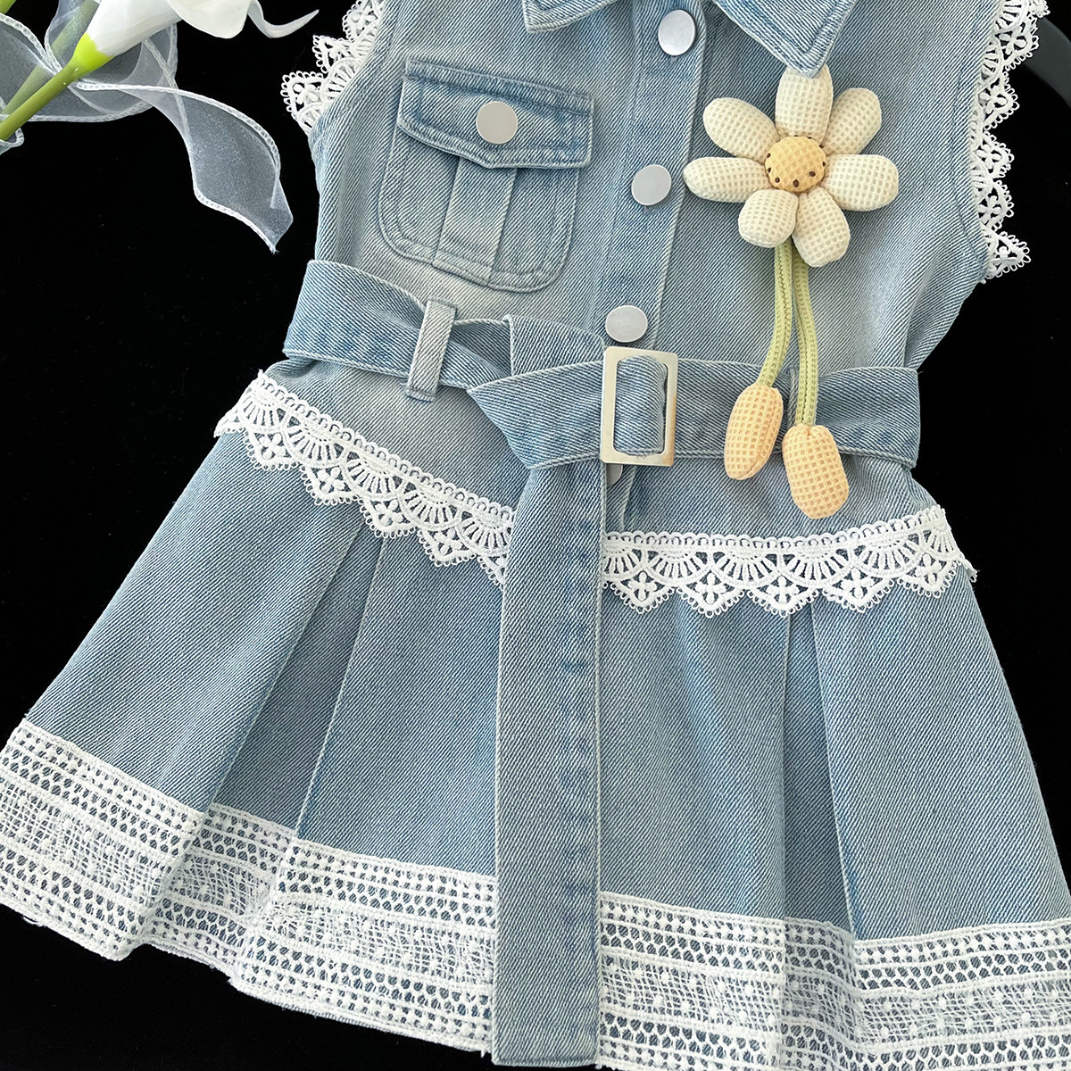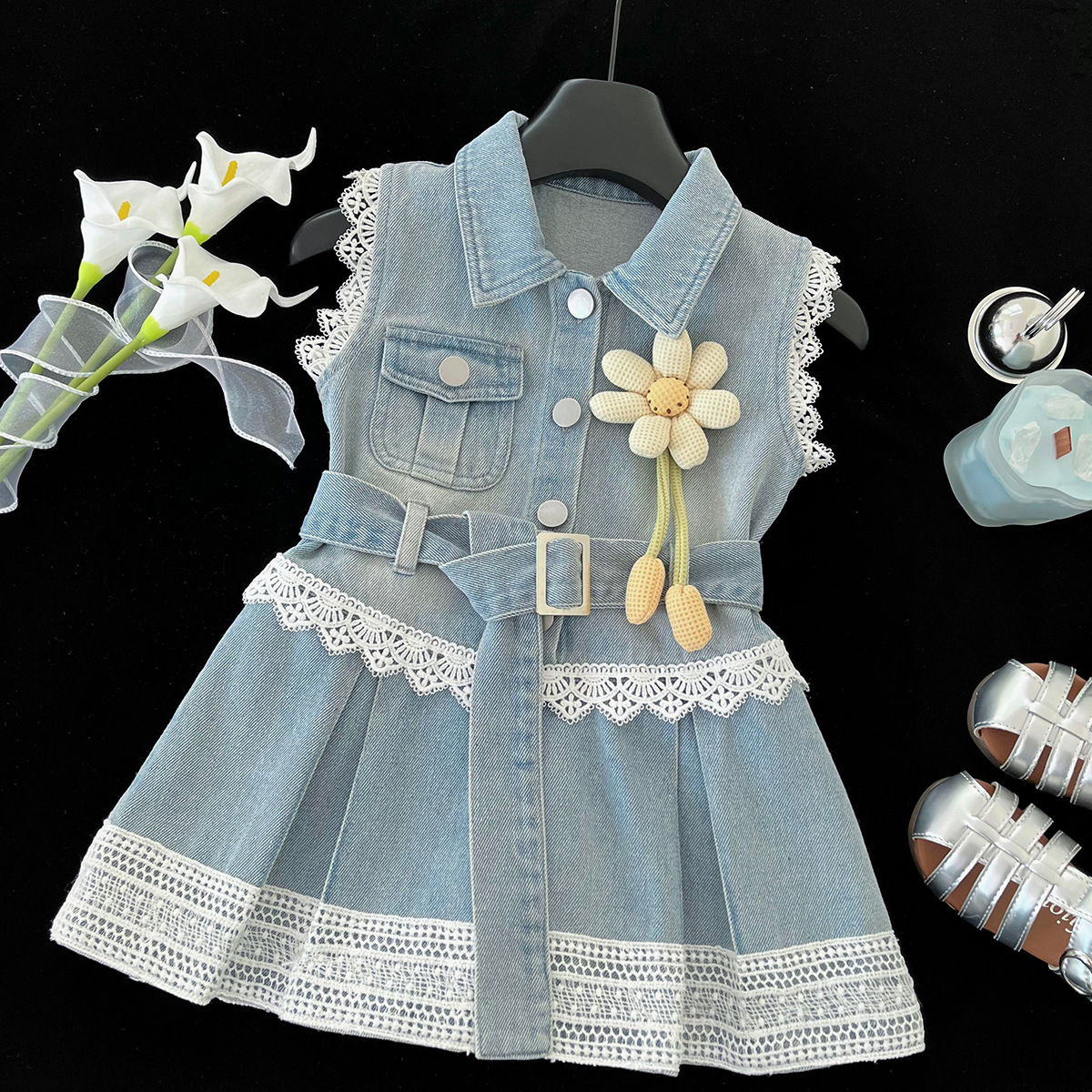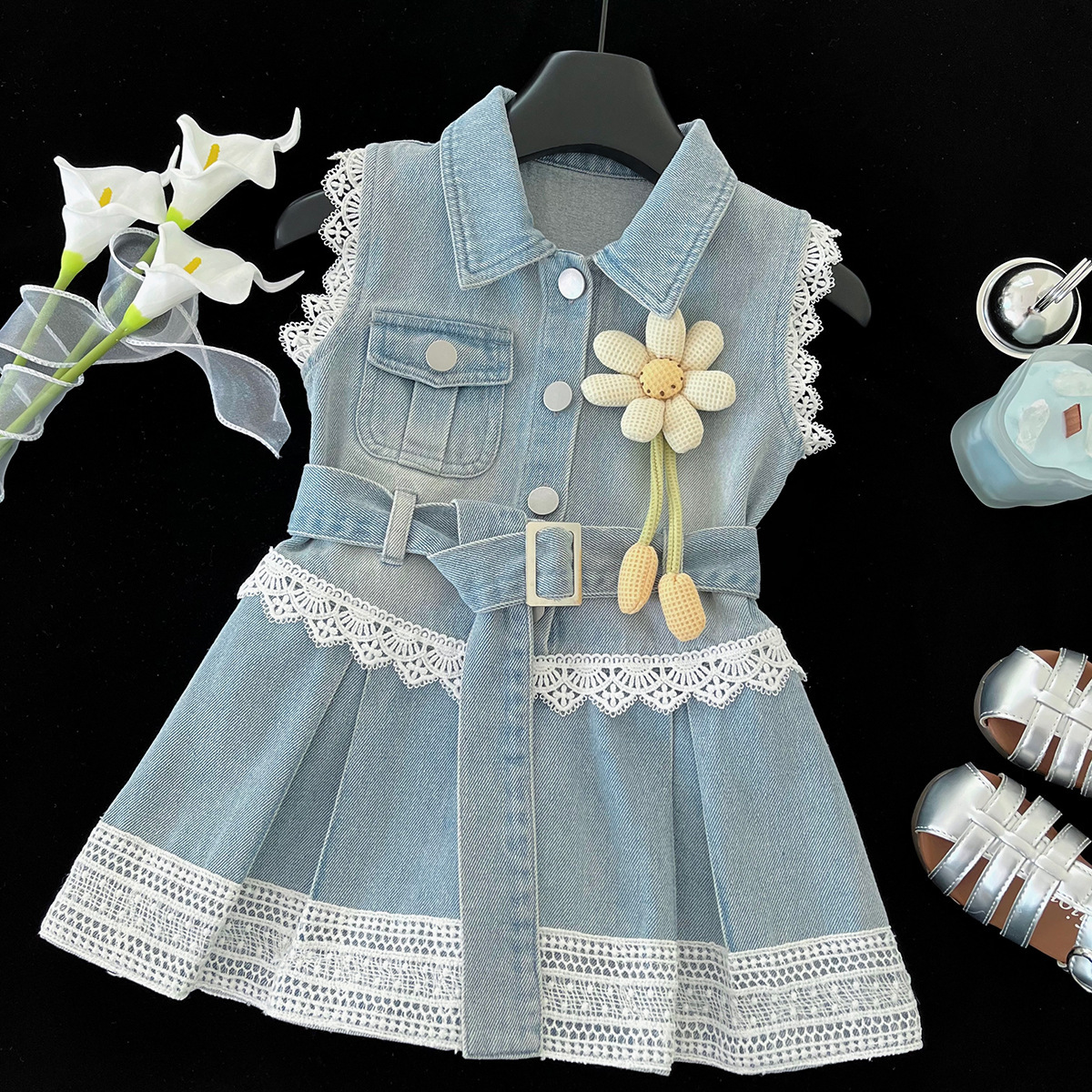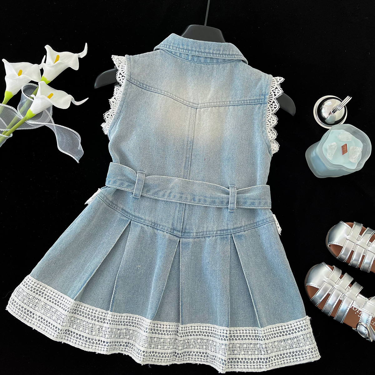 2025 새로운 여자 아기 여름 데님 드레스 유행 어린이 레이스 스플 라이스 데님 드레스 유행