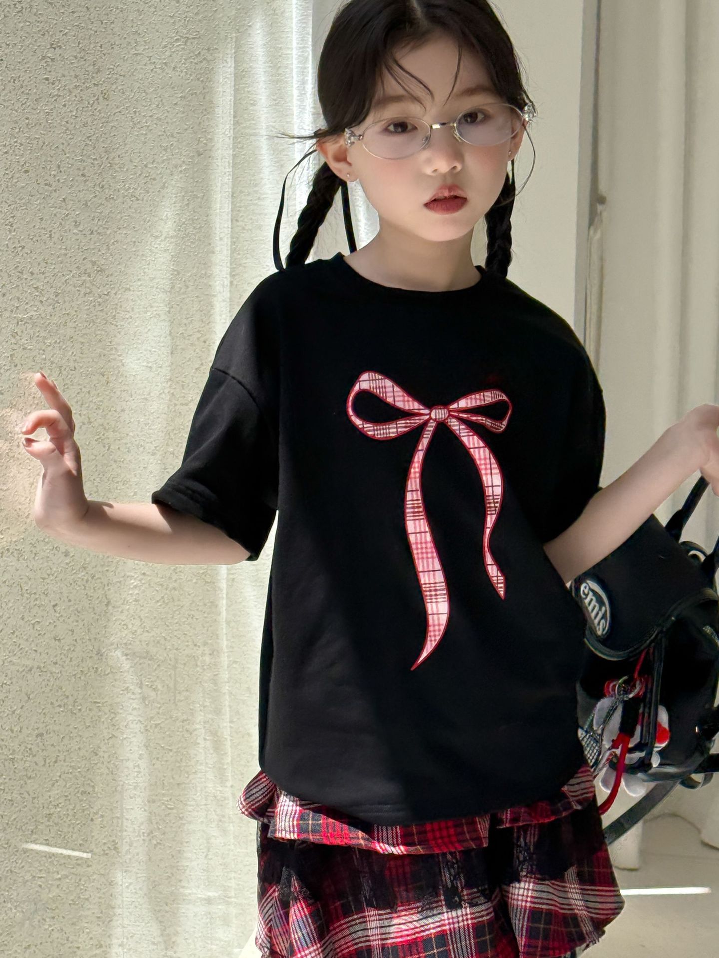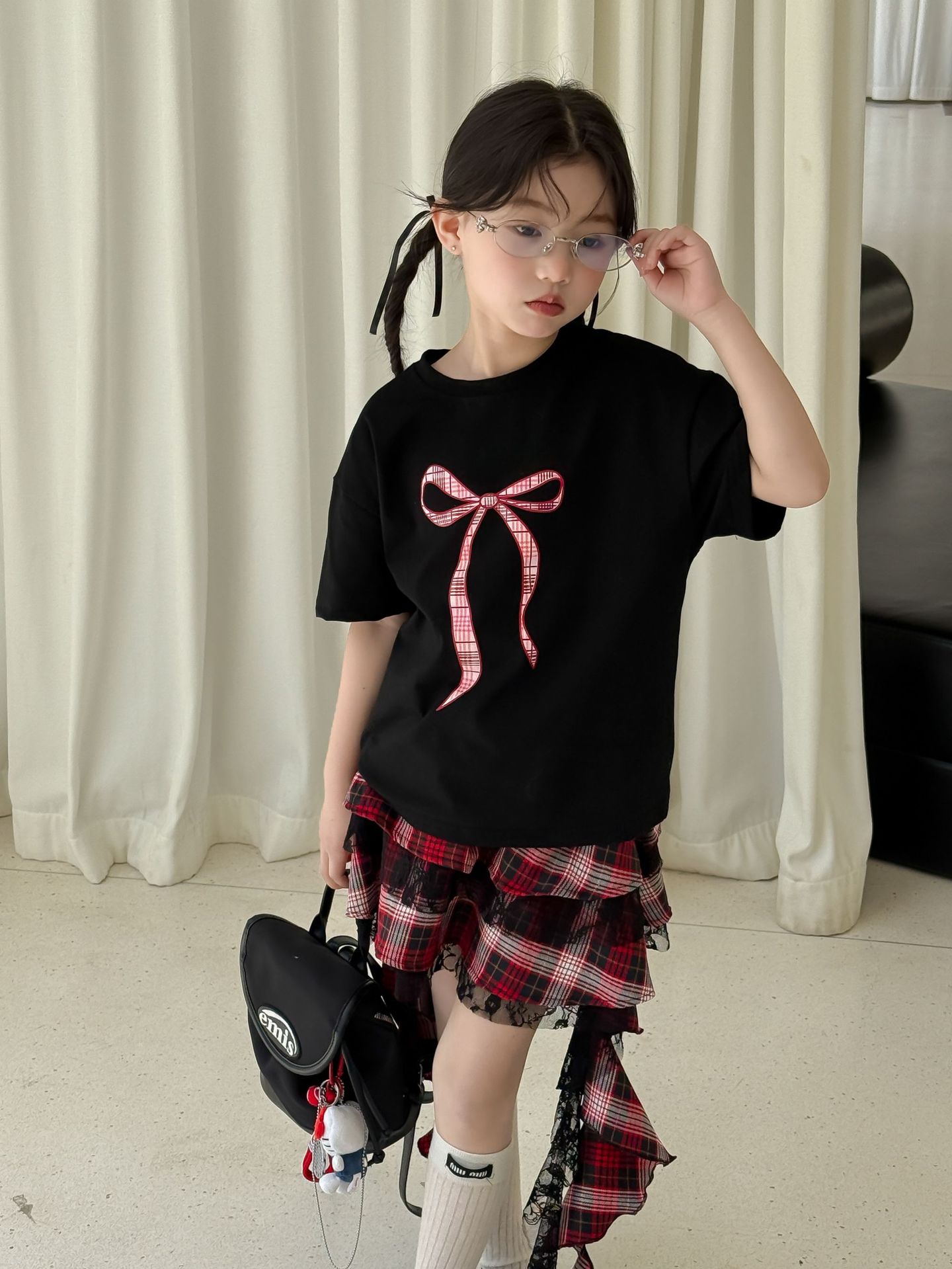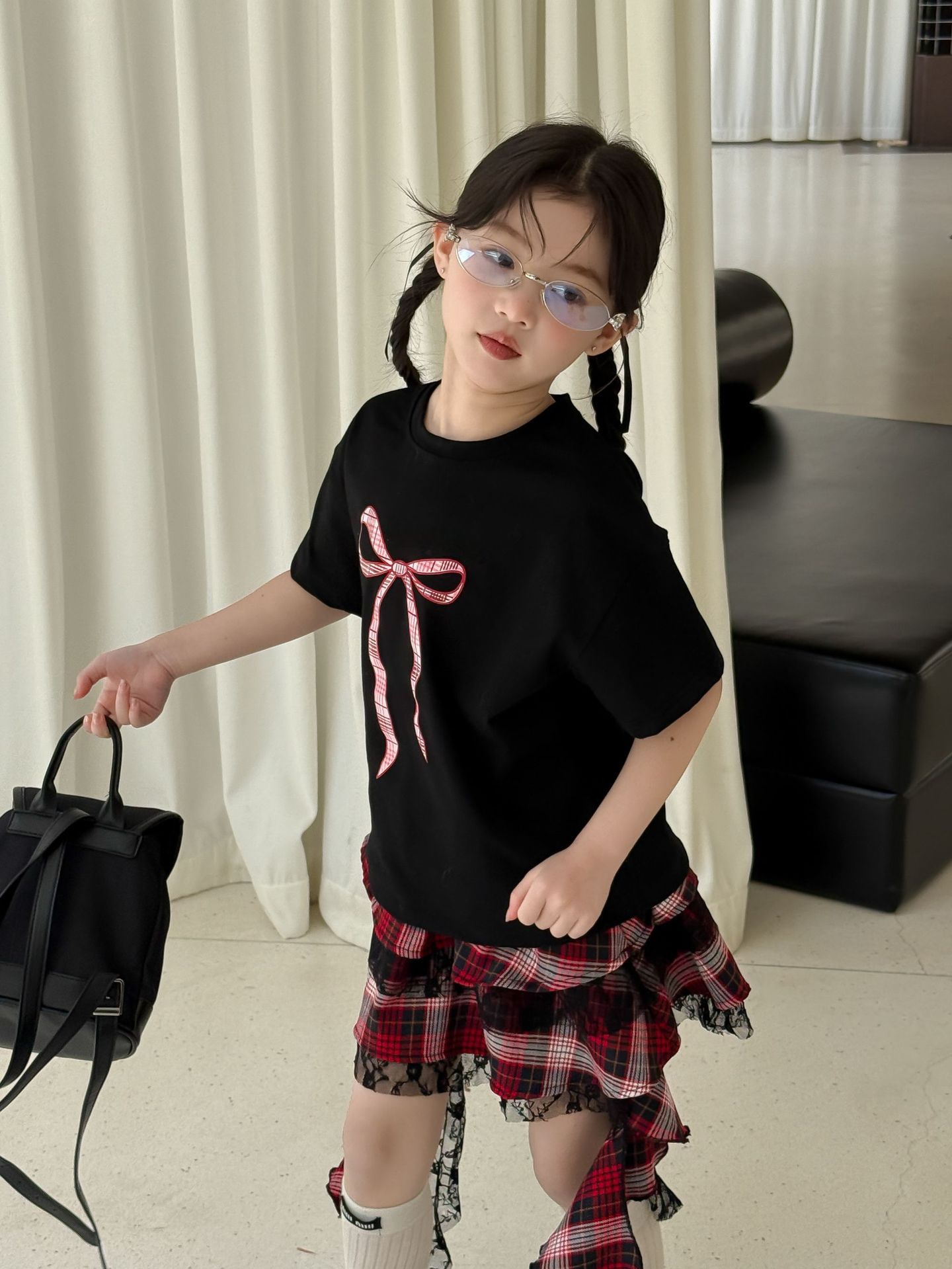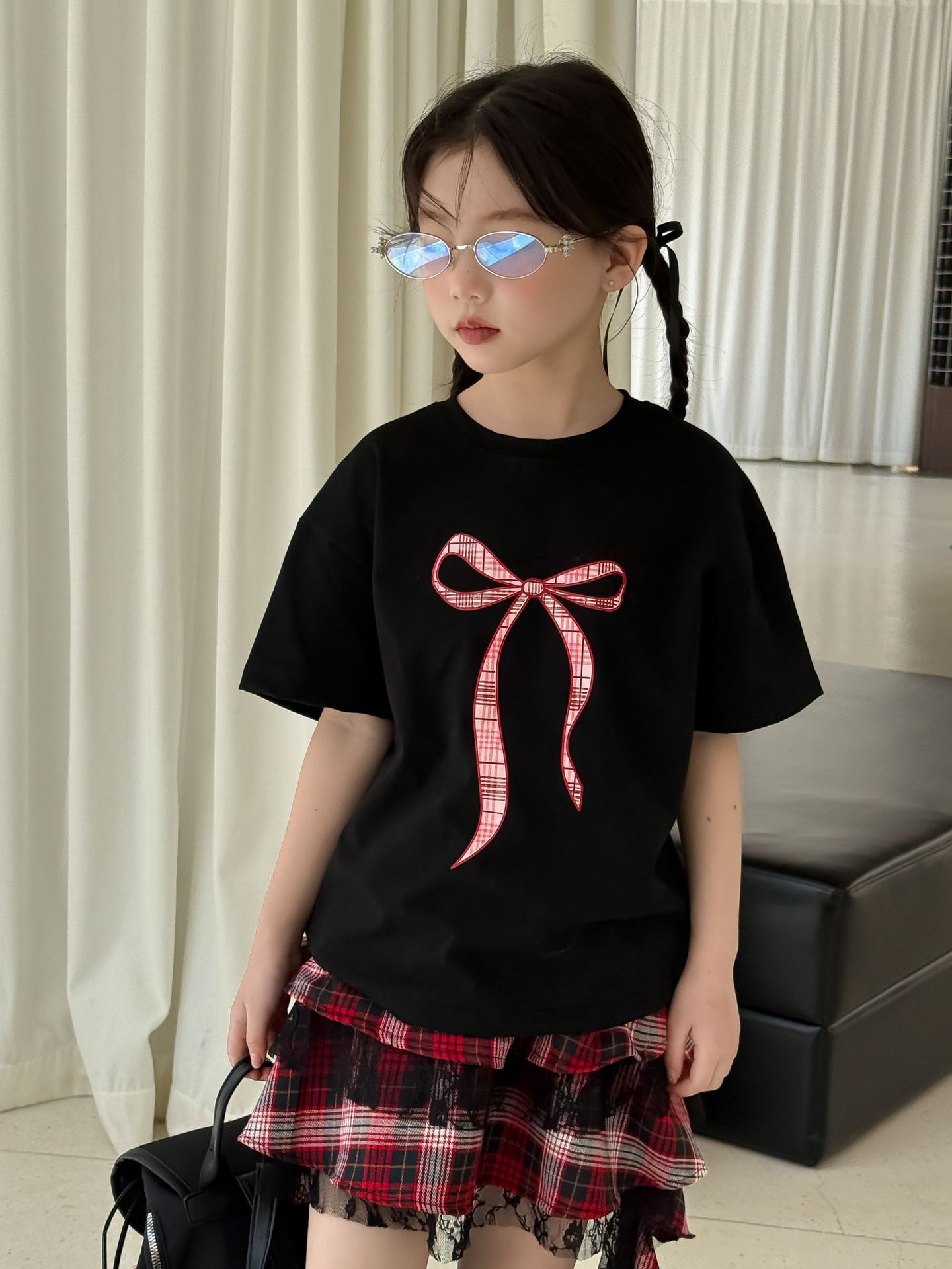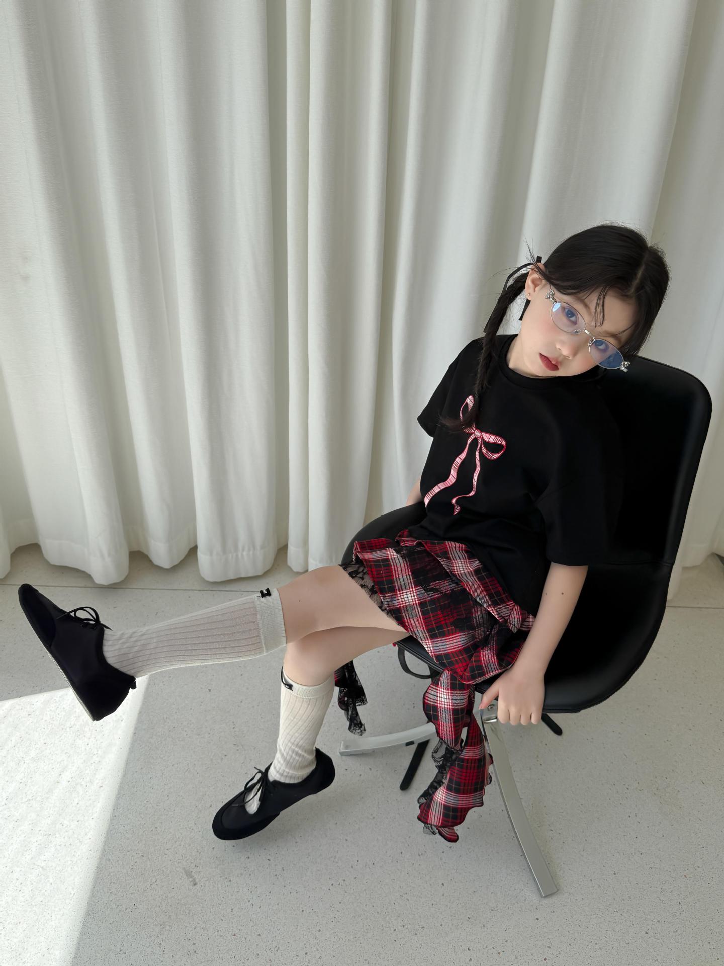 어린이 치마 2025 여름 새로운 소녀 디자인 센스 레드 체크 무늬 주름 케이크 스커트 소녀의 세련된 레이스 스커트스토어 가기