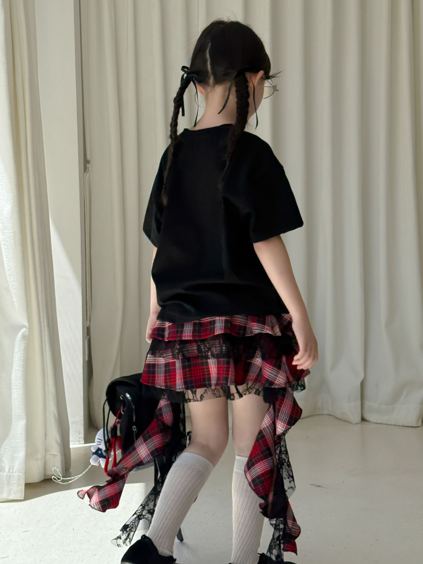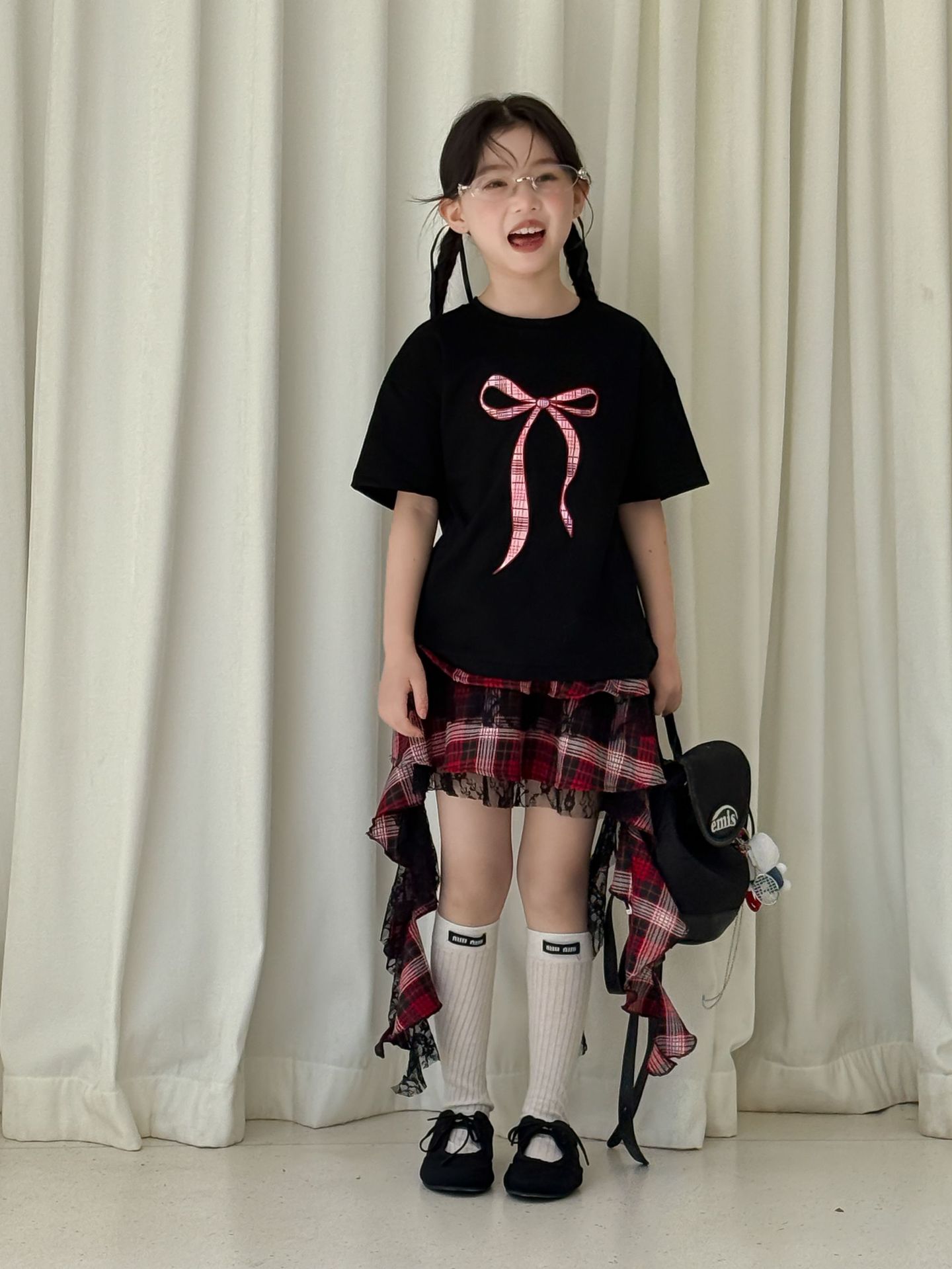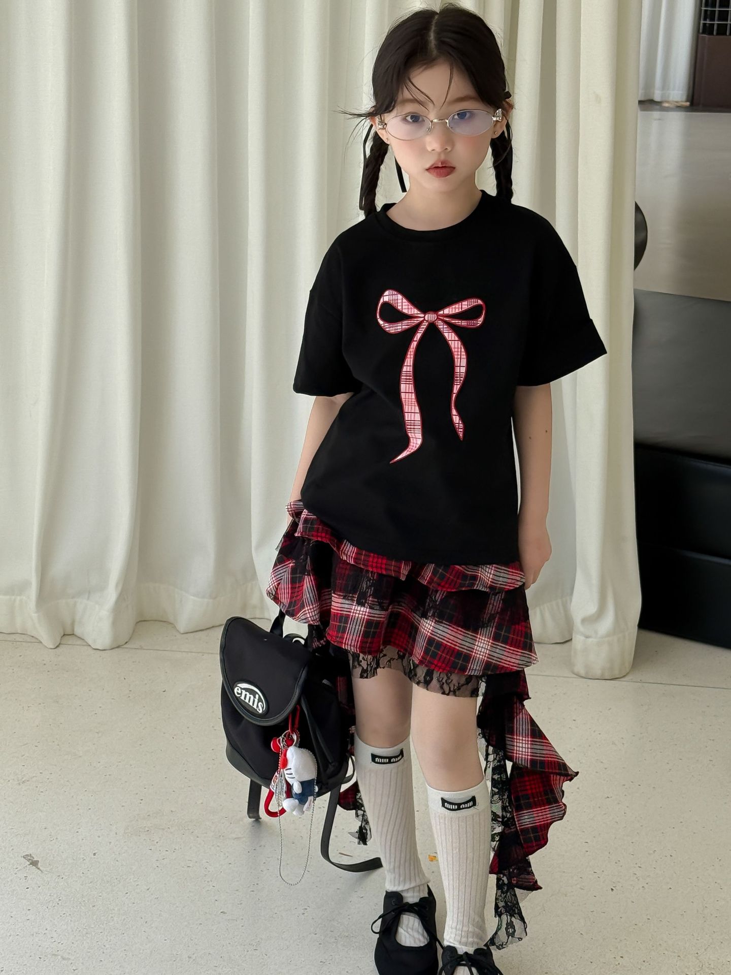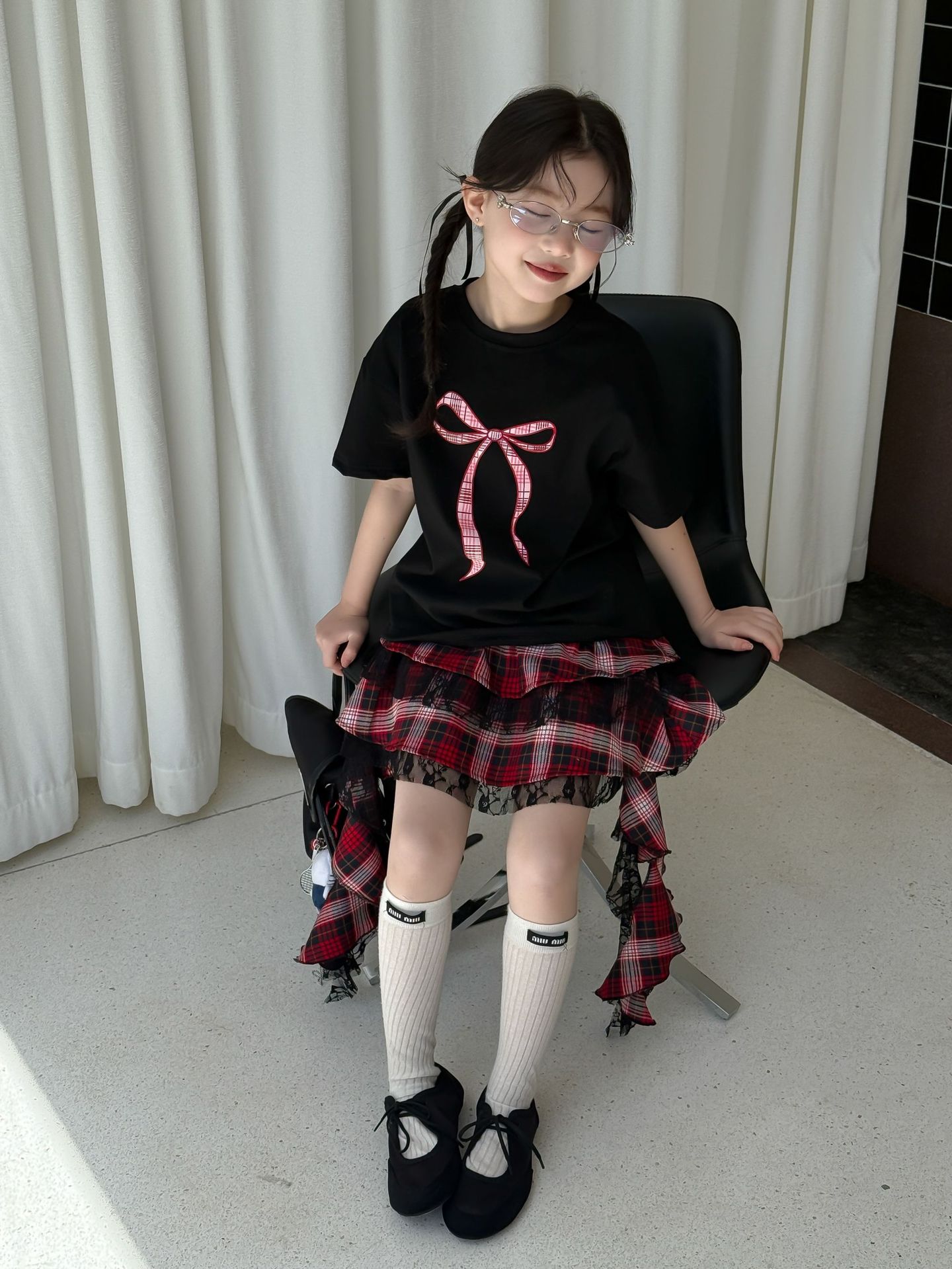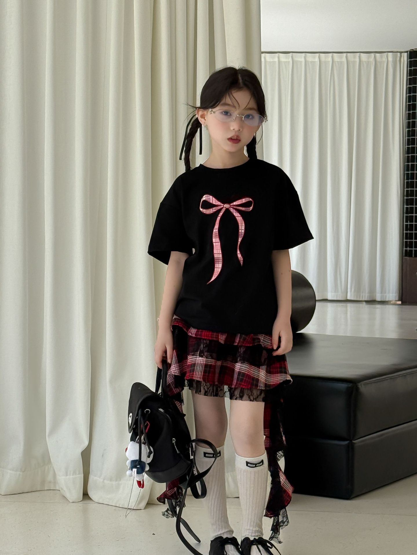 어린이 치마 2025 여름 새로운 소녀 디자인 센스 레드 체크 무늬 주름 케이크 스커트 소녀의 세련된 레이스 스커트스토어 가기