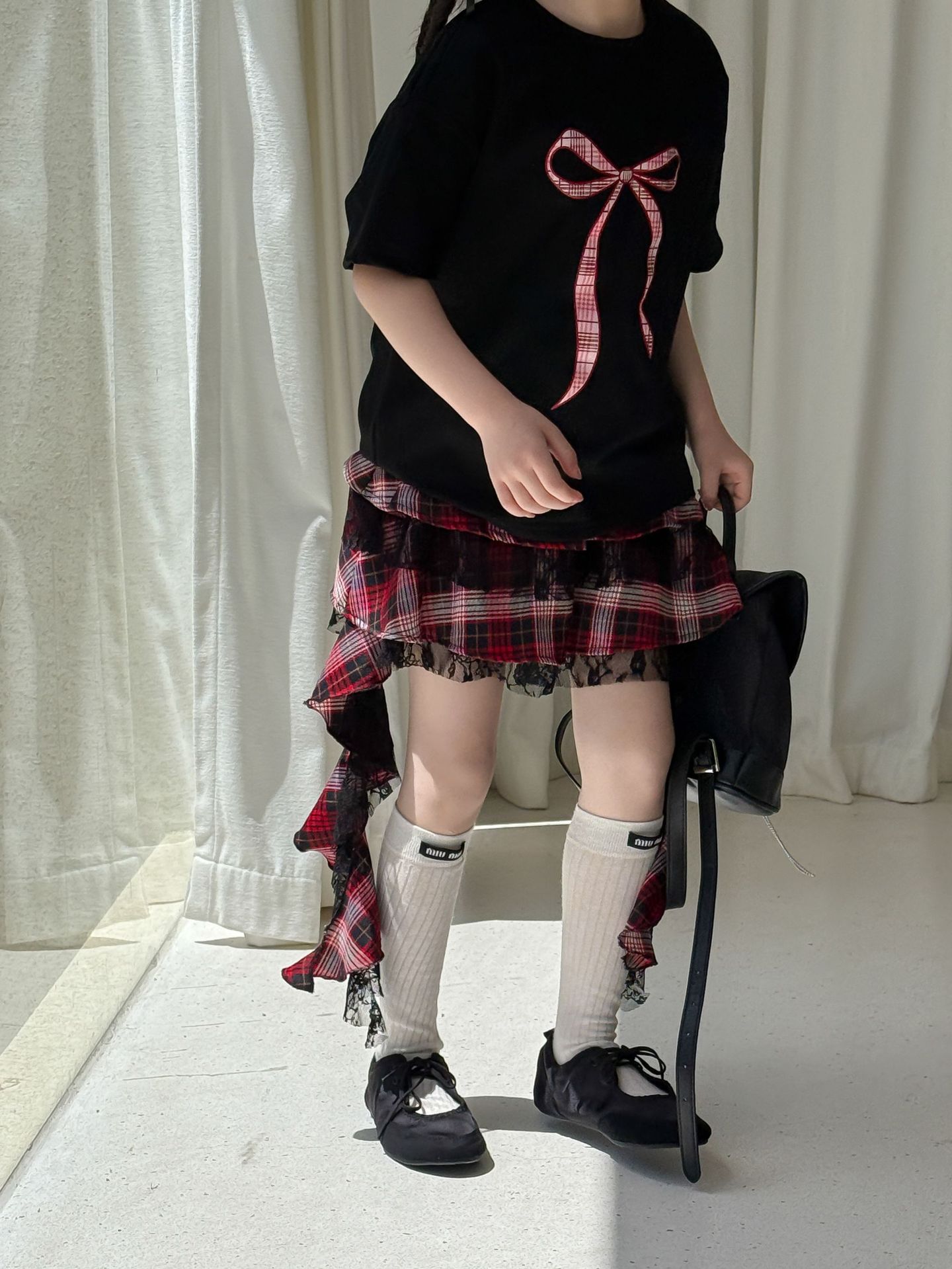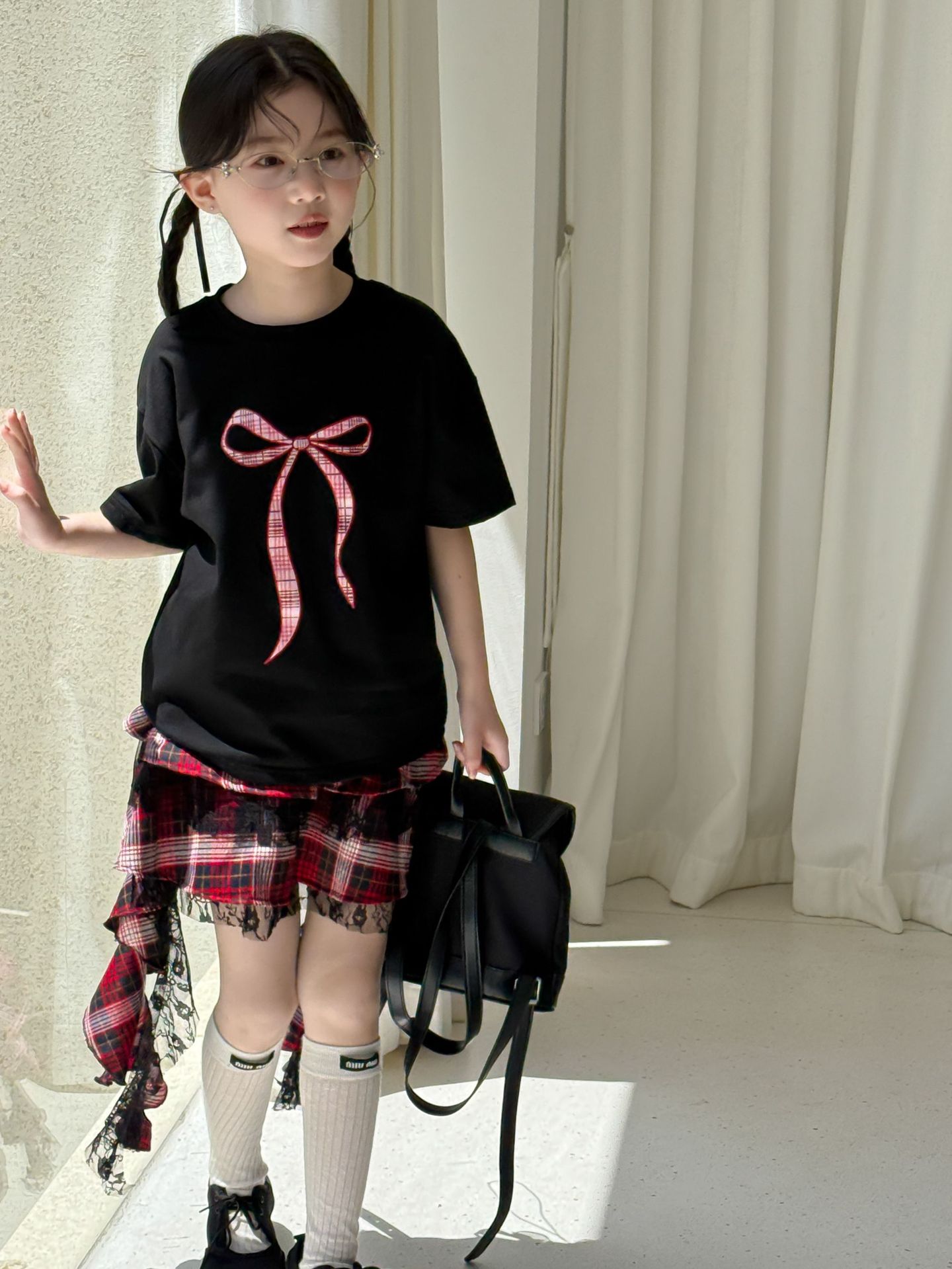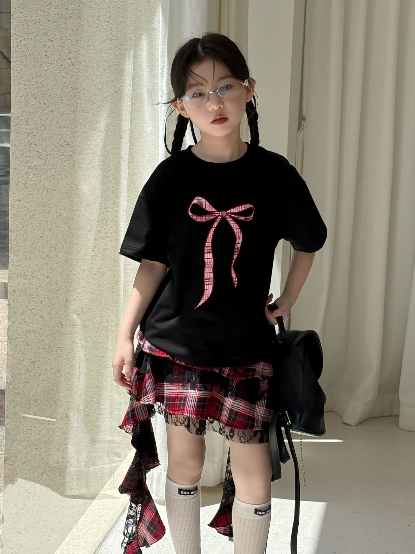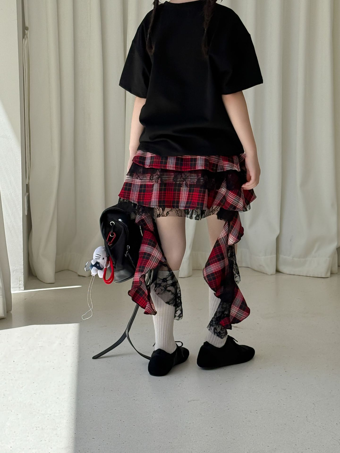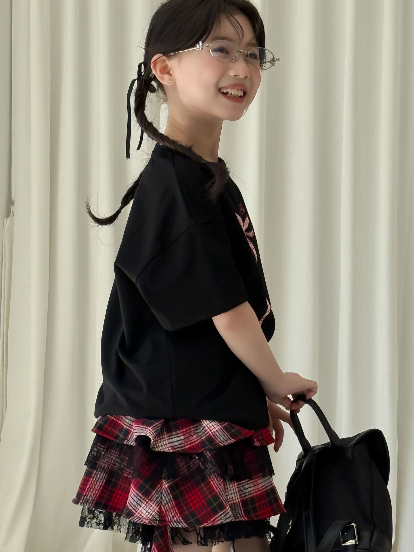 어린이 치마 2025 여름 새로운 소녀 디자인 센스 레드 체크 무늬 주름 케이크 스커트 소녀의 세련된 레이스 스커트스토어 가기