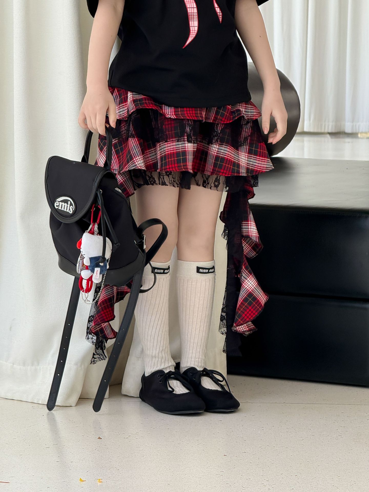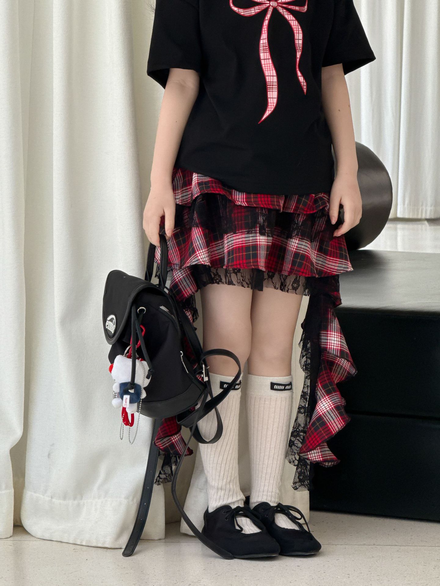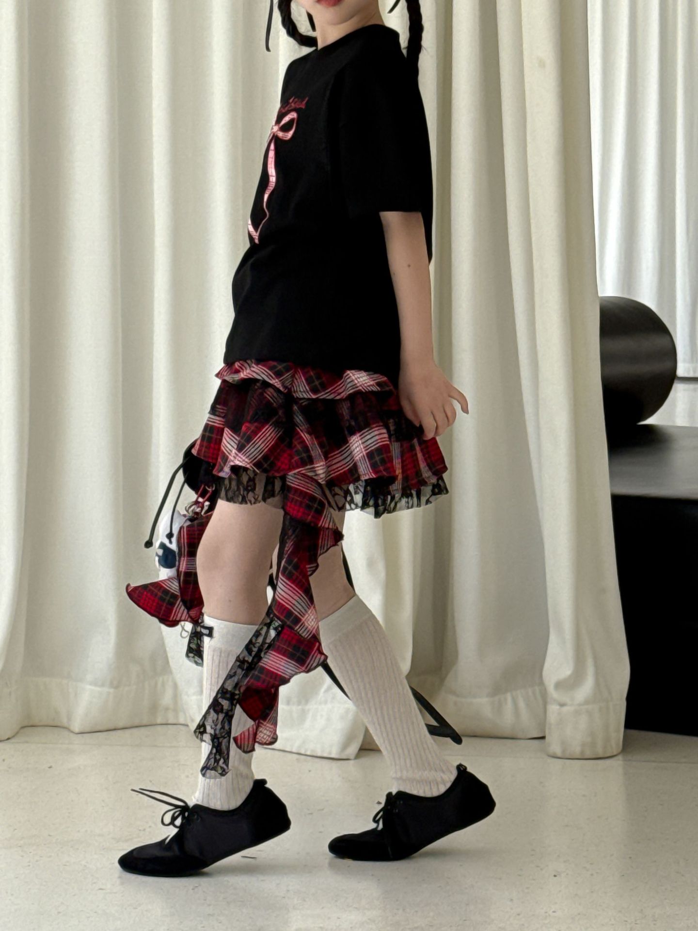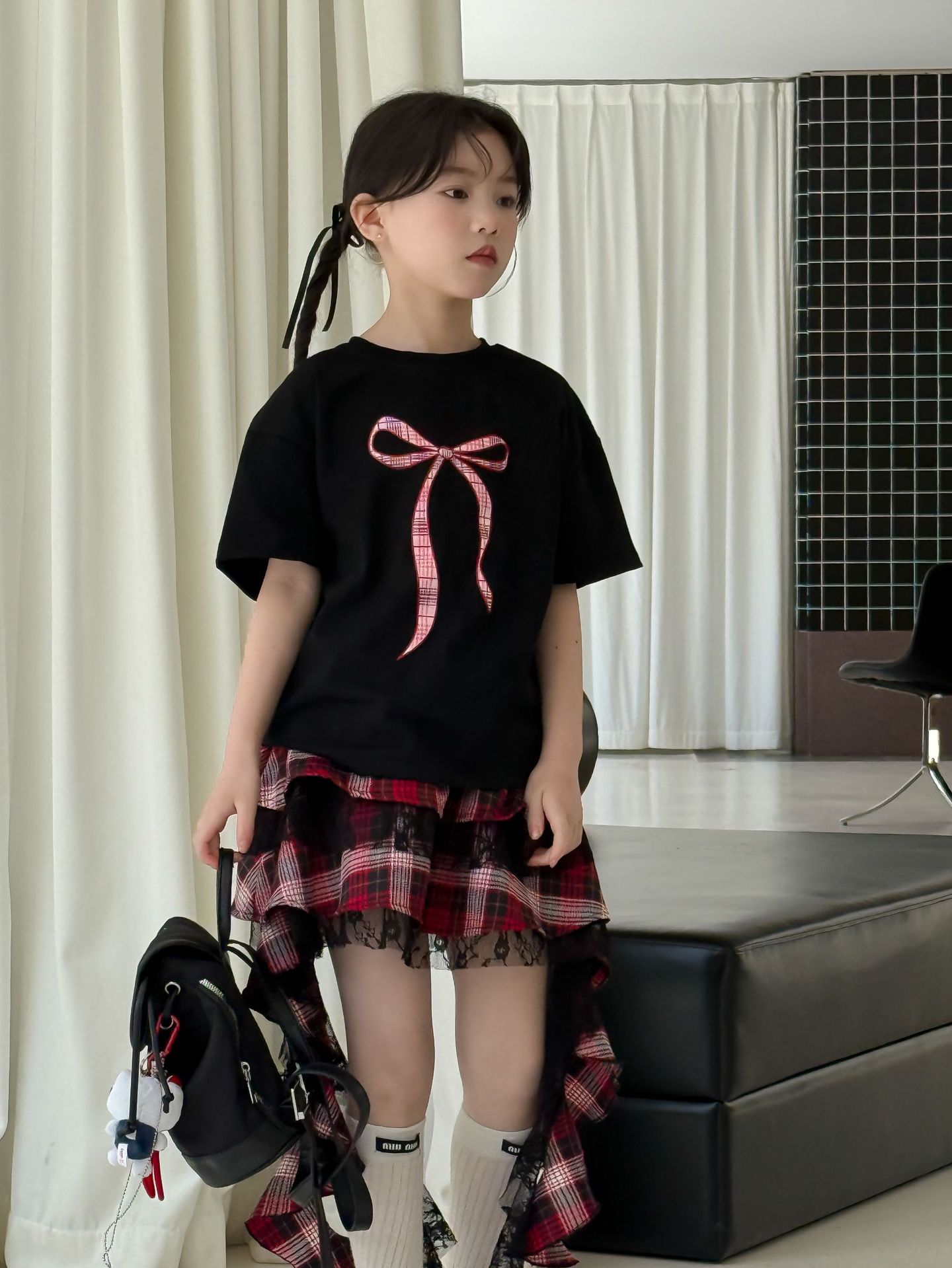 어린이 치마 2025 여름 새로운 소녀 디자인 센스 레드 체크 무늬 주름 케이크 스커트 소녀의 세련된 레이스 스커트