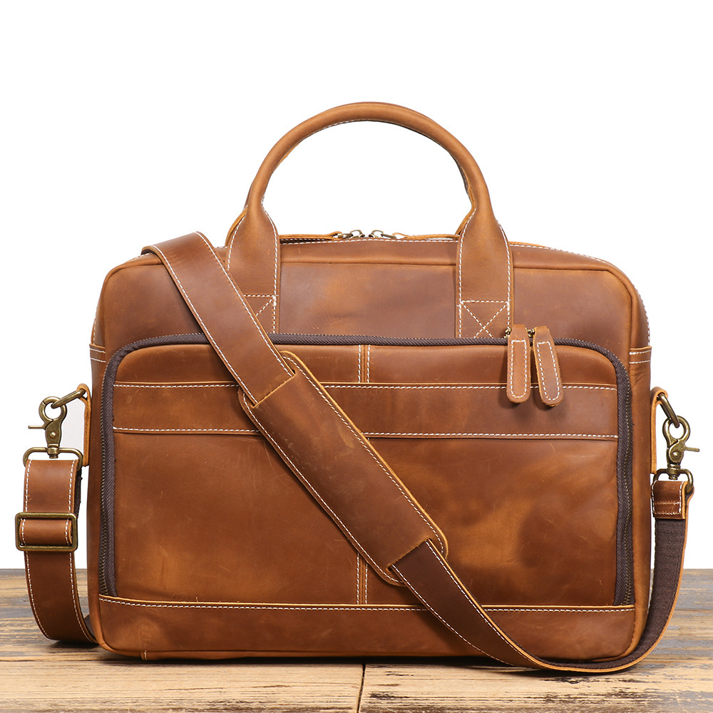 국경 간 인기 비즈니스 통근 휴대용 정품 가죽 컴퓨터 가방 Crazy Horse 가죽 싱글 숄더 1층 소가죽 대용량 서류 가방스토어 가기