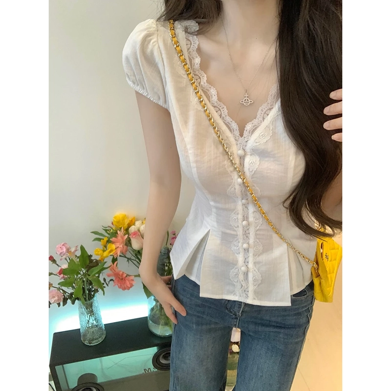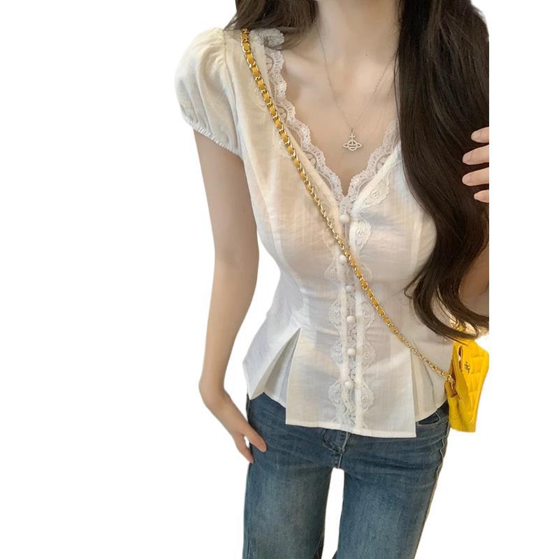 프랑스 레이스 V 넥 반팔 셔츠 여성의 여름 새로운 디자인 센스 타이트 허리 슬리밍 퍼프 슬리밍 탑