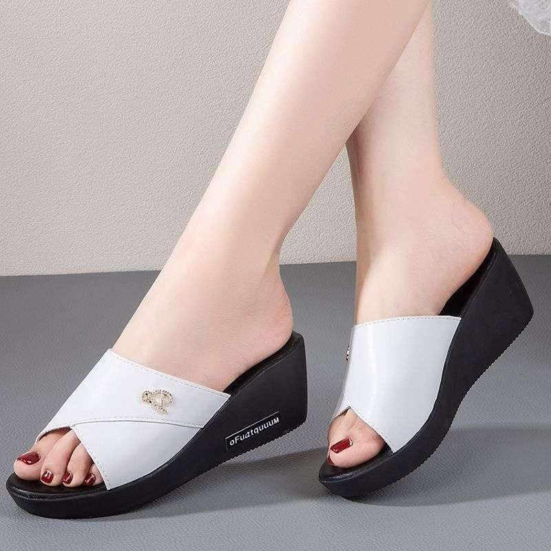 여성을위한 진짜 부드러운 가죽 슬리퍼 2025 여름 새로운 다목적 두꺼운 밑창 플랫폼 슬리퍼 겉옷을위한 미끄럼 방지 슬리퍼