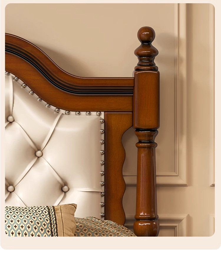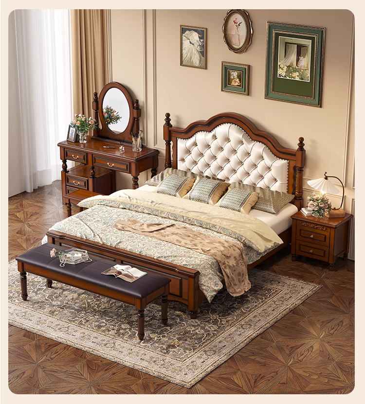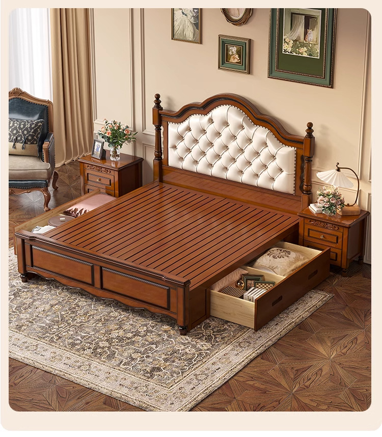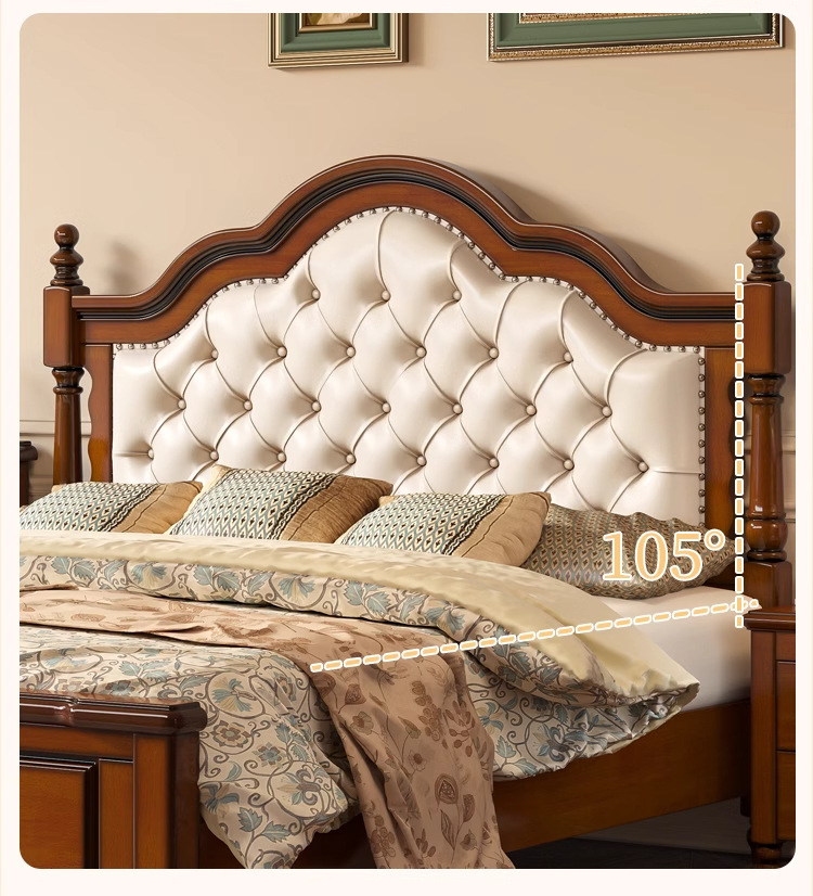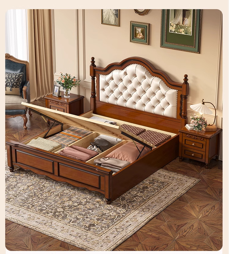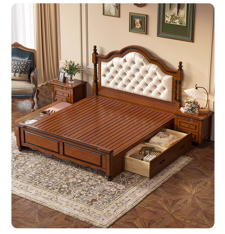 아메리칸 라이트 럭셔리 원목 침대, 마스터 침실, 고급스럽고 분위기 있는 복고풍 더블 침대, 모던하고 심플한 가죽 부드러운 등받이 수납 웨딩 침대