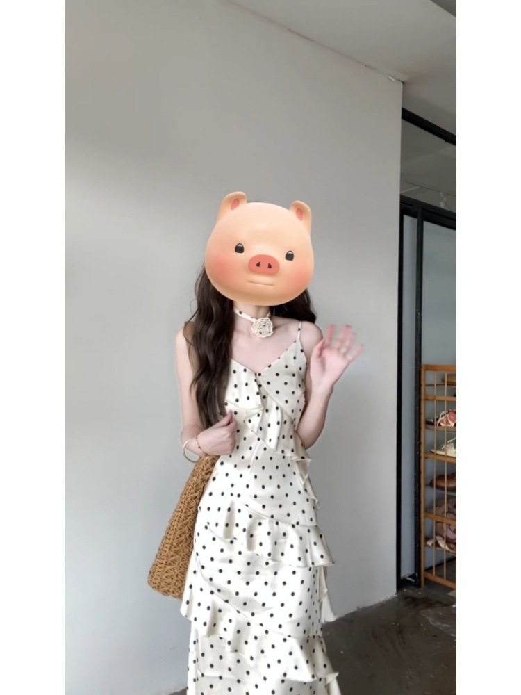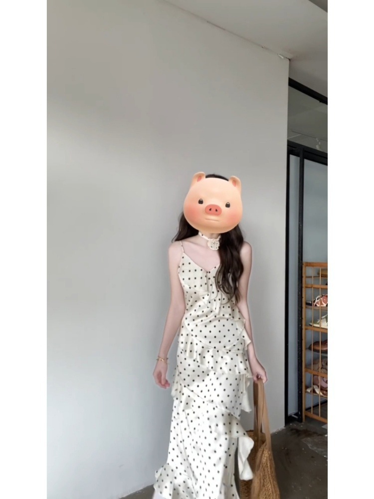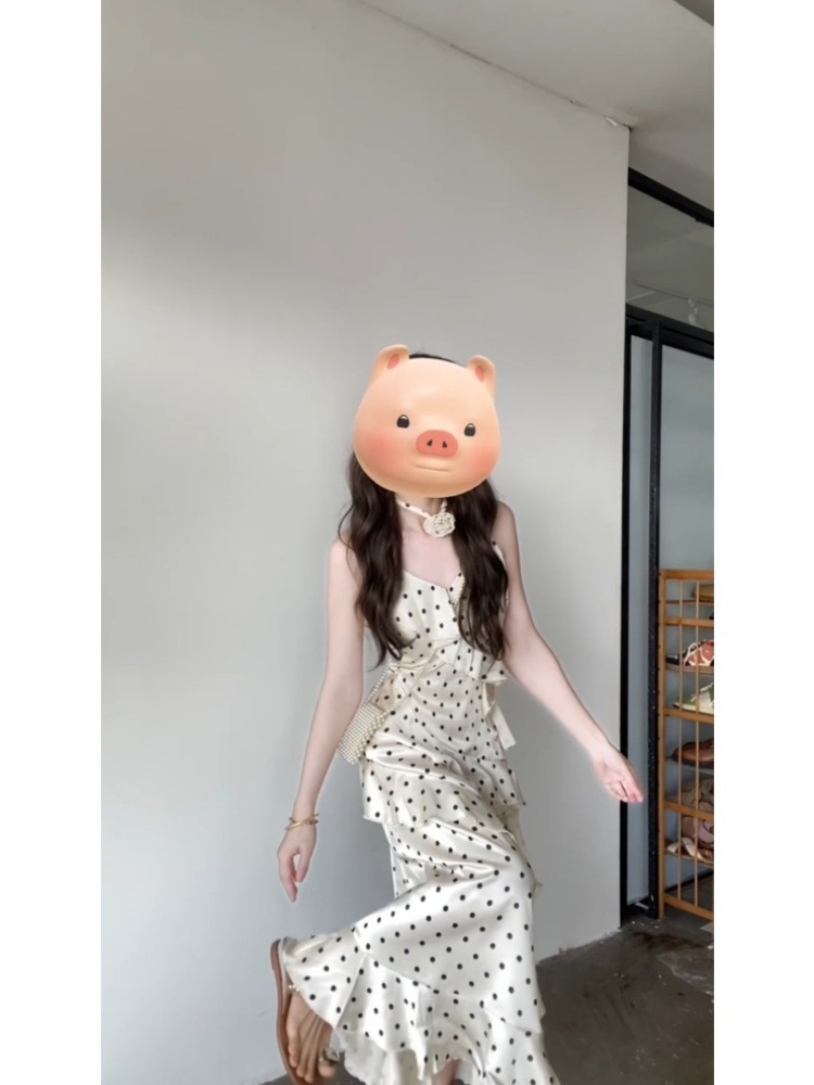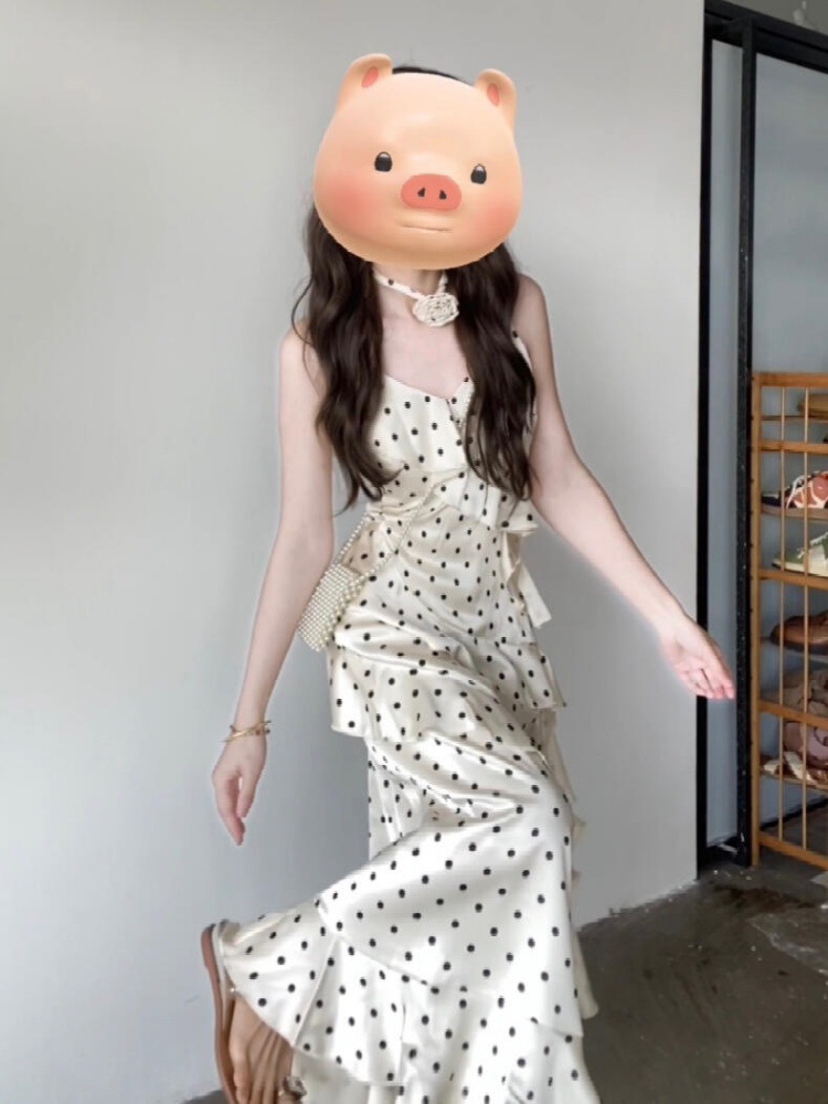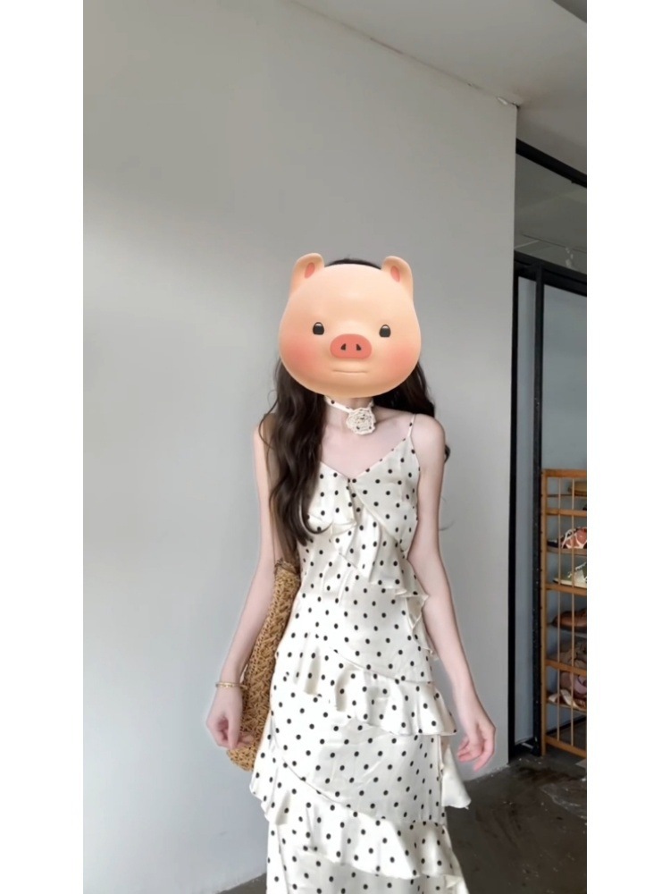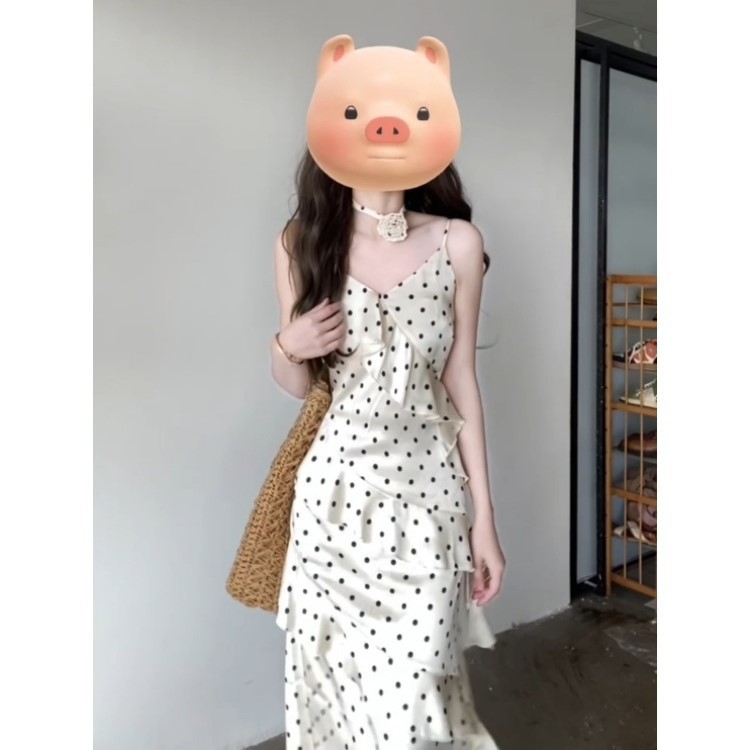 프랑스 스타일 순수한 욕망 웨이브 포인트 슬링 원피스 여성 여름 새로운 스타일 아름다운 주름진 허리 슬리밍 원피스 여성 트렌디스토어 가기