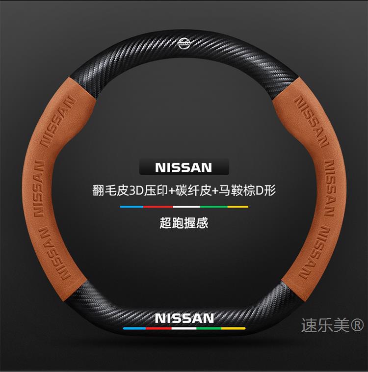 • 스웨이드 3D 양각 탄소 섬유 가죽 안장 브라운 D자형 닛산 로고