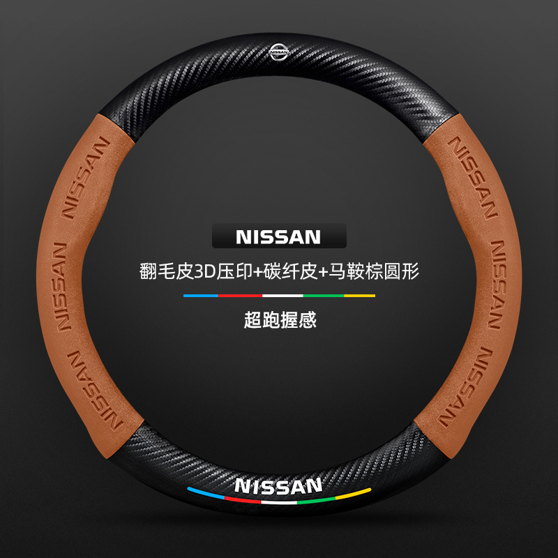 • 스웨이드 3D 양각 탄소 섬유 가죽 안장 브라운 라운드 닛산 로고