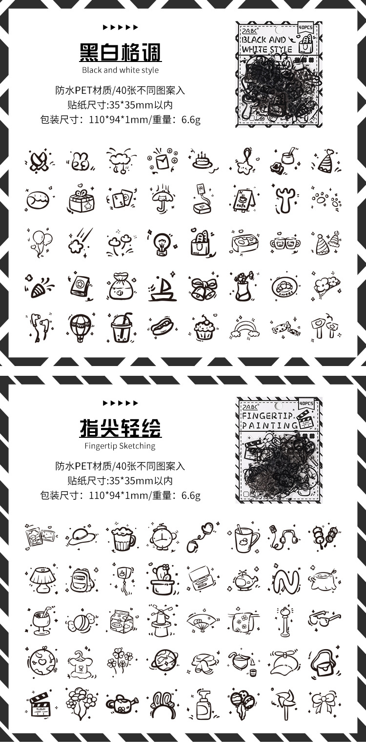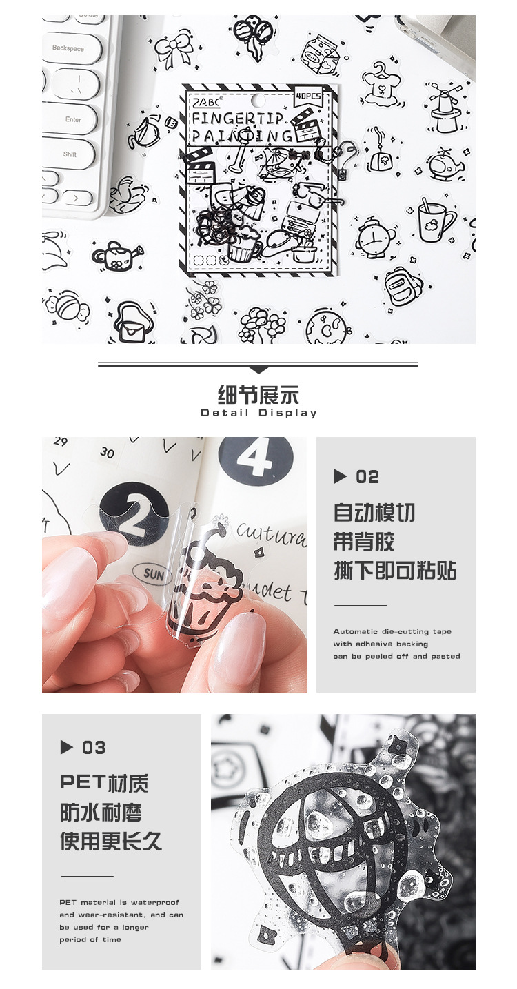 흑백 간단한 그림 방수 투명 애완 동물 스티커 팩 diy 핸드북 일기 스티커 흑백 요소 만화 생활 종이