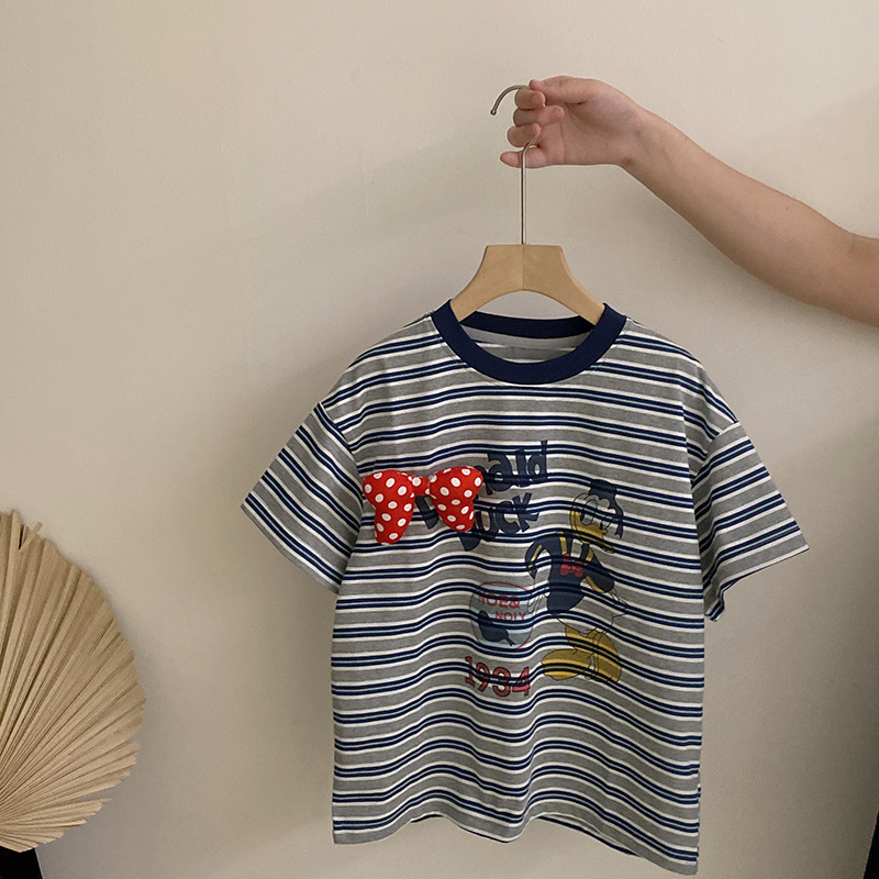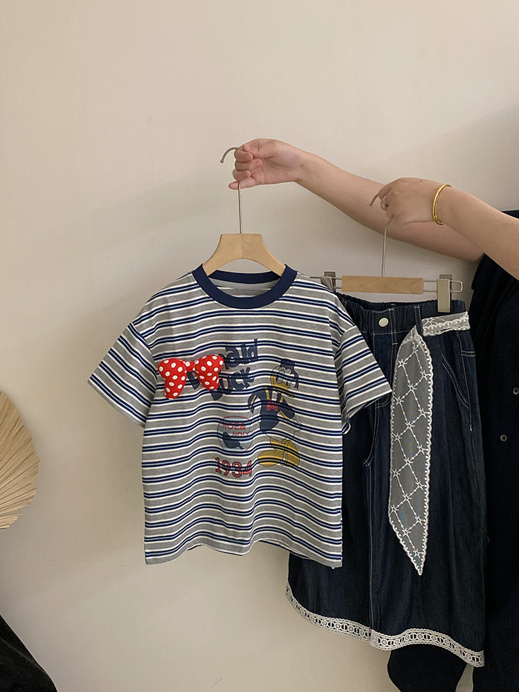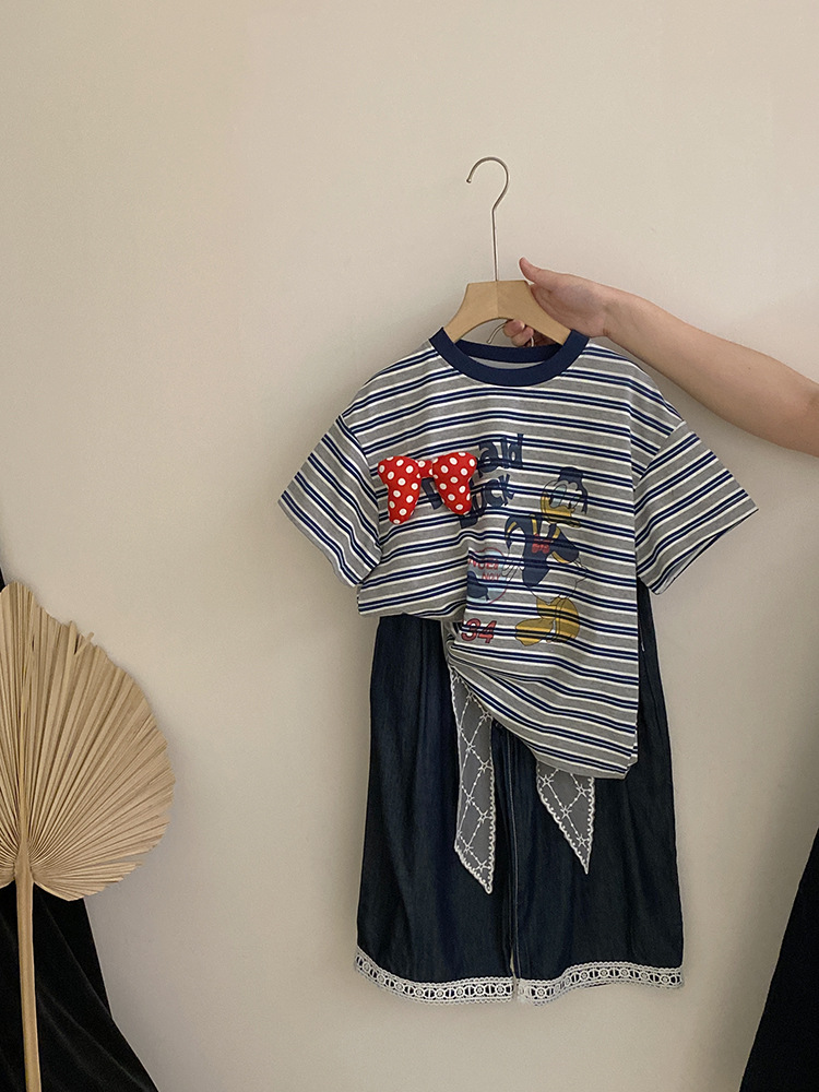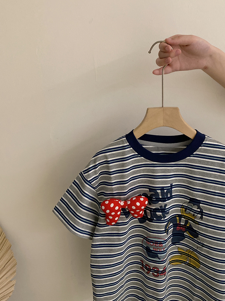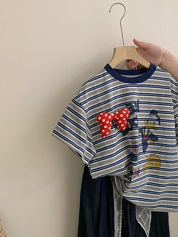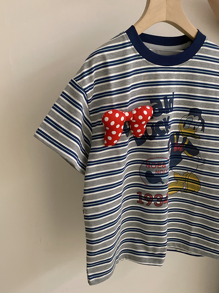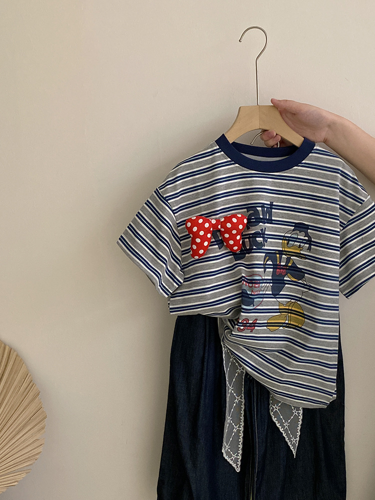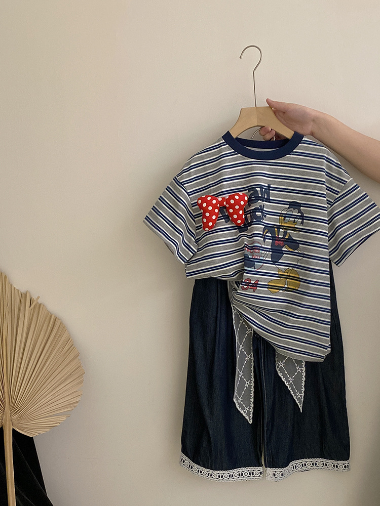 여자 여름 2025 새로운 만화 프린트 보우 스트라이프 반팔 탑 다목적 리본 와이드 레그 캐주얼 바지스토어 가기