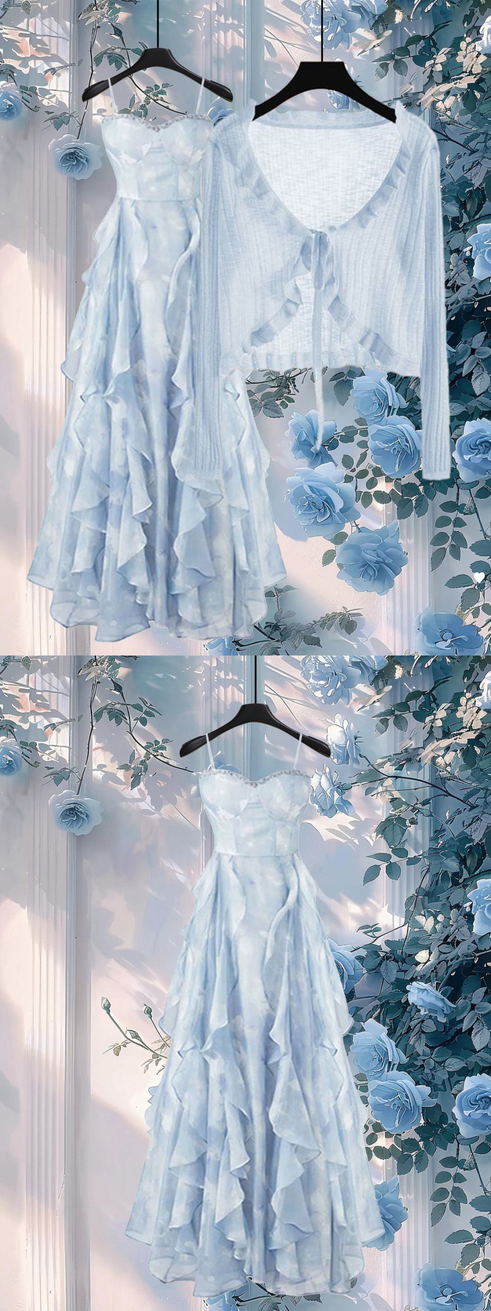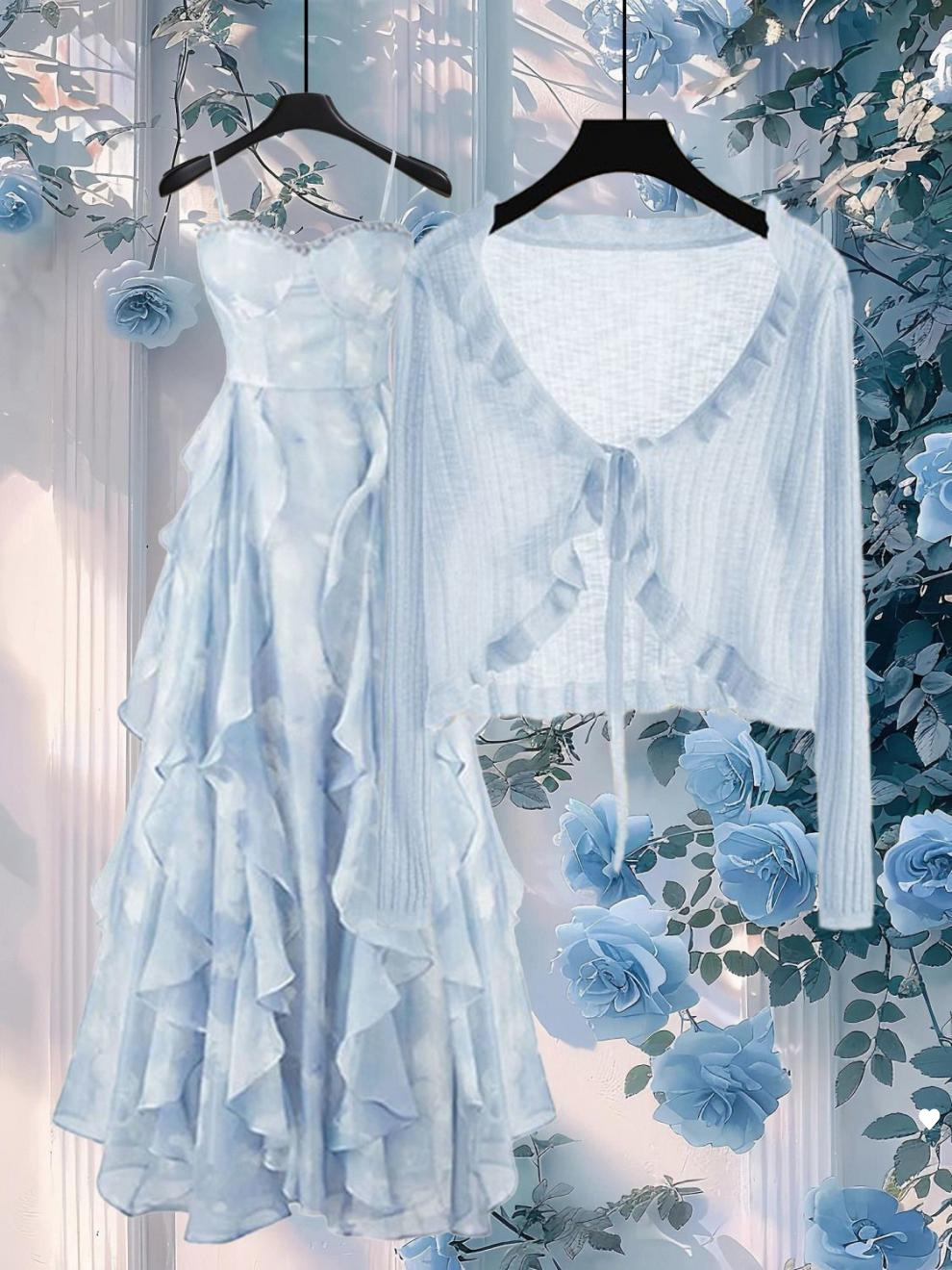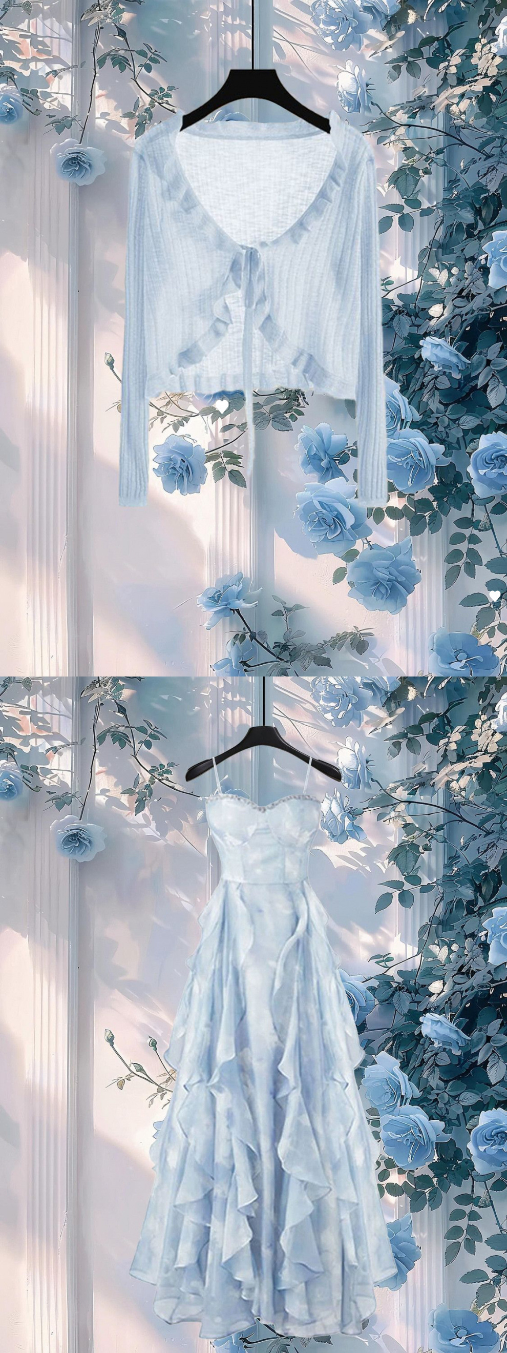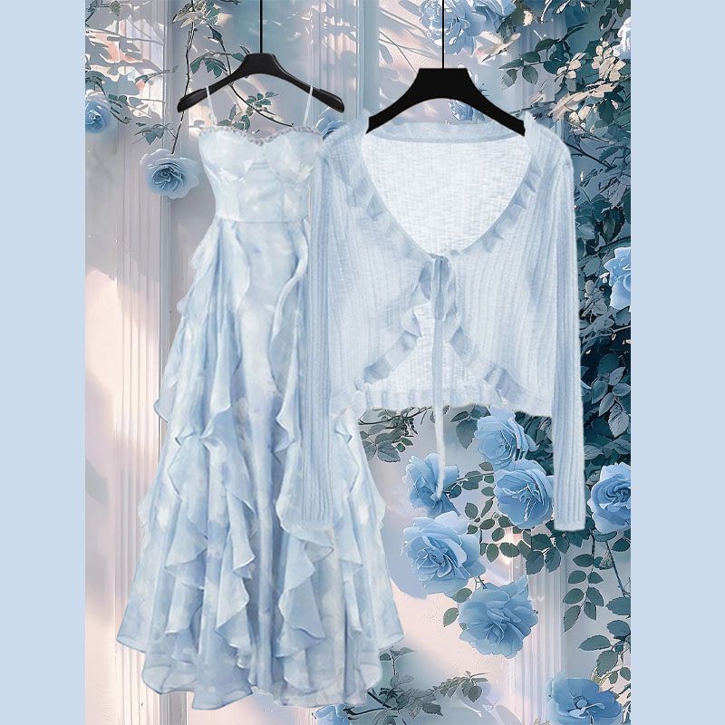 • 블루 아이스 실크 탑 + 블루 서스펜더 스커트 투피스 세트