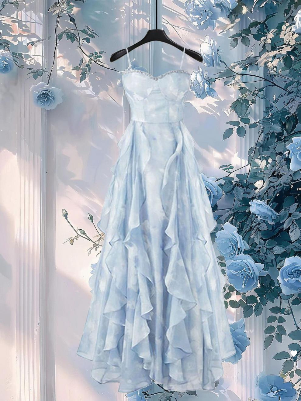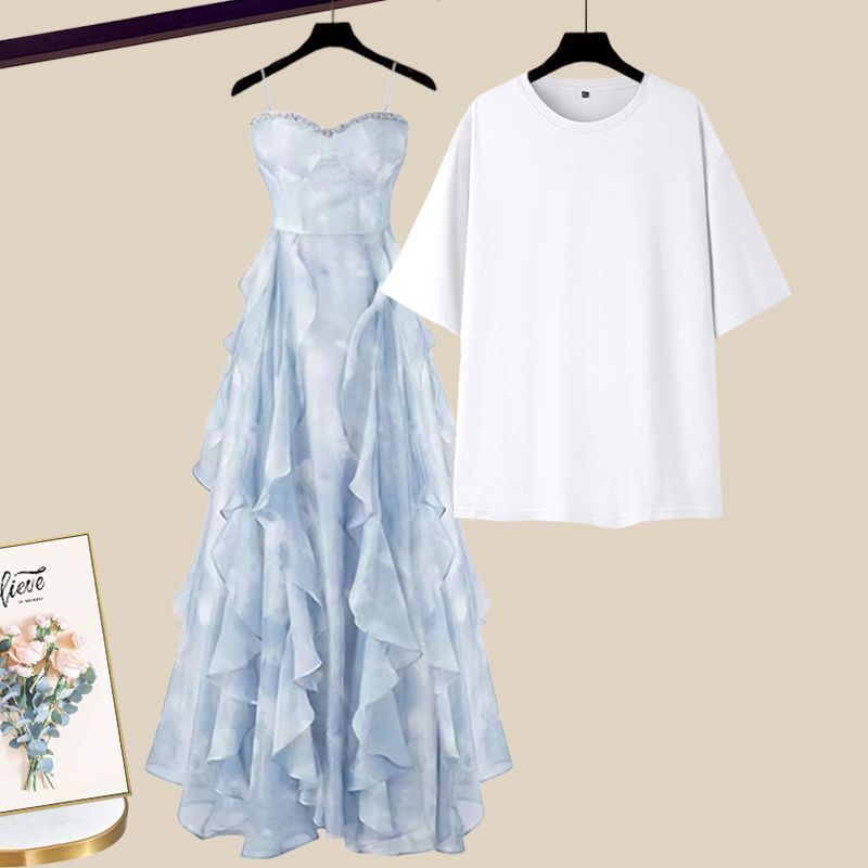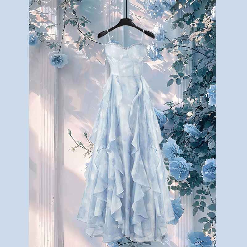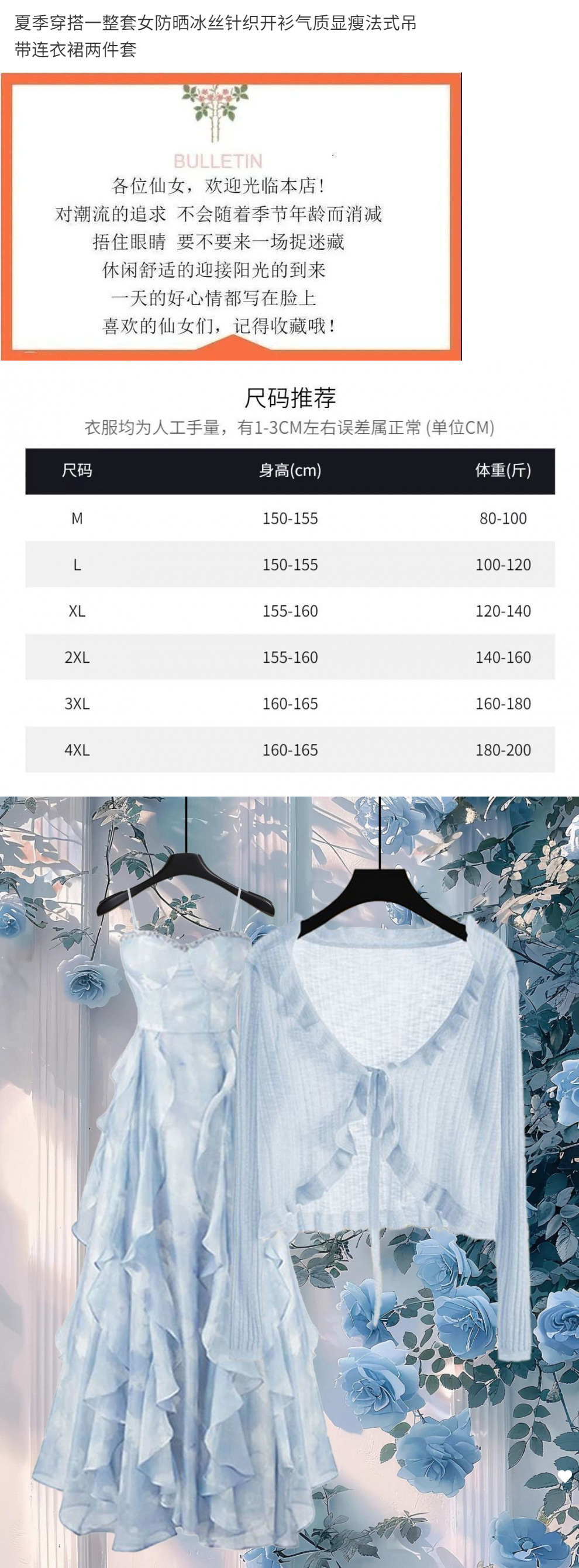 • 블루 아이스 실크 탑 + 블루 서스펜더 스커트 투피스 세트