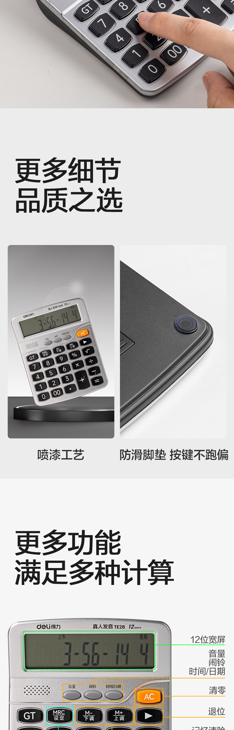 델리 TE28 음성 계산기 AA 배터리 12비트 와이드스크린 디지털 디스플레이 실시간 음성 방송 가벼운 버튼