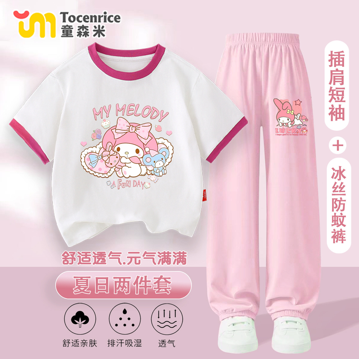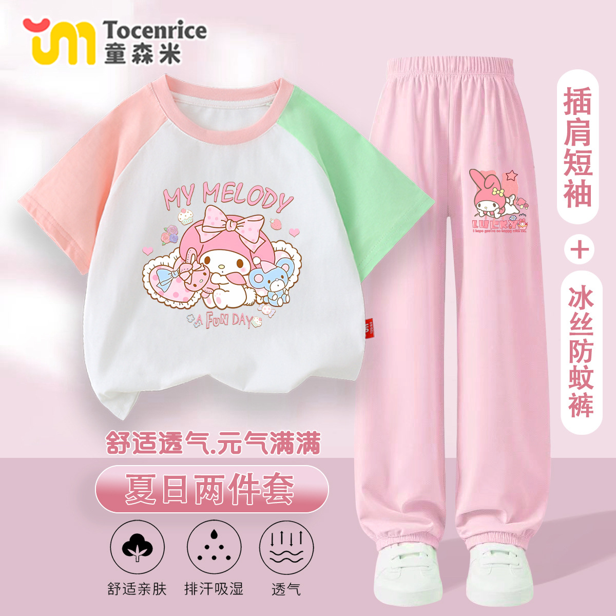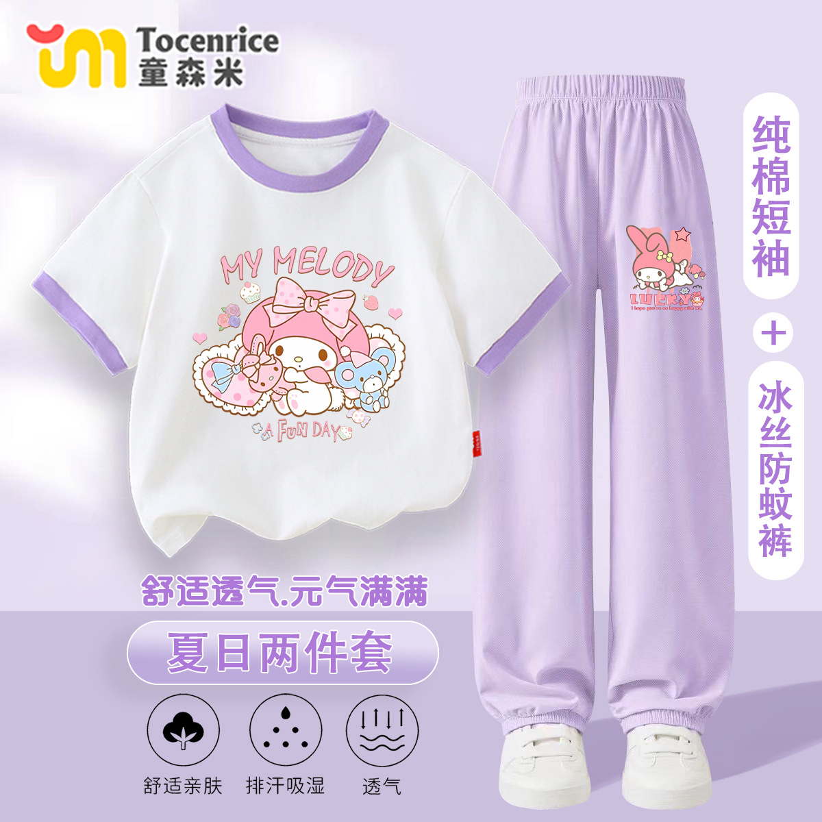 Kuromi Melody Girls 여름 정장 2025 새로운 중대형 어린이 반팔 모기 방지 바지 시원한 스포츠웨어 트렌드스토어 가기