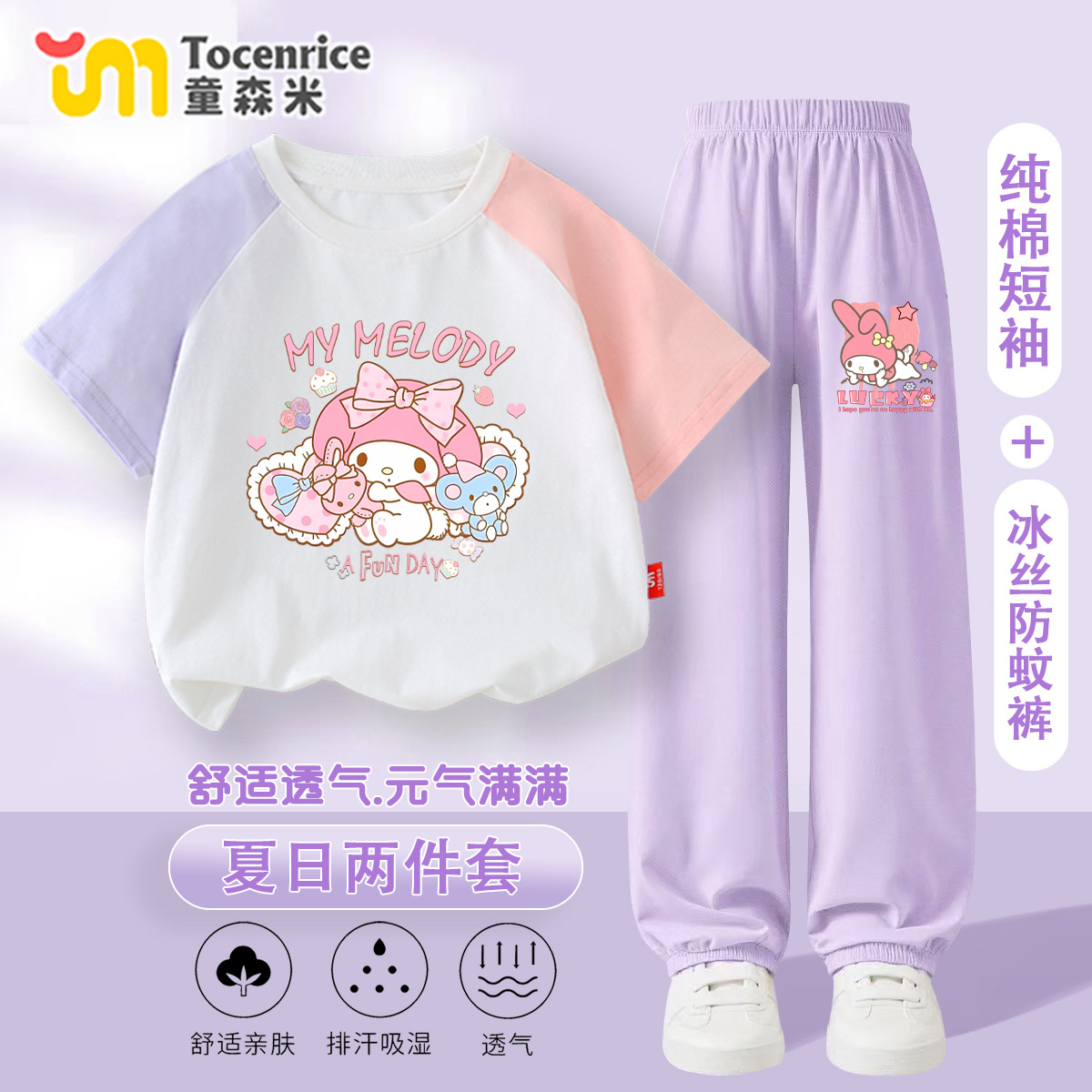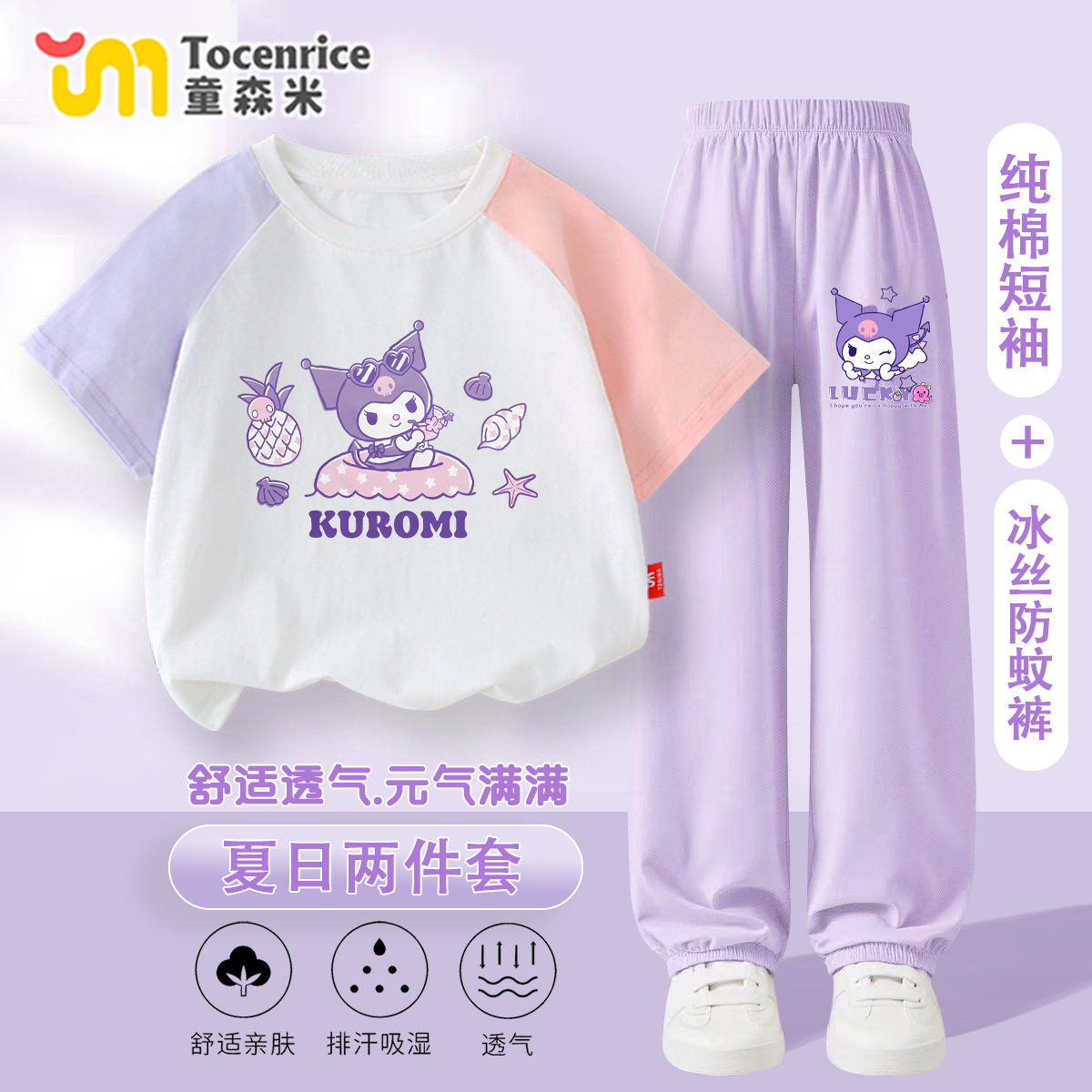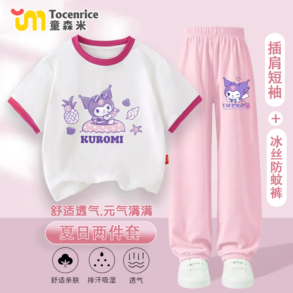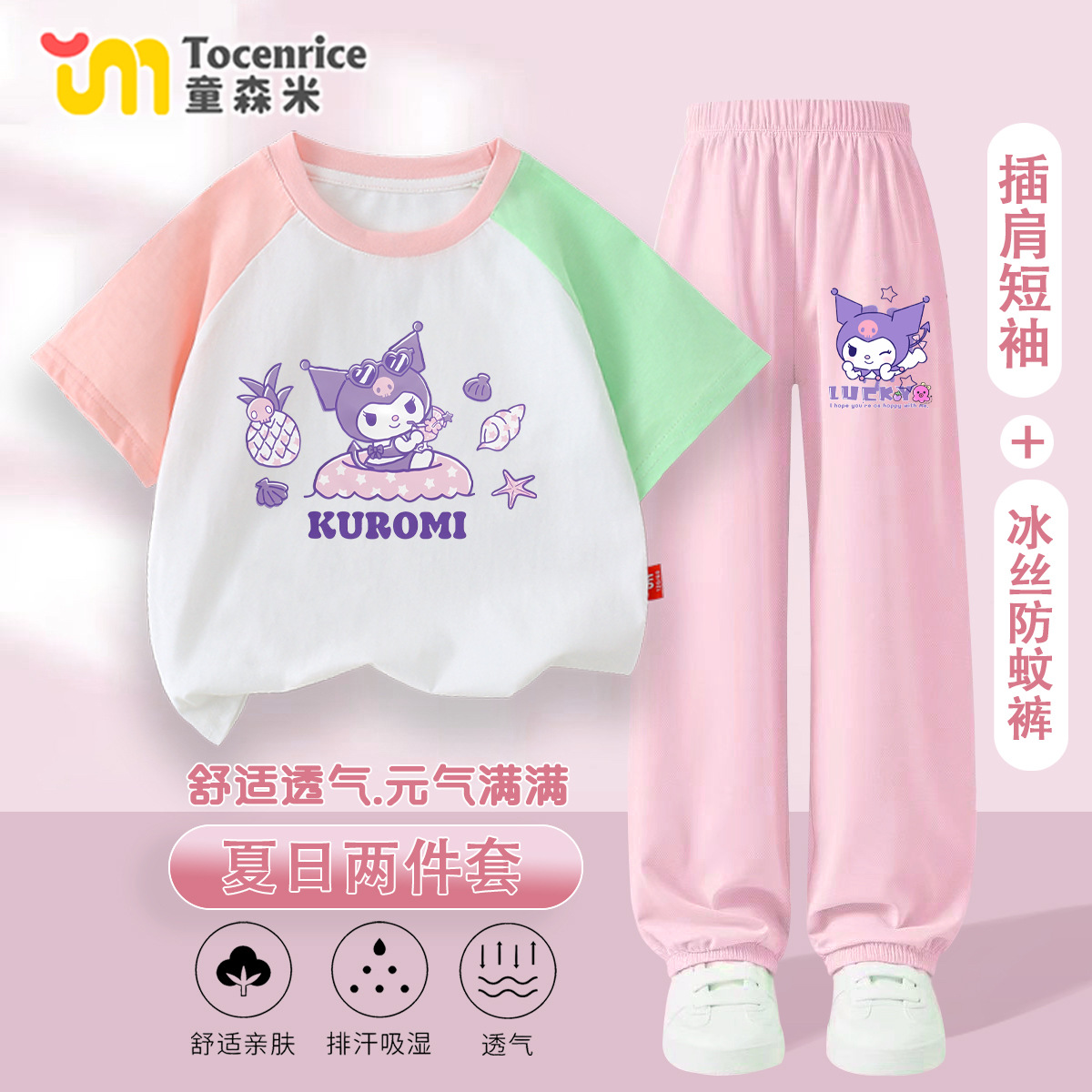 Kuromi Melody Girls 여름 정장 2025 새로운 중대형 어린이 반팔 모기 방지 바지 시원한 스포츠웨어 트렌드