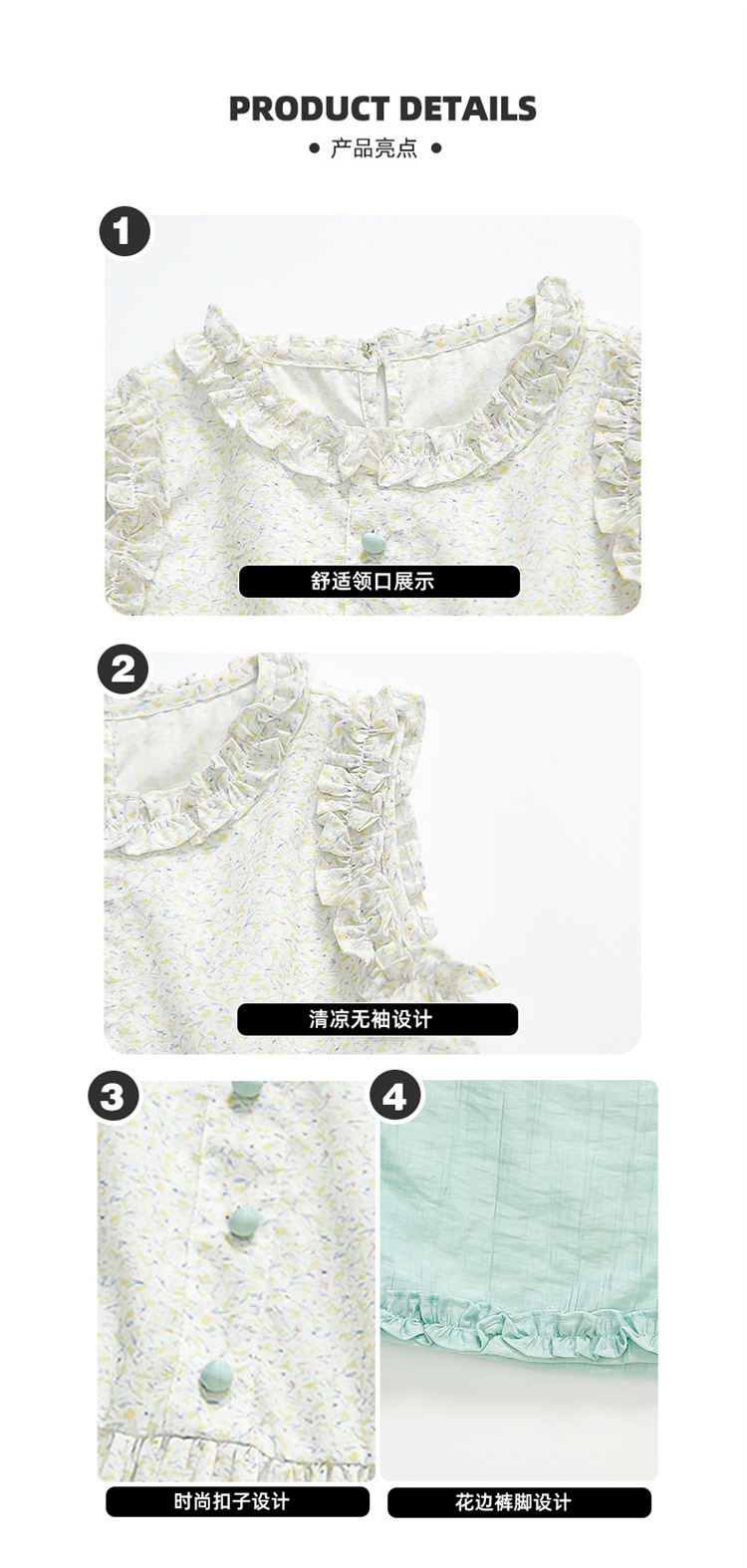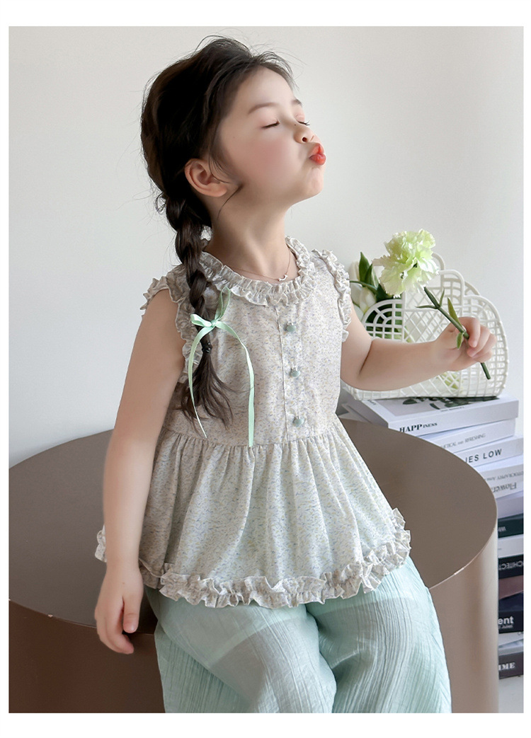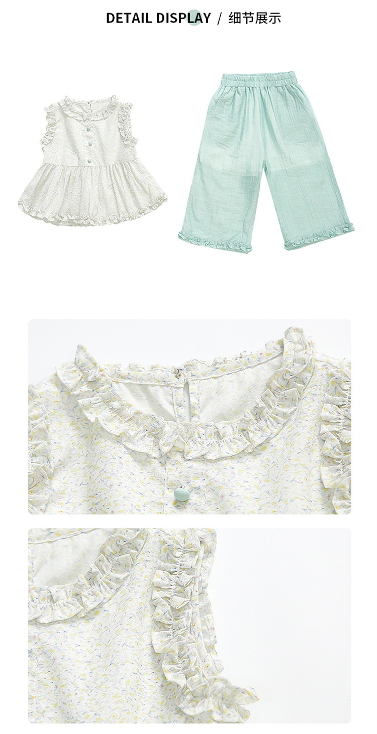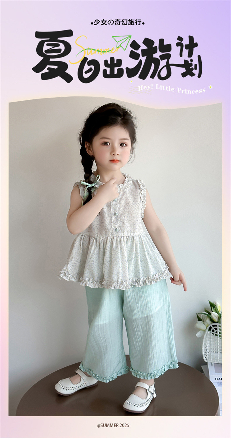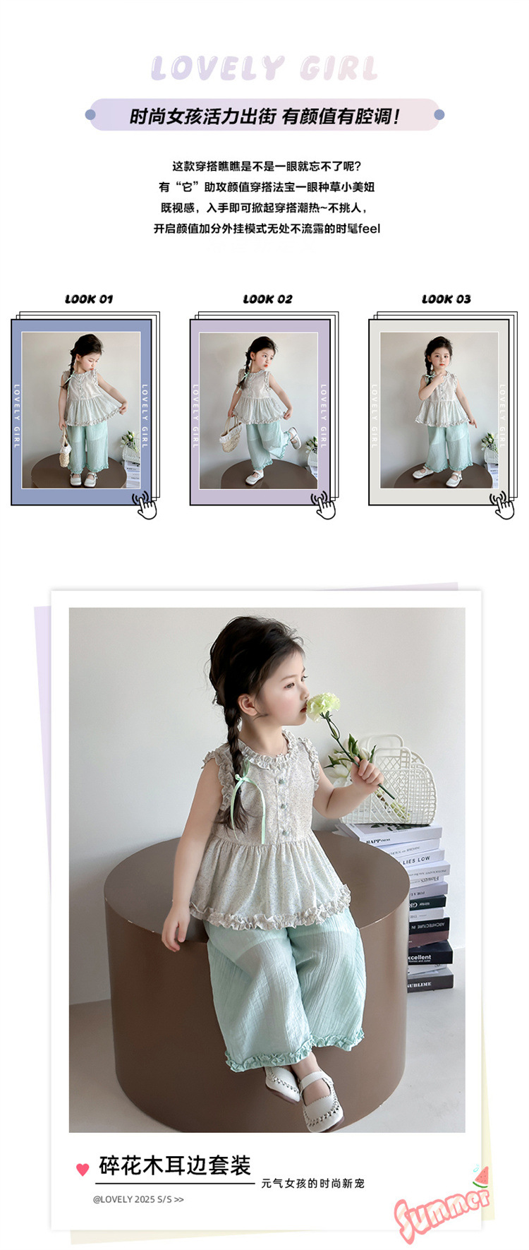 소녀의 꽃 귀 가장자리 세트 2025 여름 새로운 패션 소녀의 세련된 투피스 세트 어린이 여름 원피스스토어 가기