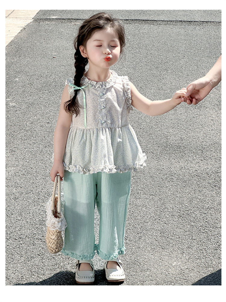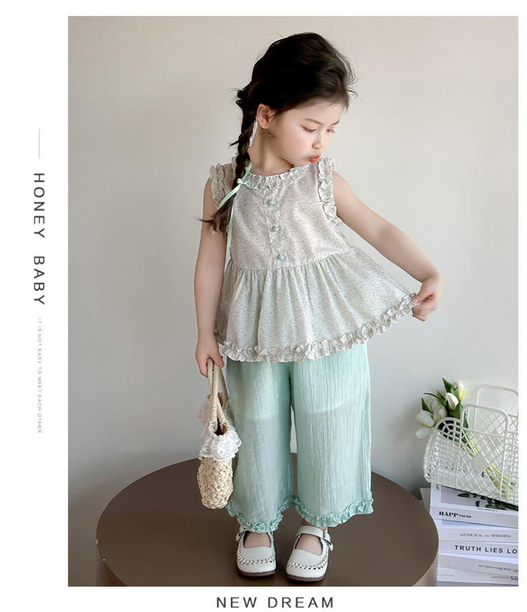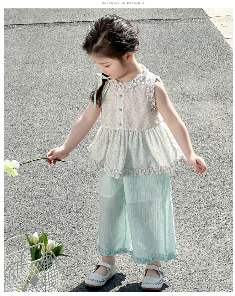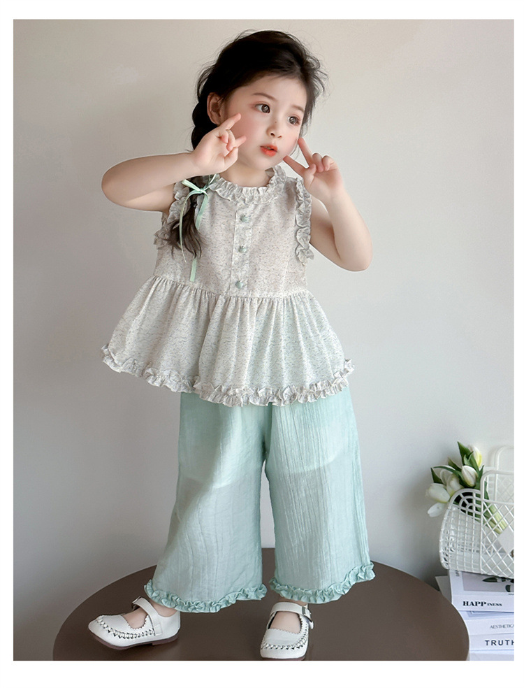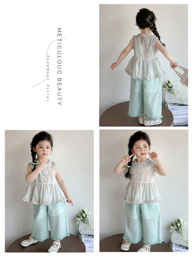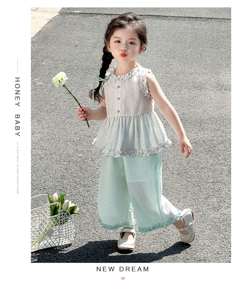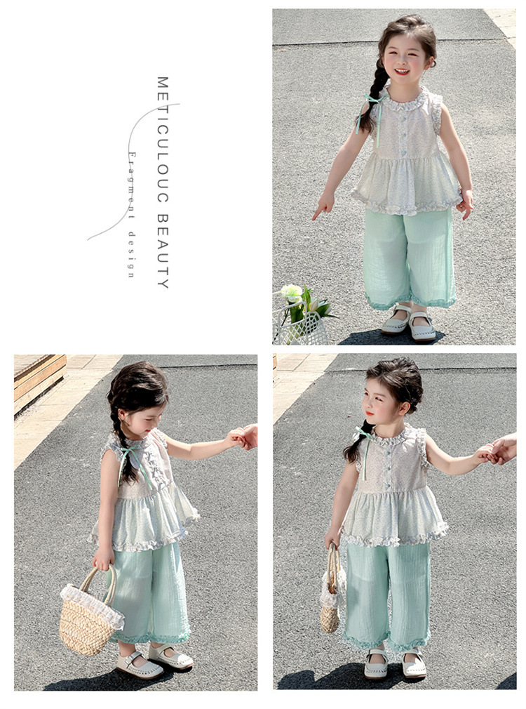 소녀의 꽃 귀 가장자리 세트 2025 여름 새로운 패션 소녀의 세련된 투피스 세트 어린이 여름 원피스스토어 가기